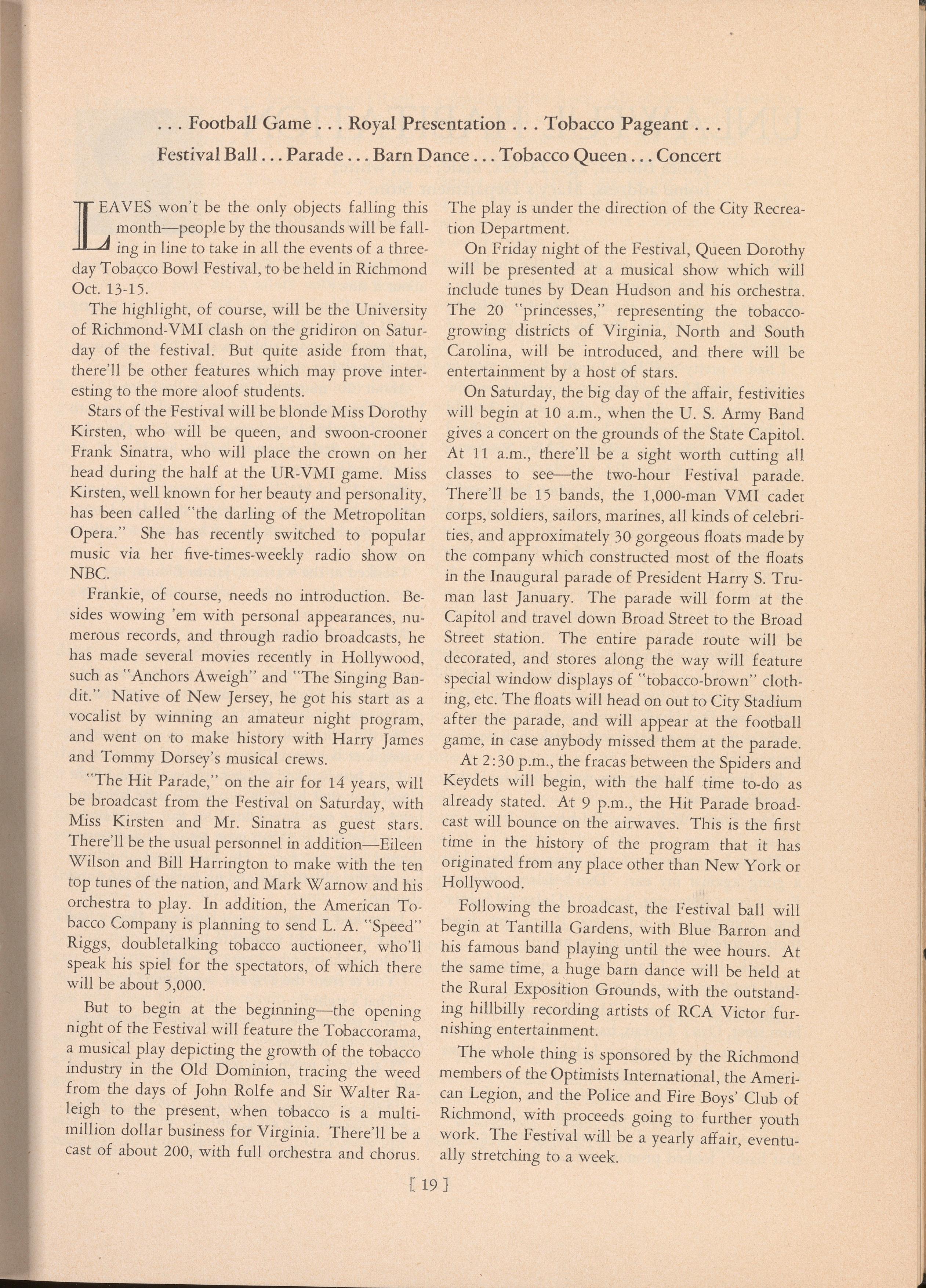 Not having played Richmond since 1942, North Carolina State will be attempting to hold the Spiders to their record of only one tie and no wins in ten games, when the two teams meet in Raleigh on November 5th. The Wolfpack will have stalwarts with them such as Bill Thompson, Ed Mooney, and the holder of the Jacobs Blocking Trophy of the conference, Bob Bowlby.