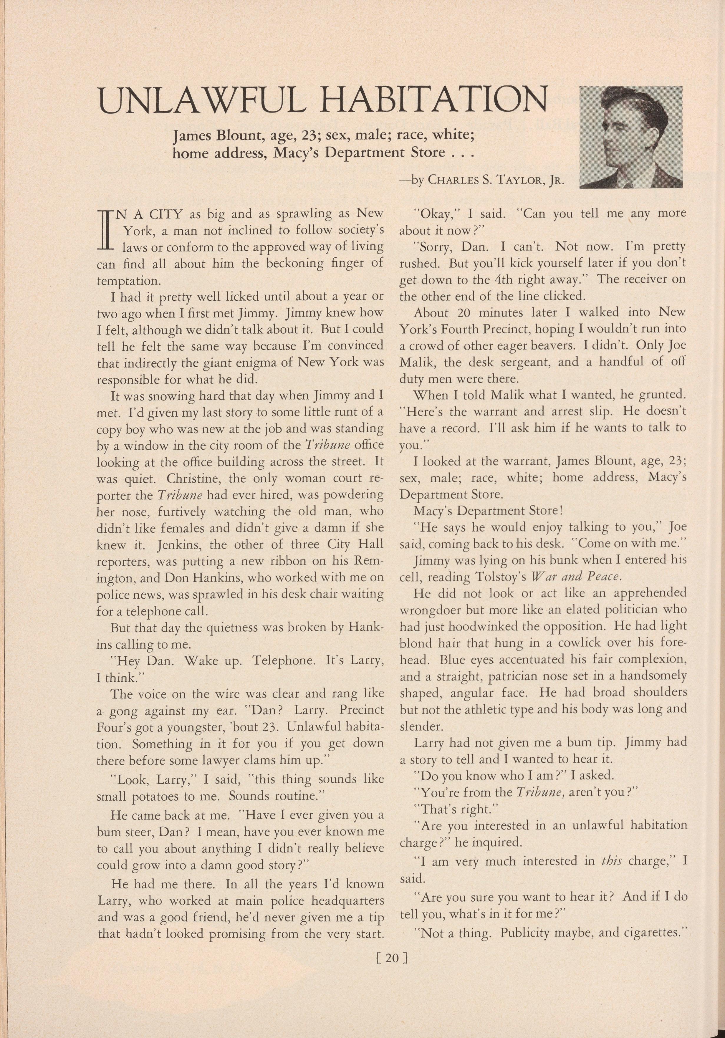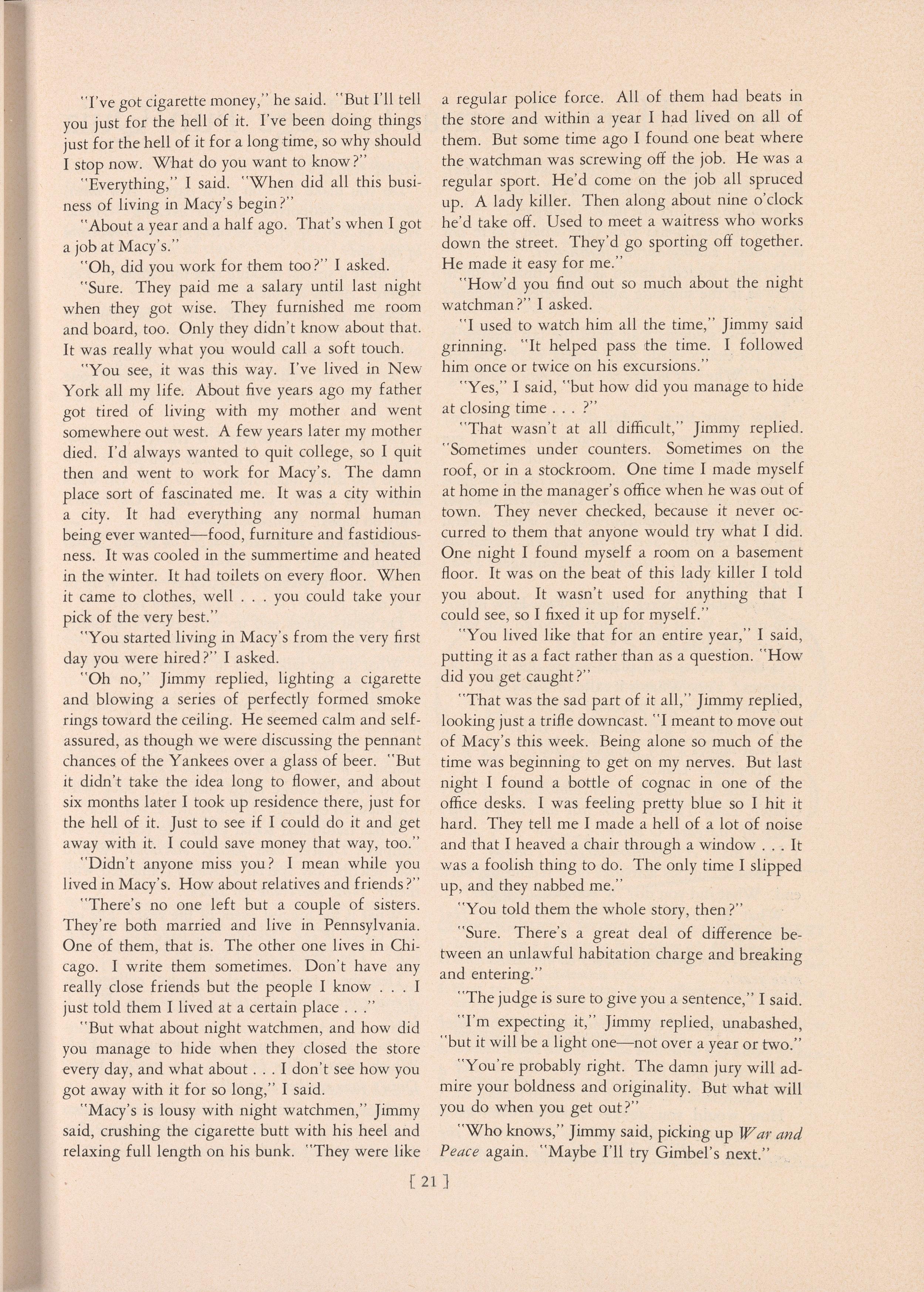 "That was the sad part of it all," Jimmy replied, looking just a trifle downcast. "I meant to move out of Macy's this week. Being alone so much of the time was beginning to get on my nerves. But last night I found a bottle of cognac in one of the office desks. I was feeling pretty blue so I hit it hard. They tell me I made a hell of a lot of noise and that I heaved a chair through a window ... It was a foolish thing to do. The only time I slipped up, and they nabbed me."