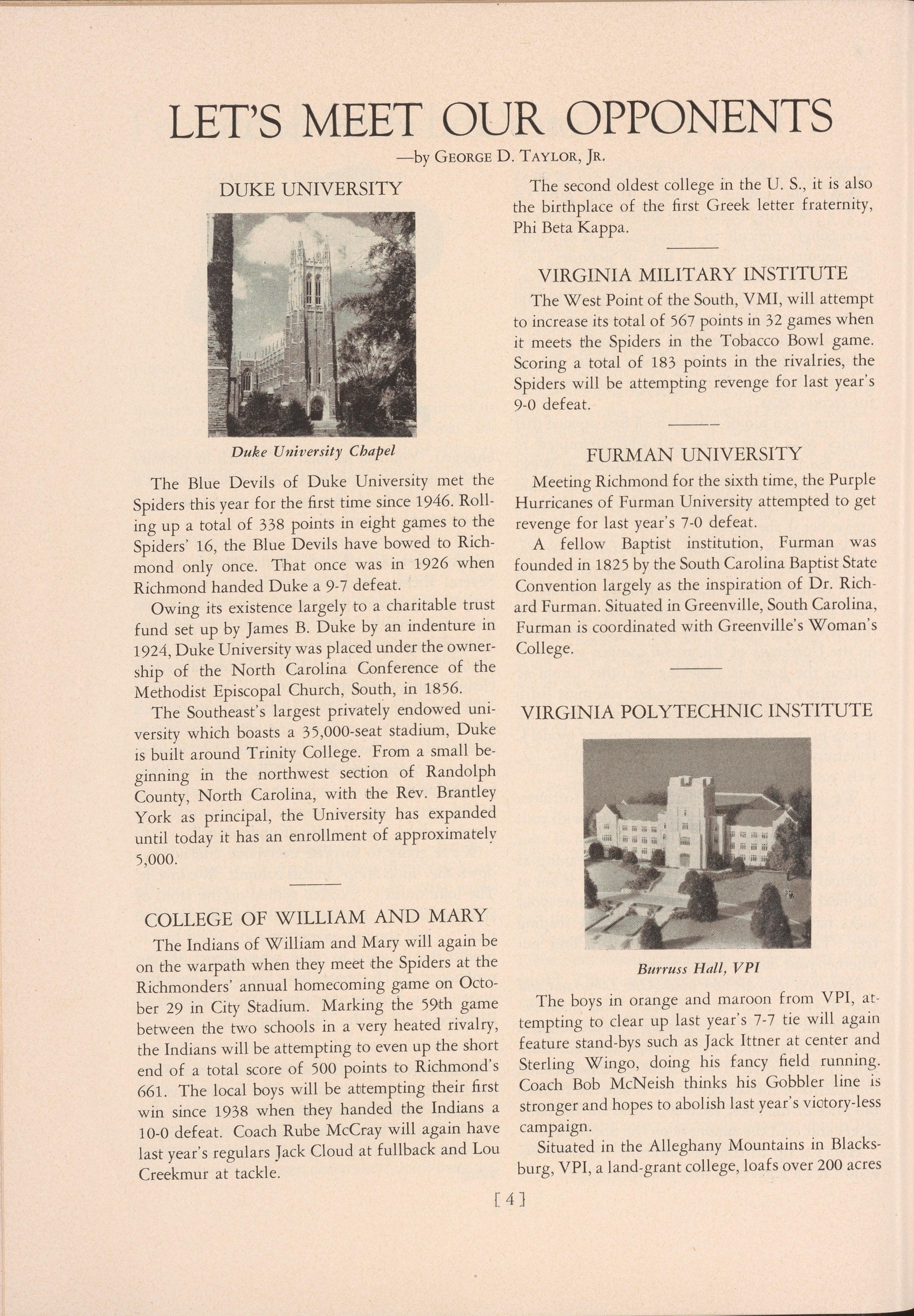Our old stand-by , George Taylor, has had his hands full collecting and organizing " Let's Meet Our Opponents, " an article on our football foes. Maybe we should keep quiet after that DukeRichmond game