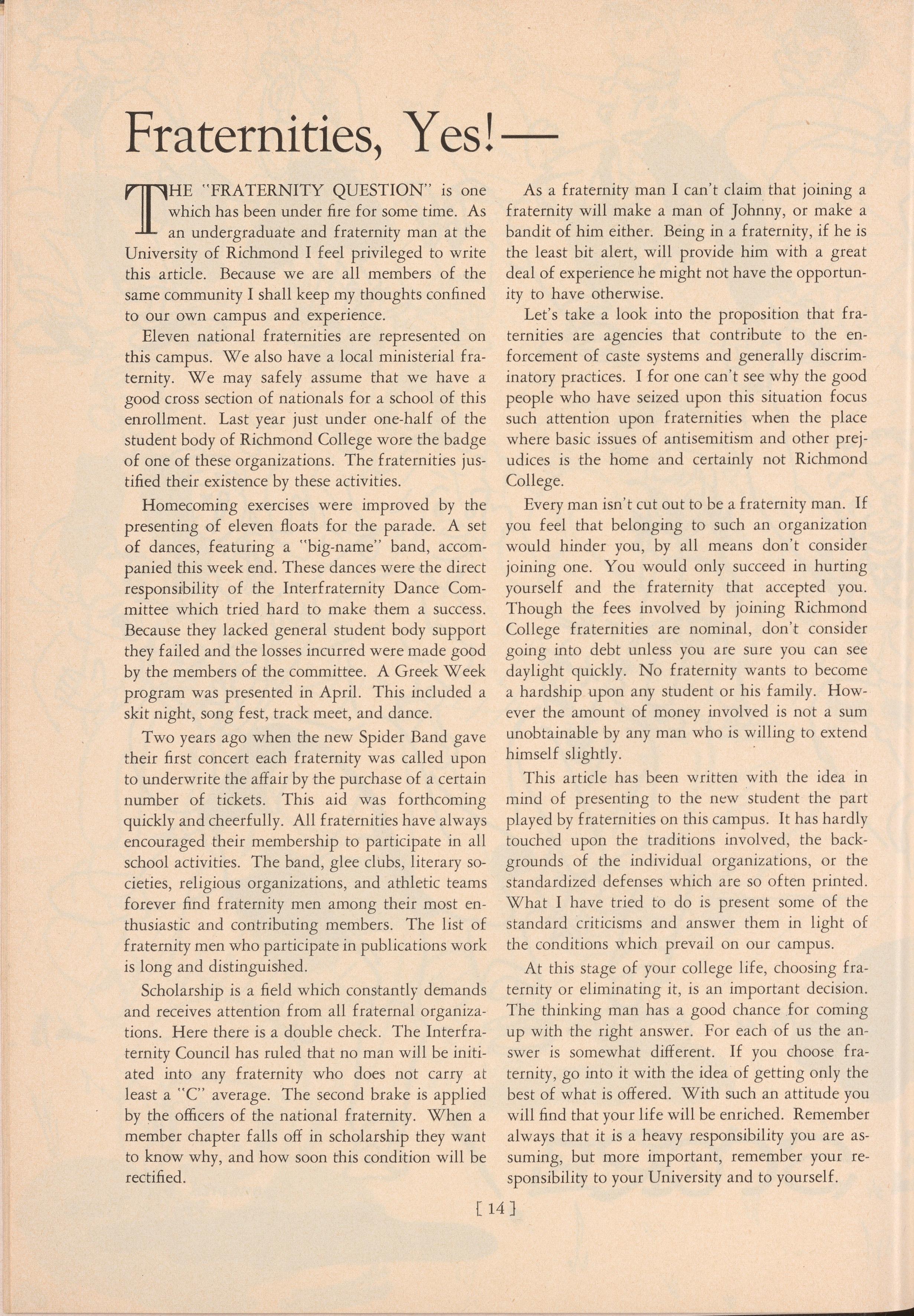 The fraternity article was written by two outstanding Richmond College men and does not necessarily represent the opinion of any fraternity or group of nonfraternity men on our campus It is merely ,the opinions of two students on the subject of fraternities. We hope it will be an aid to all new students on our campus