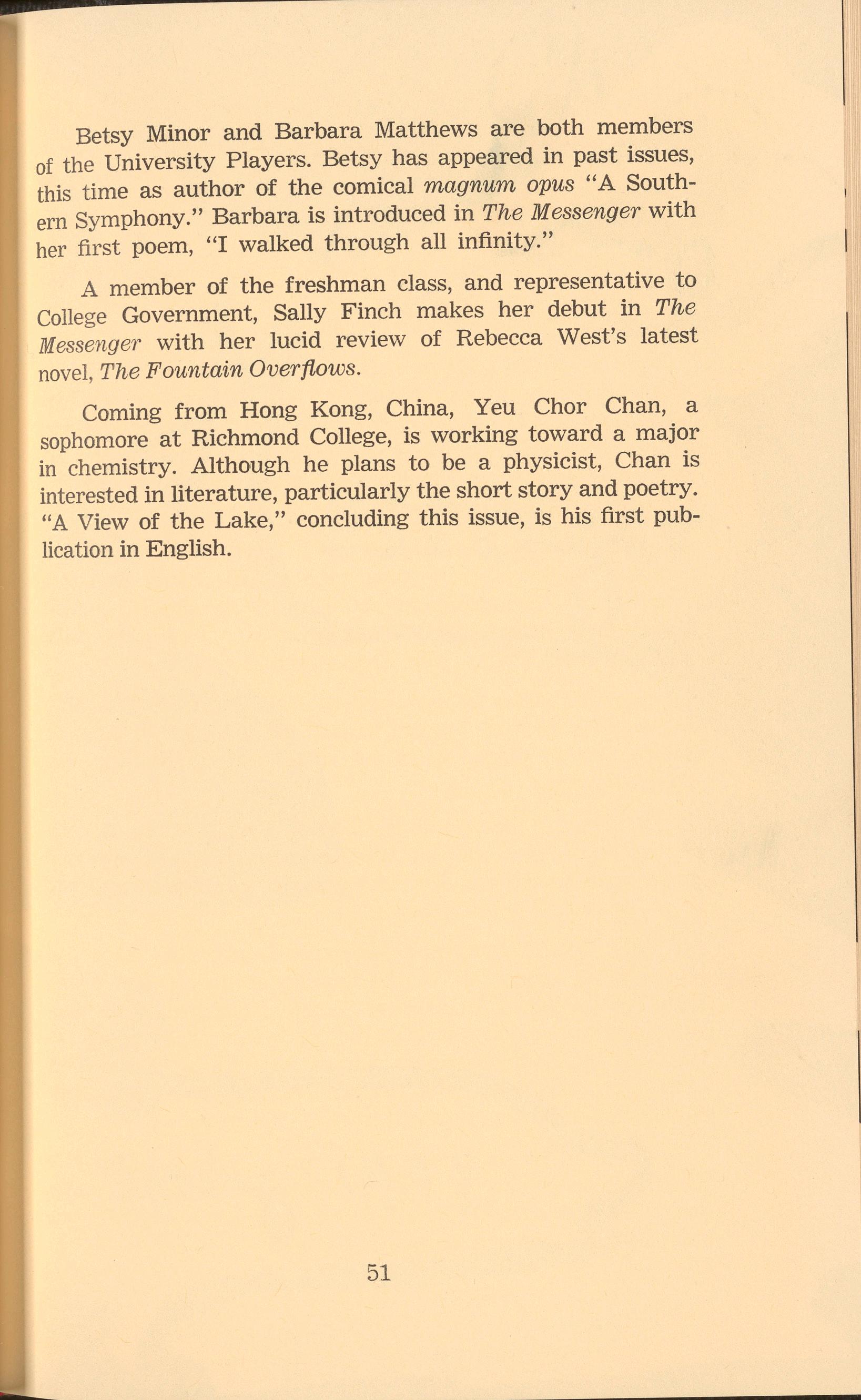 Coming from Hong Kong, China, Yeu Chor Chan, a sophomore at Richmond College, is working toward a major in chemistry. Although he plans to be a physicist, Chan is interested in literature, particularly the short story and poetry. "A View of the Lake," concluding this issue, is his first publication in English.