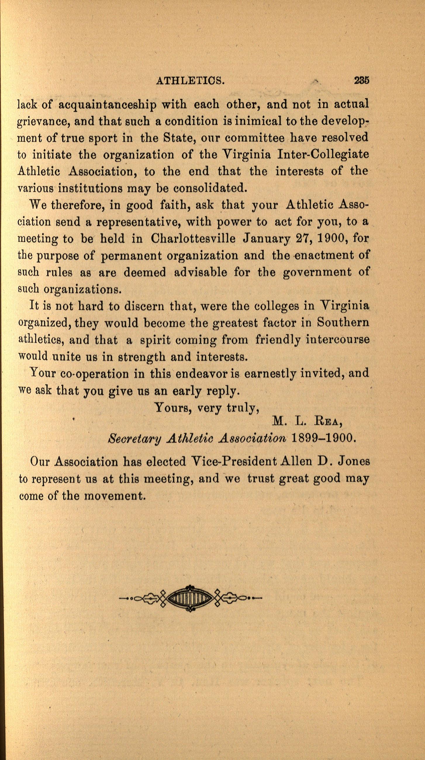 We therefore, in good faith, ask that your Athletic Association send a representative, with power to act for you, to a meeting to be held in Charlottesville January 27, 1900, for the purpose of permanent organization and the -enactment of such rules as are deemed advisable for the government of such organizations.