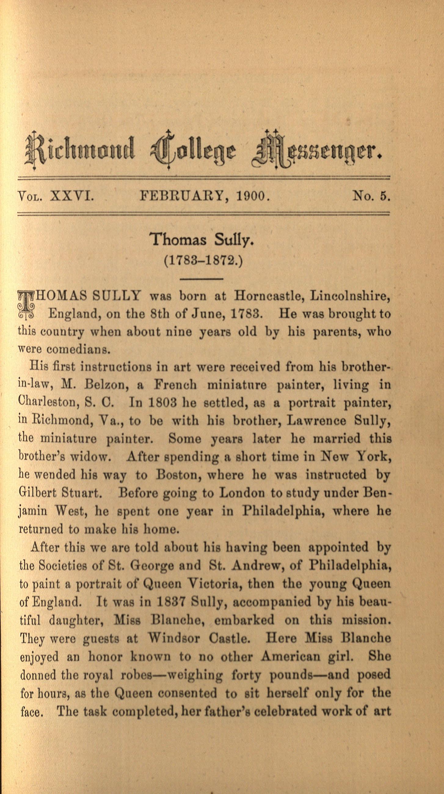 His most celebrated historical picture is '' Washington Crossing the Delaware," now at the Boston Museum. Among his other works you will find portraits of Commodore Decatur, Thomas Jefferson, George Fred. Cook (as "Richard III."), Charles Kemble, Frances Kimble, Rembrandt Peale, Lafayette, Reverdy Johnson, Charles Carroll, Dr. Benjamin Rush, "Girl Offering Flowers at a Shrine," " Woman R.tthe W e1l," "Isabel,"" Child and Dog." In the two decades, 1820-'40, he exhibited ten portraits at the Royal Academy. Richmond people are the fortunate possessors of many of Sally's portraits. Among them are those of Ool. John Mayo, of" Be11vi11e,"Henrico county, the builder of Mayo's Bridge; Abigail de Hart, wife of Colonel John Mayo; Mrs. H. Coalter Cabell, Mrs. James Bruce, Miss Susan Taliaferro, Captain Moody. Then, at the Virginia Ilistorical Society, there are-to omit others-the portraits of Edmund Pendleton, president of the Virginia Convention of 1775, and Patrick Henry. Of the latter the Sou,thern Literary .Messengm·, (May, 1851) says: "The distinguished artist, Thomas Sully, who bas been for many months past in our city, has just completed, for the rooms of the Virginia Historical Society, a copy of his original* portrait of Patrick Henry, which is indeed an admirable picture. The history of this portrait is somewhat curious, and, as we think it is not generally known, we give it as it has been narrated by James Web-The original i now owned by Hon. William Wirt Henry, of this city.