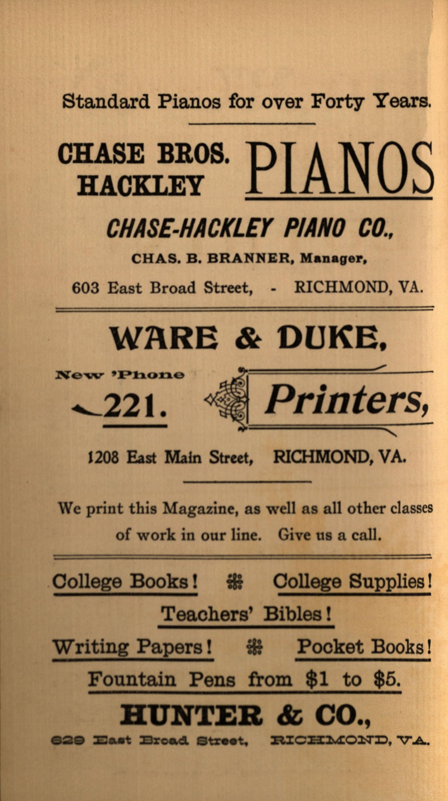 ~ubUsbers Teachers' Public School Registers o!Va. and Virginia g., School Journal; Warrock-Richardson Almana+, COLLEGE AND SCHOOL PRINTING A SPECIALTY. ESTIMATES CHEERFULLY GIVEN. No 7 :North Seventh Street, RICHMOND, VA,
