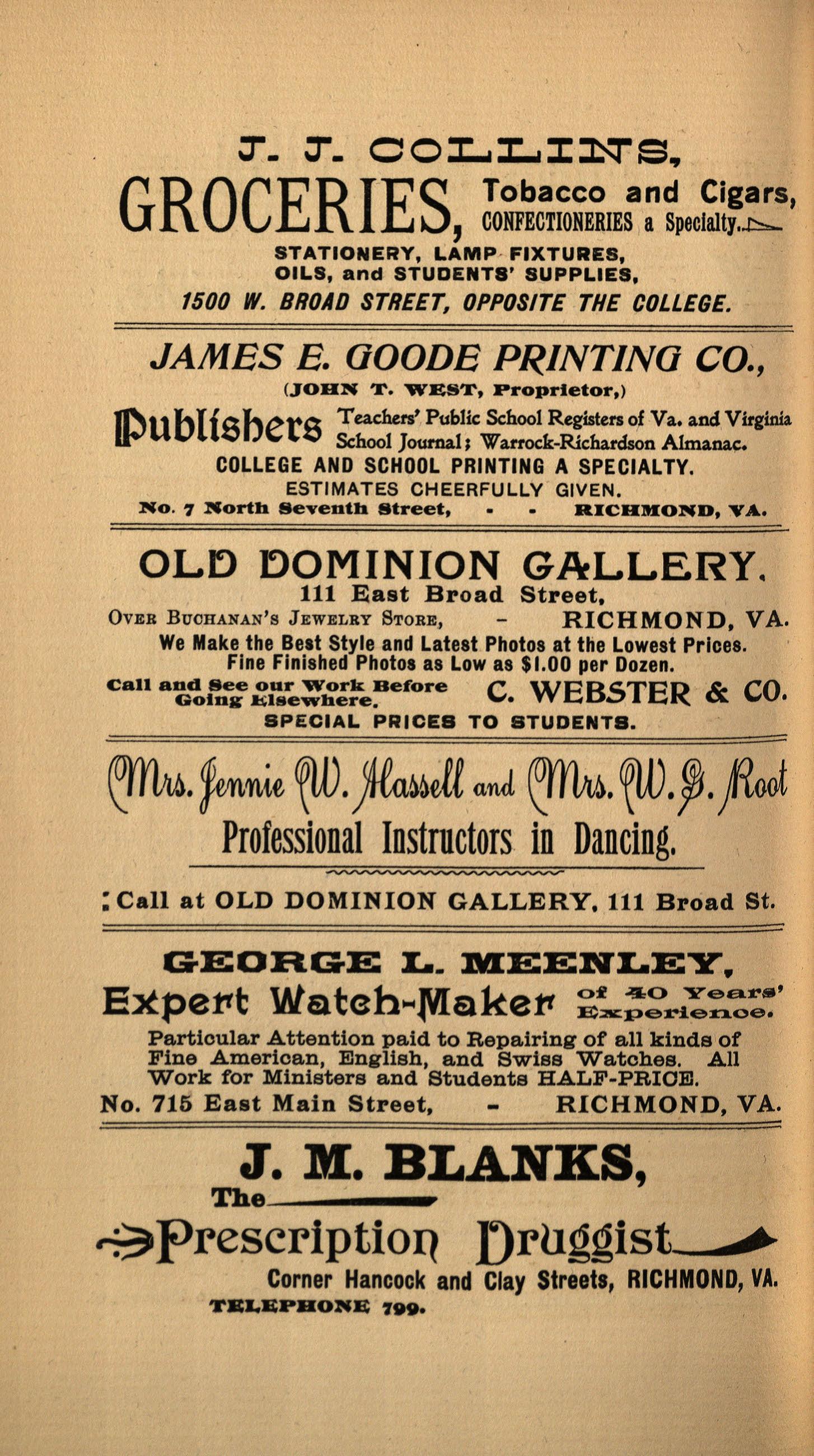 t ww-500 and 502 w. Broad Street, Corner Henry. The Beet Line of Goods on hand at all times. Prices Low. Your patronage solicited, and orders delivered at Oollege promptly without extra. oha.rge. DISCOUNT TO RICHMOND COLLEGE 8TUDENT8.