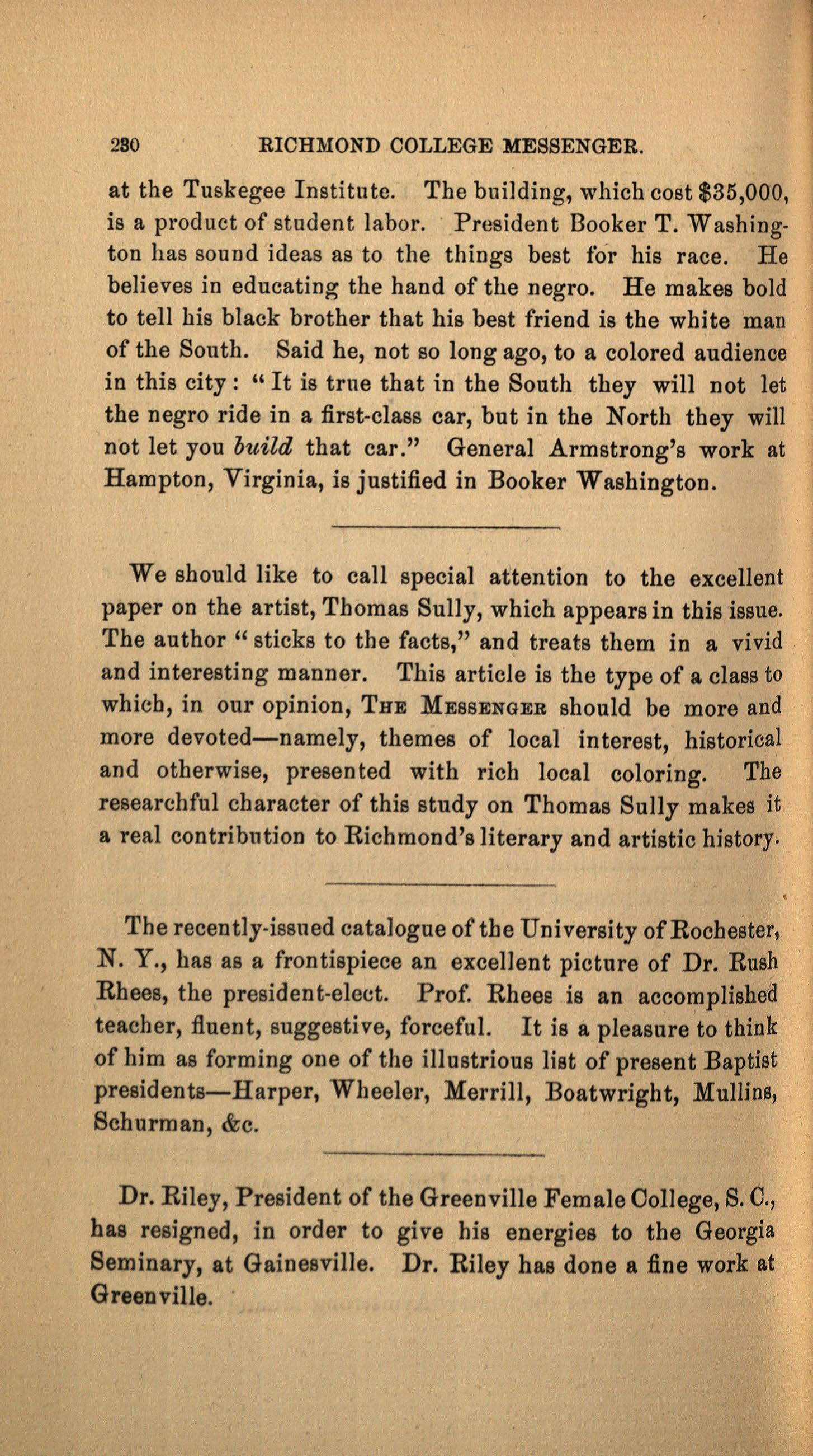 wishes to play an important part in the world's great chances must necessarily be better prepared when he enters the profession than the lawyer of a quarter of a century ago. How often have we seen justice trampled upon by the ignorance of its advocates~ Yet we do not subscribe to the philosophy of an examination that would cause some of our honored judges to scratch their heads, though we do believe that our present method is a good one, and should be upheld. There were thirteen applicants admitted to the bar at the recent examination propounded by that distinguished tribunal, the Supreme Court, eight of whom were Richmond College men-namely: Messrs. John Welch, Haskins Hobson, Jr., David M. White, John G. Guerrant, Robert S. Rever, H. W. Goodwin, John W. Winn, and J. C. Weckart. For us to mention the proficiency of these young lawyers would indeed be superfluous, knowing, as we do, where they studied law, and the rigid examination to which they were subjected.