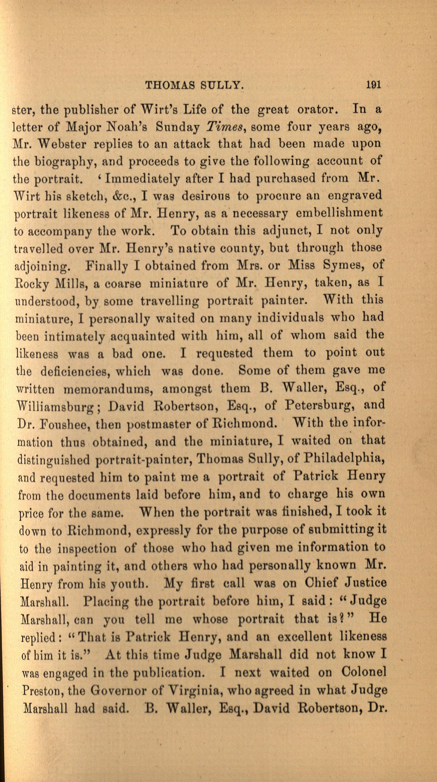 ster, the publisher of Wirt's Life of the great orator. In a letter of Major Noah's Sunday Times, some four years ago, Mr. Webst er replies to an attack that bad been made upon the biography, and proceeds to give the following account of the portrait. 'Immediately after I bad purchased from Mr. Wirt bis s k etc h, &c., I was desirous to procure an engraved portrait likene ss of Mr. Henry, as a necessary embellishment to accompany the work. To obtain this adjunct, I not only travelled over Mr. Henry's native county, but through those adjoining . Finally I obtained from frs. or Miss Symes, of Rocky Mills, a coarse miniature of Mr. Henry, taken, as I understood, by some travelling portrait painter. With this miniature, I per onally waited on many individuals who had been intimately acquainted with him, all of whom said the lilrnness was a bad one. I requested them to point out the deficiencies, which was done. Some of them gave mo written memorandums, amongst them B. Waller, Esq., of Williamsburg; David Robertson, Esq., of Petersburg, and Dr. Foushee, then postmaster of Richmond. With the information thus obtained, and the miniature, I ,vaited on that distinguished portrait-painter, Thomas nlly, of Philadelphia, and requested him to paint me a portrait of Patrick Henry from the documents laid before him, and to charge his own price for the same . When the portrait was finished, I took it down to Richmond, expres ly for the purpose of submitting it to the inspection of those who had given me information to aid in painting it, and others who had personally known Mr. Henry from his youth. My first call was on Chief Justice Marshall. Placing the portrait before him, I said : "Judge Marshall, can you toll me whose portrait that is i" He replied : "That is Patrick TI nry, and an excellent likeness of him it is." At this time Judge Marshall did not know I was engaged in tho publication. I next waited on Colonel Preston, the Governor of irginia, who agreed in what Judge Marshall had said. B. Waller, Esq., David Robertson, Dr.