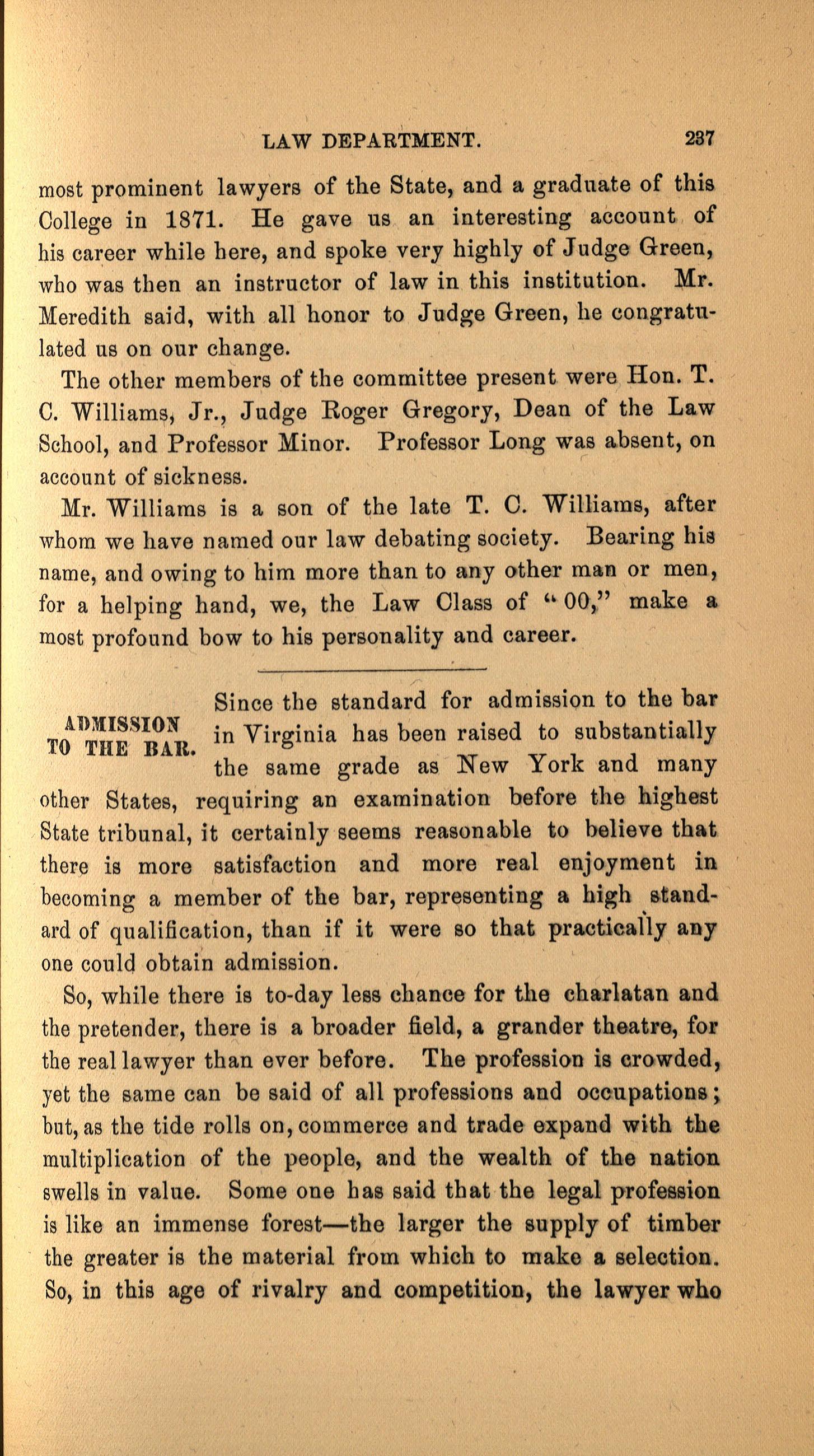 The oth er members of the committee present were Hon. T. C. William sj Jr. 1 Judge Roger Gregory, Dean of the Law School, and Profe ssor Minor. Professor Long w~s absent, on account of sickness.
