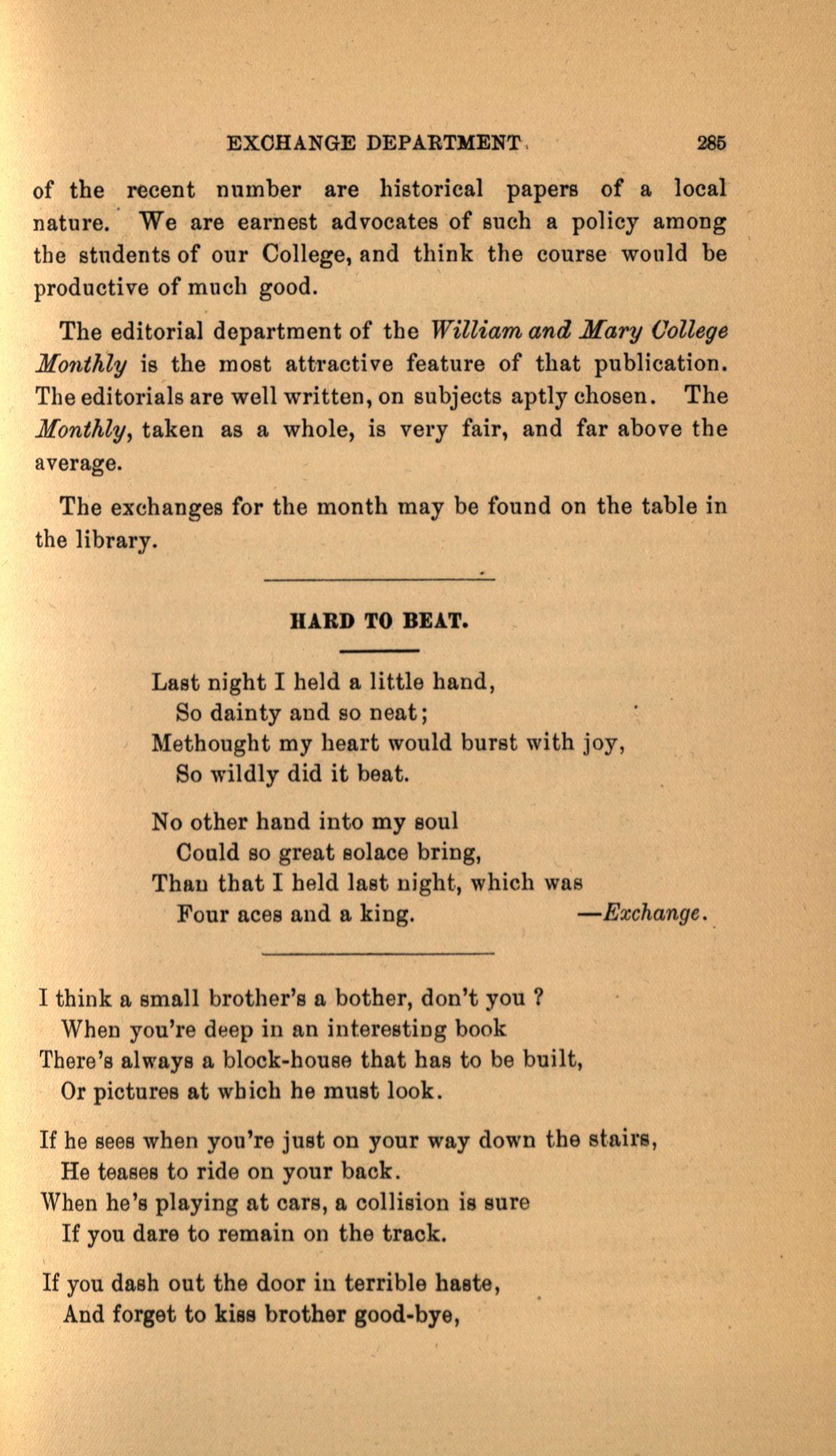 The editorial department of the William and Kary College Monthly is the most attractive feature of that publication. The editorials are well written, on subjects aptly chosen. The Monthly, taken as a whole, is very fair, and far above the average.