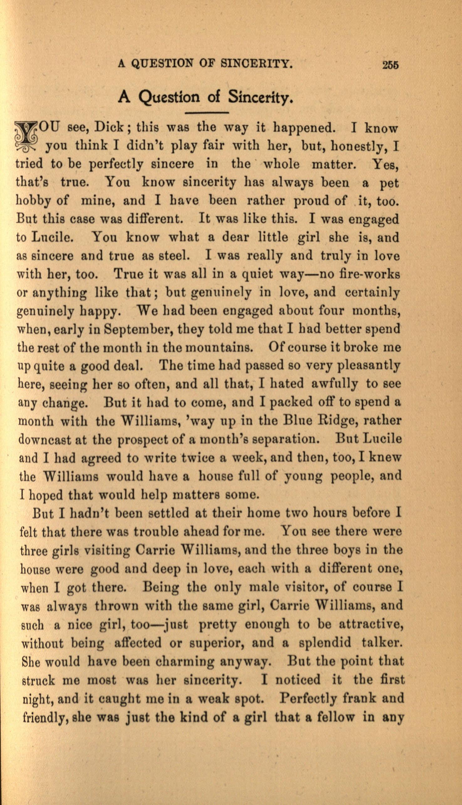 OU see, Dick; this was the way it happened. I know you think I didn't play fair with her, but , honestly , I tried to be perfectly since r e in the whole matter. Yes, that's true. You know sincer i ty has always been a pet hobby of mine, and I have been rather proud of it, too. But this case was different . It was like this. I was engaged to Lncilc. You know what a dear Iittle girl she is, an d as sincere and true as steel. I was really and truly in love with her, too. True it was all in a quiet way-no :fire-works or anything like that; but genuinely in love, and certainly genuinely happy. We had been engaged about four months, when, early in September , they told me that I bad better spend the rest of the month in the mountains. Of course it broke me up quite a good dea l. The time had passed so very pleasantly here, seeing her so often, and all that, I hated awfully to see any change. But it had to come, and I packed off to spend a month with the Williams, 'way up in the Blne Ridge, rather downcast at the prospect of a months separation. But Lucile and I had agreed to write twice a week, and then, too, I knew the Williams would have a house full of young people, and I hoped that would help matters some.