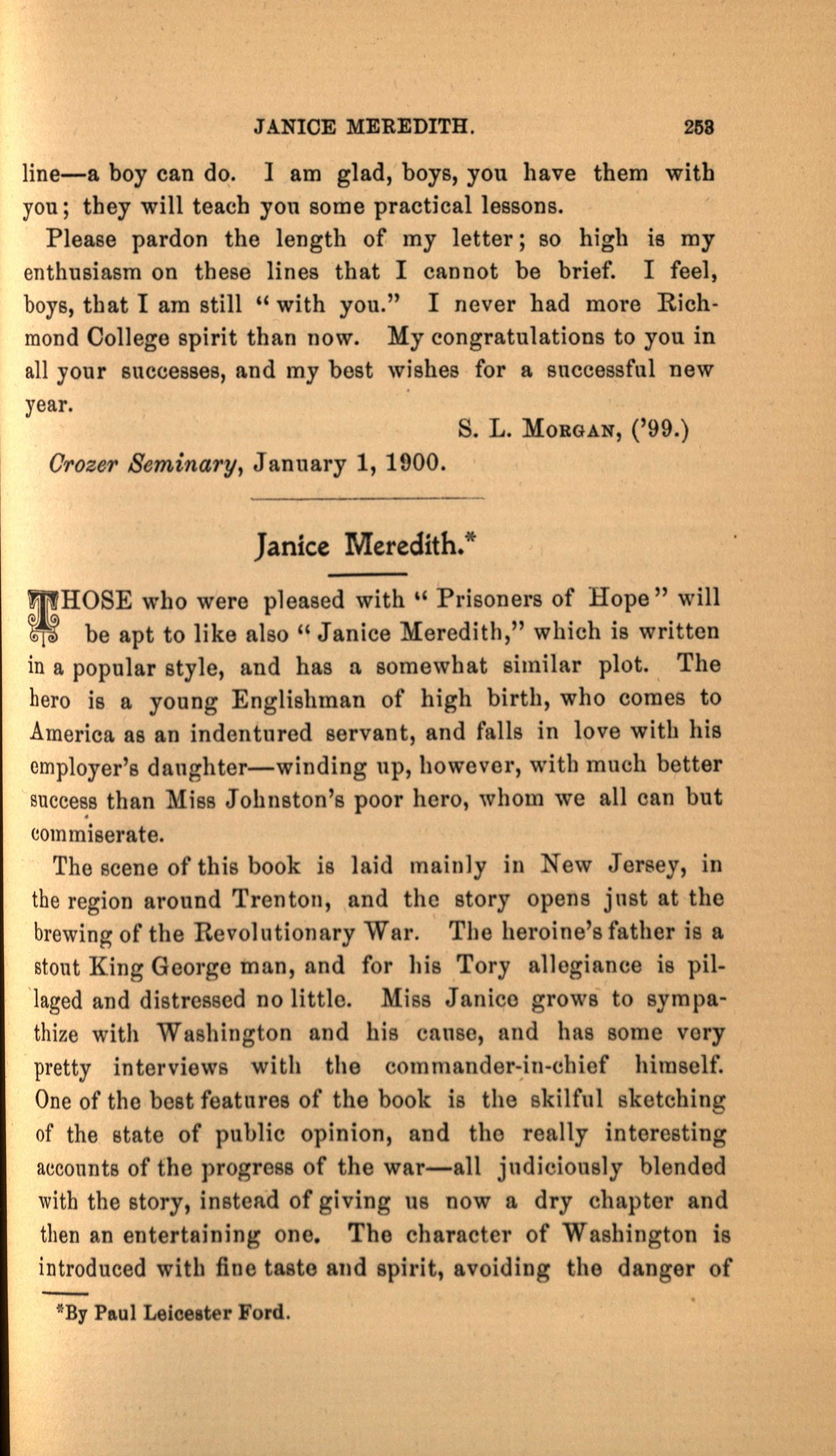 The minor defects of the book ought, perhaps, to be overlooked, yet it is amazing to see, for instance, how rudely Mr. Ford aJlows his heroine to talk to her mother, provoking as that fady sometimes is, and what a way most of the characters have of" snapping," "snarling,'' and "jeering" at each other, t110ugh they consider themselves well-bred. Another inconsistency is that Jan ice and her mother do most of the household work, though they have numerous servants, and later in the day appear in all the splendor and daintiness of apparel that we read of in the life of colonial Virginia. Their relation wHh their servants is also strangely familiar, lacking what we would consider a proper sense of the respective positions of mistress and maid. Such blemishes as these arc, however, offset by a graceful style and the pleasant pace at which the story runs along and leads to a happy close.