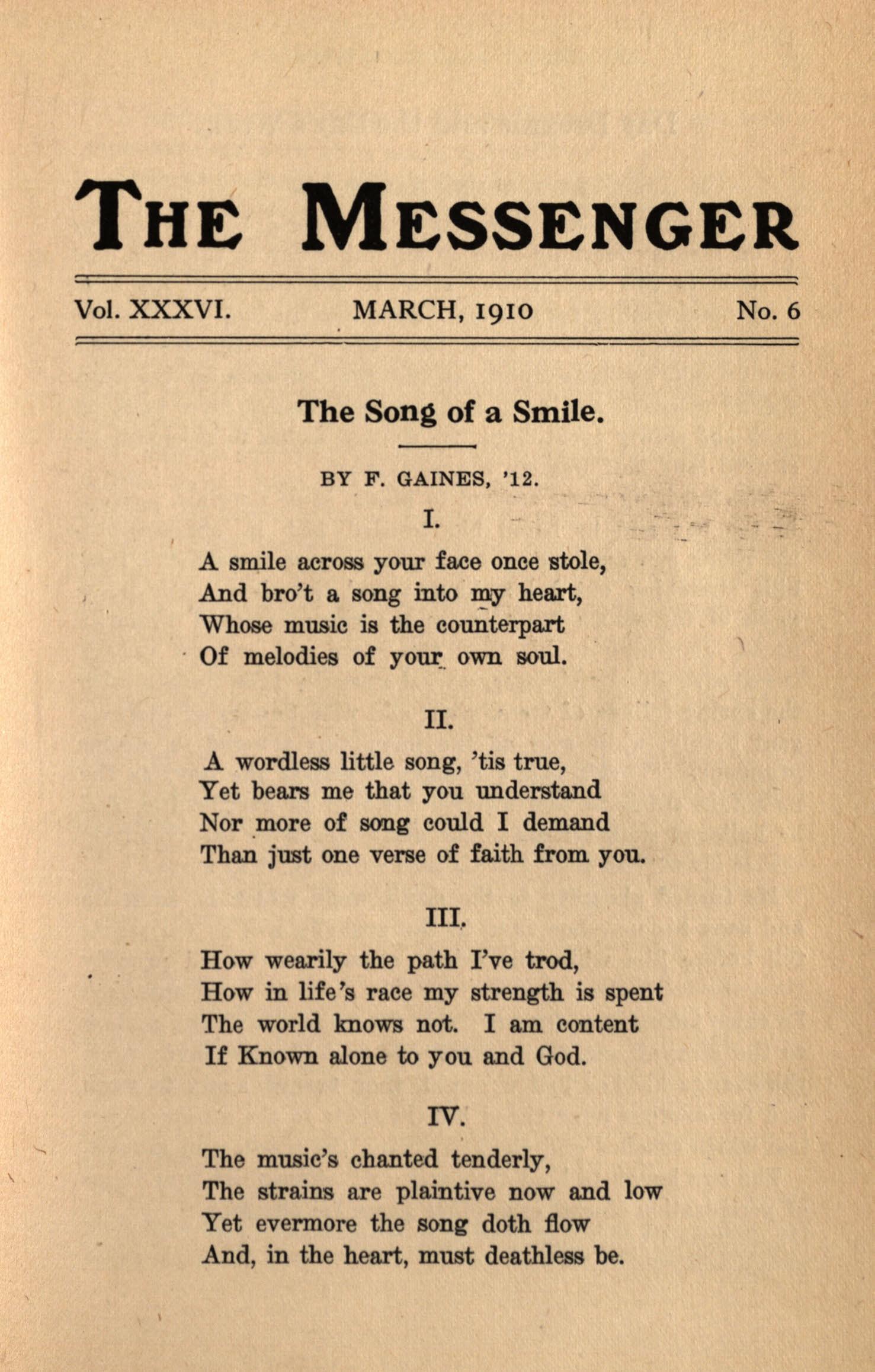 A smile across your face once stole, And bro't a song into heart, Whose music is the counterpart · Of melodies of YOUI'.. own soul.