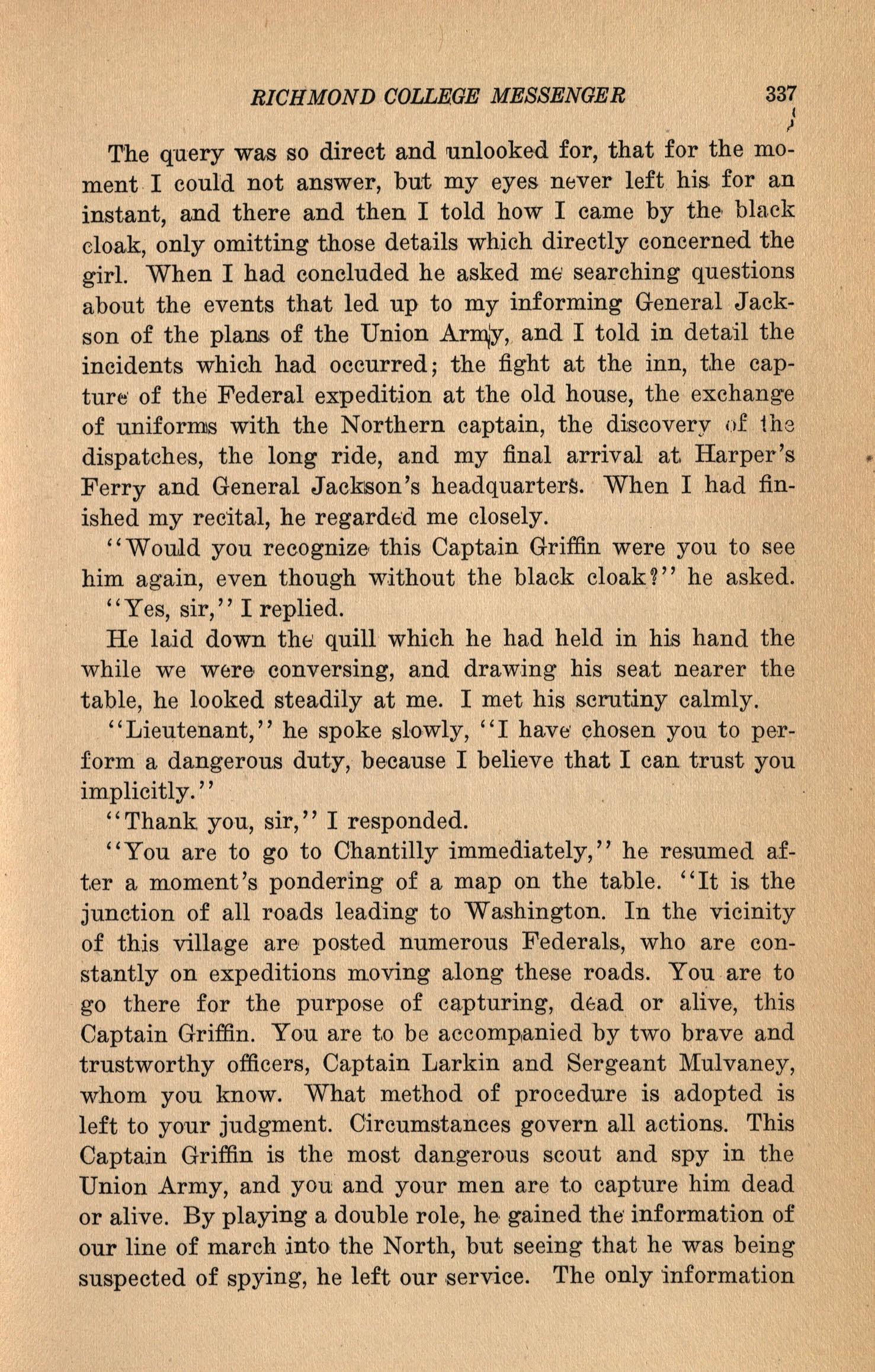 To those who know and lov.e the city this glamour seems to center aroun,d and emenate from Richmond. Almost every street of the old city can boast of some romance in which national characters played a part; while the hills and meadows about it assume a special beauty when we read into them their history. It is useless to speak of such plac1::s as Seven Pines, where the two great armies clashed and struggled for d ays and weeks, or of Yellow Tavern, where Stuart, our hero and our cavalier sans peur et sans reproche, fought his last fight, and fell, a hero to the last; but l et us rath er look for this charm owr the spots where it is harder to find.