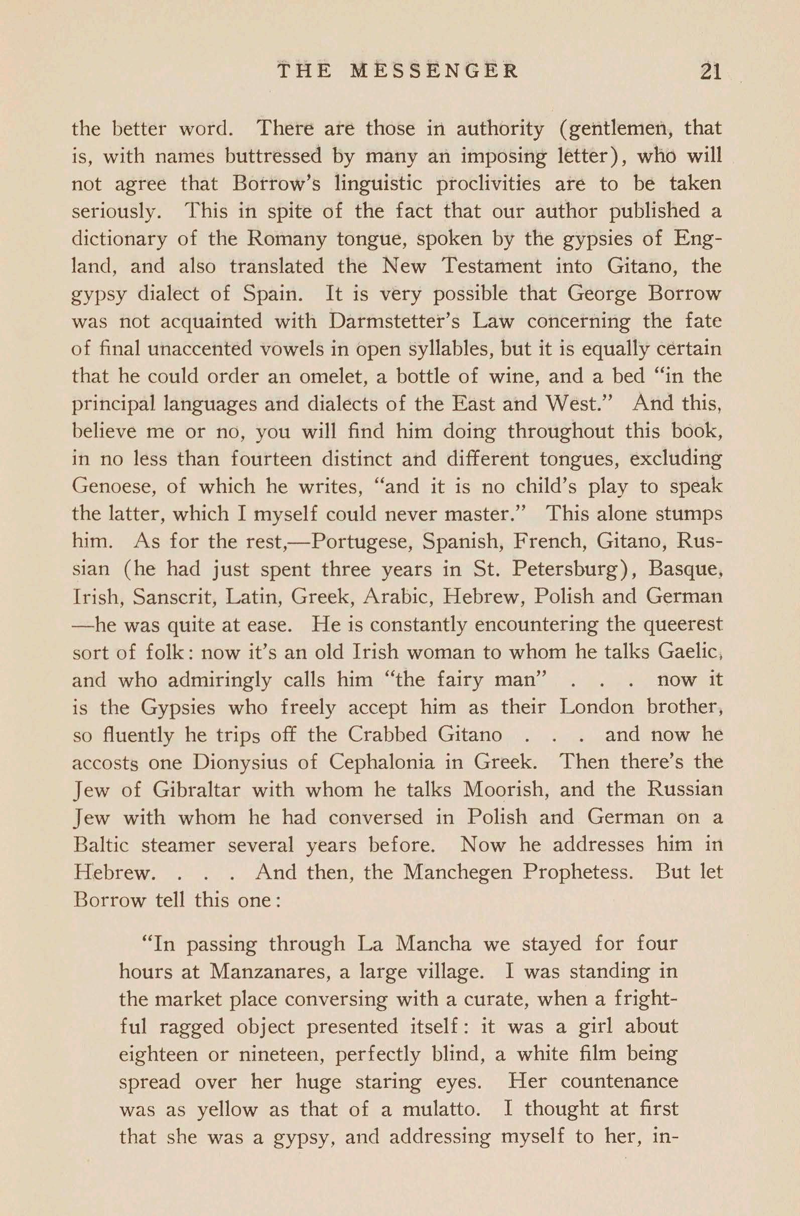 the better word. There are those irt authority (gehtlemen, that is, with names buttressed by many an imposing letter), who will not agree that Borrow's linguistic proclivities are to be taken seriously. This in spite of the fact that our author published a dictionary of the Romany tongue, spoken by the gypsies of England, and also translated the New Testament into Gitano, the gypsy dialect of Spain. It is very possible that George Borrow was not acquainted with Darmstetter's Law concerning the fate of final unaccented vowels in open syllables, but it is equally certain that he could order an omelet, a bottle of wine, and a bed "in the principal languages and dialects of the East and West." And this, believe me or no, you will find him doing throughout this book, in no less than fourteen distinct and different tongues, excluding Genoese, of which he writes, "and it is no child's play to speak the latter, which I myself could never master." This alone stumps him. As for the rest,-Portugese, Spanish, French, Gitano, Russian ( he had just spent three years in St. Petersburg), Basque, Irish, Sanscrit, Latin, Greek, Arabic, Hebrew, Polish and German -he was quite at ease. He is constantly encountering the queerest sort of folk: now it's an old Irish woman to whom he talks Gaelic , and who admiringly calls him "the fairy man" now it is the Gypsies who freely accept him as their London brother, so fluently he trips off the Crabbed Gitano . and now he accosts one Dionysius of Cephalonia in Greek. Then there's the Jew of Gibraltar with whom he talks Moorish, and the Russian Jew with whom he had conversed in Polish and German on a Baltic steamer several years before. Now he addresses him in Hebrew. . . . And then, the Manchegen Prophetess. But let Borrow tell this one :