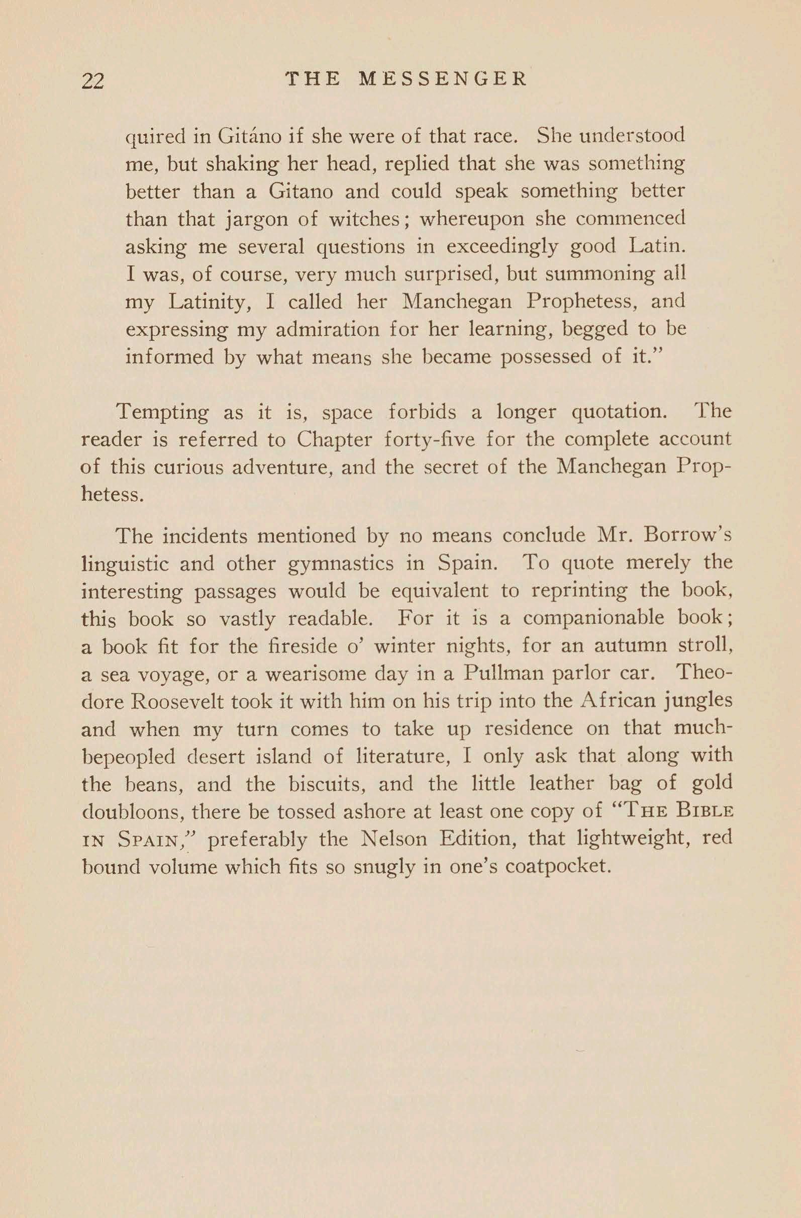 The incidents mentioned by no means conclude Mr. Barrow's linguistic and other gymnastics in Spain. To quote merely the interesting passages would be equivalent to reprinting the book, this book so vastly readable. For it is a companionable book; a book fit for the fireside o' winter nights, for an autumn stroll , a sea voyage, or a wearisome day in a Pullman parlor car. Theodore Roosevelt took it with him on his trip into the African jungles and when my turn comes to take up residence on that muchbepeopled desert island of literature, I only ask that along with the beans, and the biscuits, and the little leather bag of gold doubloons, there be tossed ashore at least one copy of "THE BIBLE IN SPAIN," preferably the Nelson Edition, that lightweight, reel bound volume which fits so snugly in one's coatpocket.