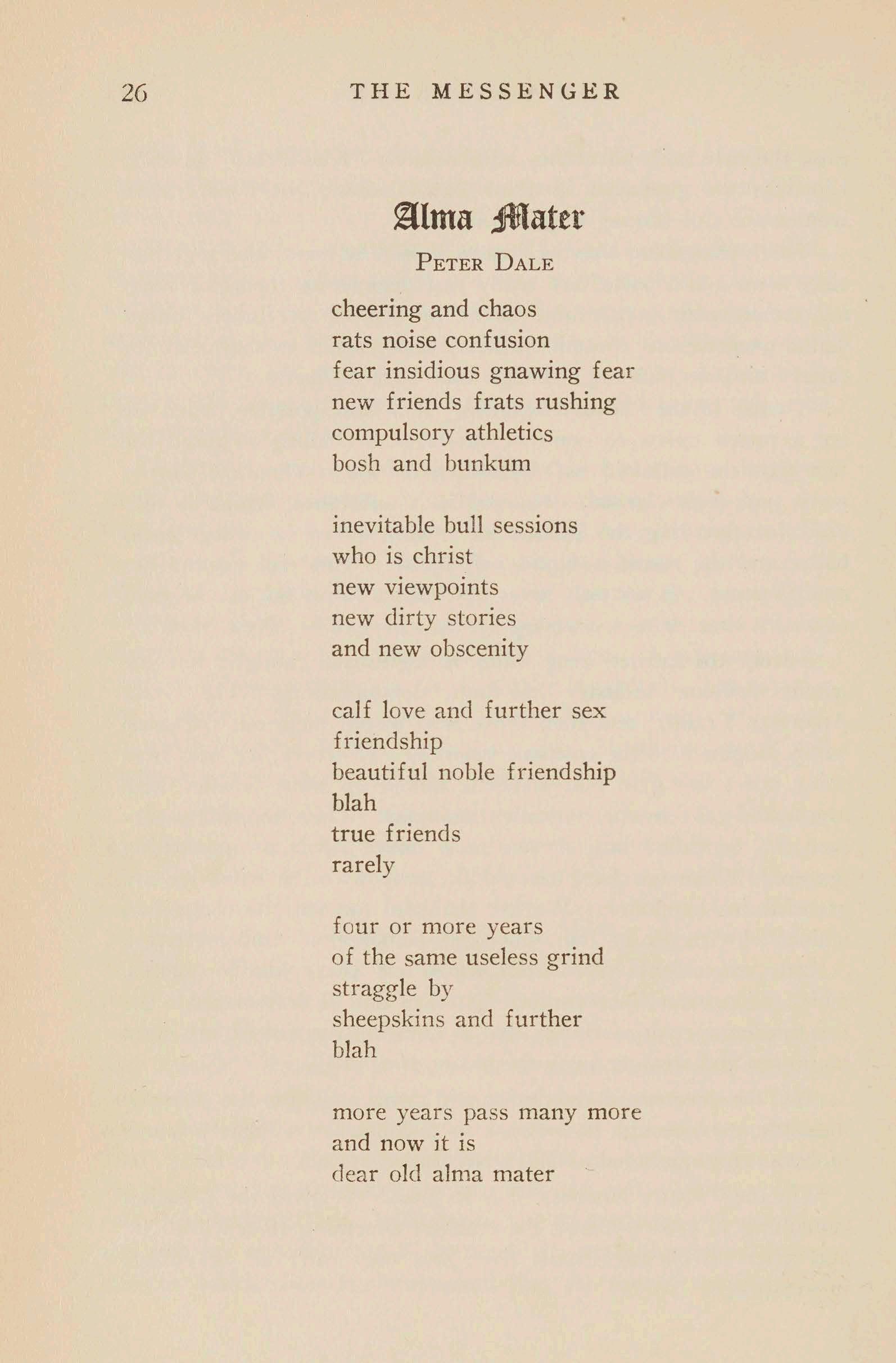 But you will far rather have, I know, (I love you well enough to know), My moon shaped frat pin, Wrapped in a fifty dollar dress To wear it on, So that you can say, wide-eyed, To that red lipped group about you , "He must be wild about me, Look! He gave me this."