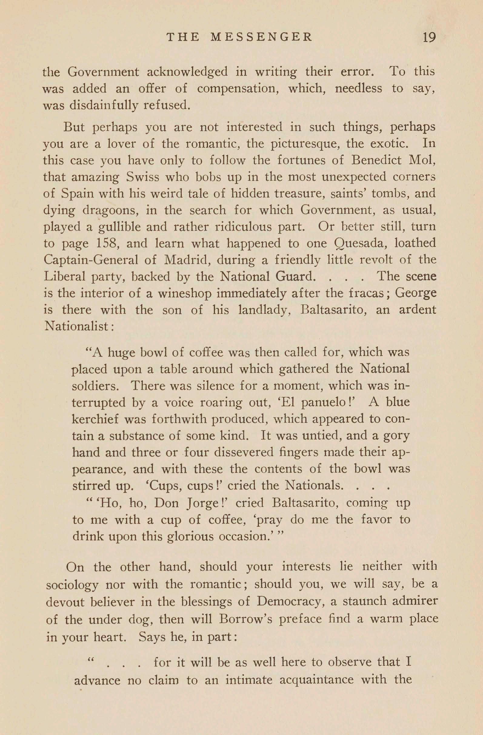 But perhaps you are not interested in such things, perhaps you are a lover of the romantic, the picturesque, the exotic. In this case you have only to follow the fortunes of Benedict Mol, that amazing Swiss who bobs up in the most unexpected corners of Spain with his weird tale of hidden treasure, saints' tombs, and dying dragoons, in the search for which Government, as usual, played a gullible and rather ridiculous part. Or better still, turn to page 158, and learn what happened to one Quesada, loathed Captain-General of Madrid, during a friendly little revolt of the Liberal party, backed by the National Guard. . The scene is the interior of a wineshop immediately after the fracas; George is there with the son of his landlady, Baltasarito, an ardent Nationalist: