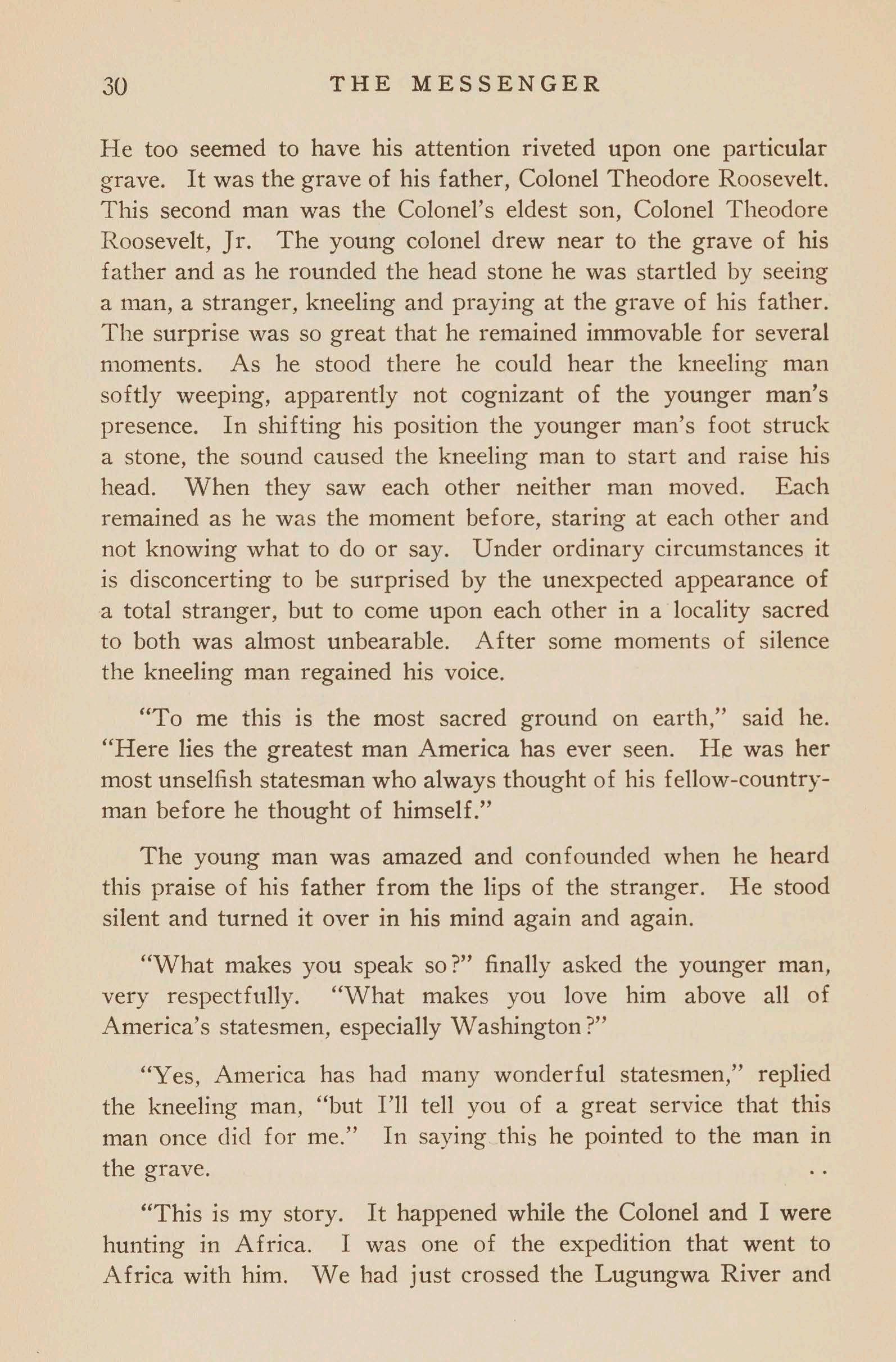 He too seemed to have his attention riveted upon one particular grave. It was the grave of his father, Colonel Theodore Roosevelt. This second man was the Colonel's eldest son, Colonel Theodore Roosevelt, Jr. The young colonel drew near to the grave of his father and as he rounded the head stone he was startled by seeing a man, a stranger, kneeling and praying at the grave of his father. The surprise was so great that he remained immovable for several moments. As he stood there he could hear the kneeling man softly weeping, apparently not cognizant of the younger man's presence. In shifting his position the younger man's foot struck a stone, the sound caused the kneeling man to start and raise his head. When they saw each other neither man moved. Each remained as he was the moment before, staring at each other and not knowing what to do or say. Under ordinary circum stances it is disconcerting to be surprised by the unexpected appearance of a total stranger, but to come upon each other in a locality sacred to both was almost unbearable. After some moments of silence the kneeling man regained his voice.