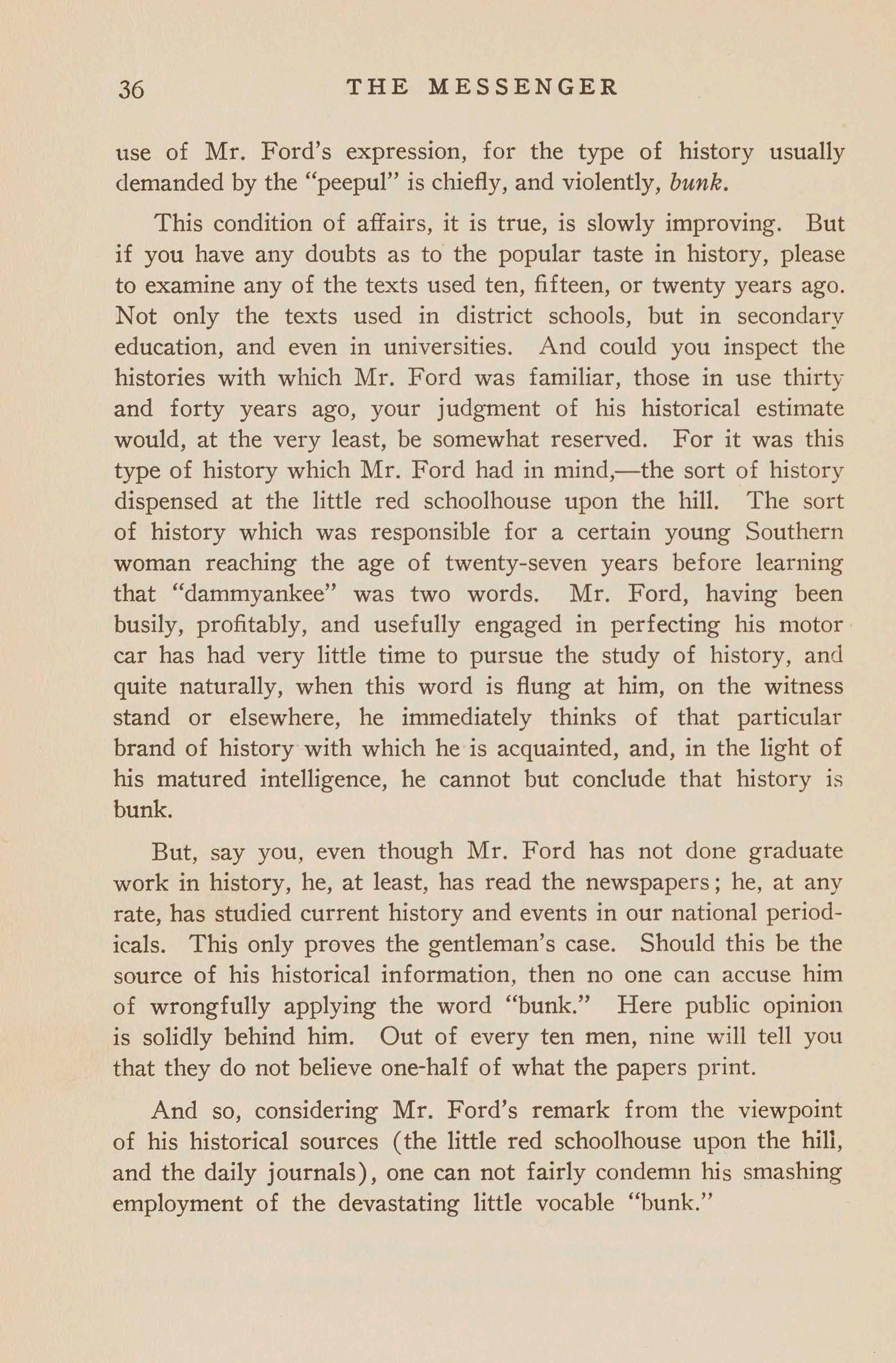 The next point to be determined is just what sort of history Mr. Ford had in mind when he uttered his stinging phrase. Here, I believe, may be found the key to the whole business. No intelligent person will deny that several varieties of history exist. The most striking fact which the student encounters as he enters an institution of higher learning, is the vast amount of historical information acquired in school, which he must begin to unlearn. He finds that the brand of history retailed in the little red schoolhouse on the hill ( or in the big brick schoolhouse on Main Street), will not easily stand the test of an impartial inspection of events and peoples. This is clearly evident in the yearly rows over textbooks which embellish our daily newspapers, and honest historians despair of ever seeing their works in the lower schools. Successful history texts are prepared on the good old plan of : "Give the people what they want." And just here, perhaps, we can make