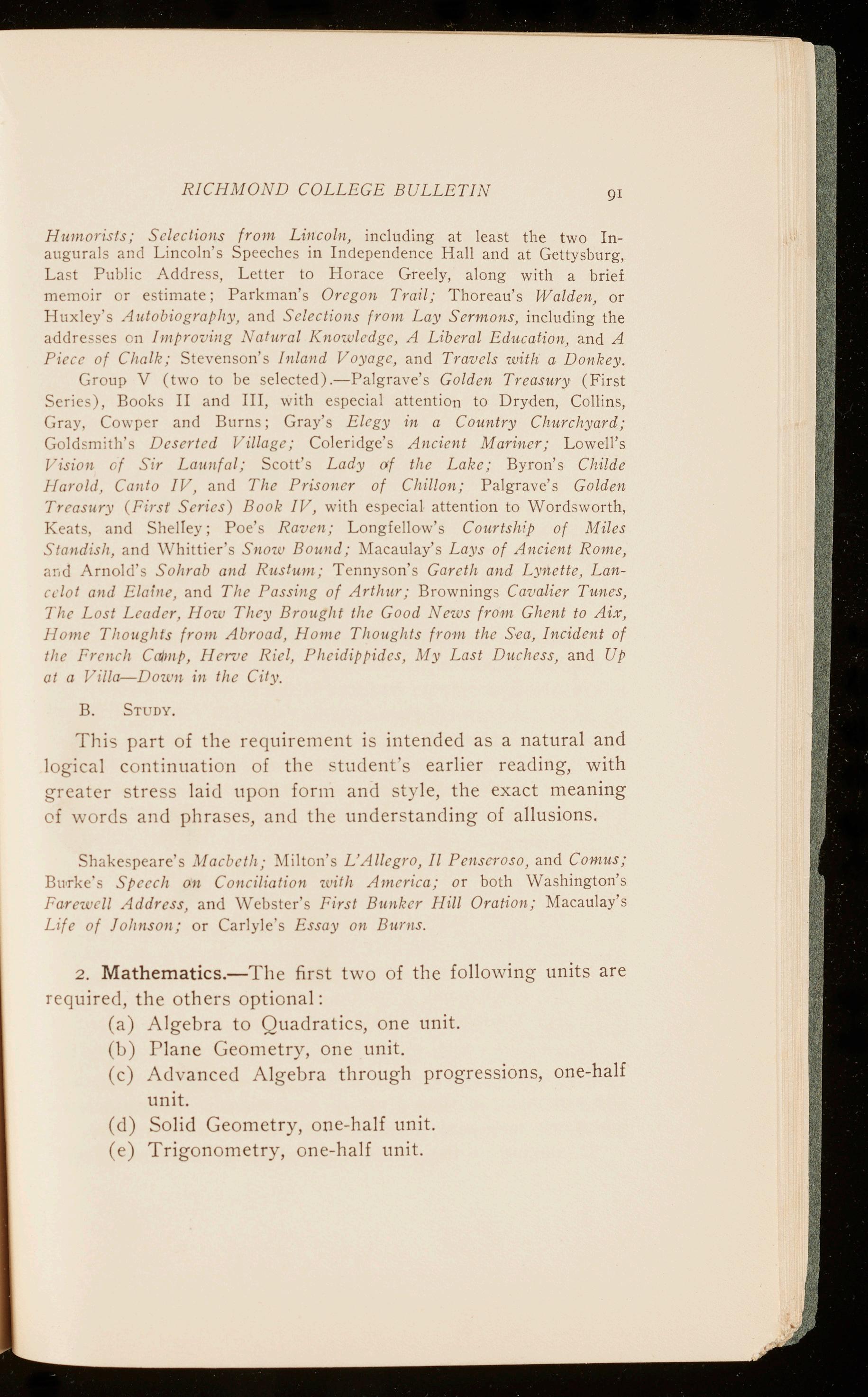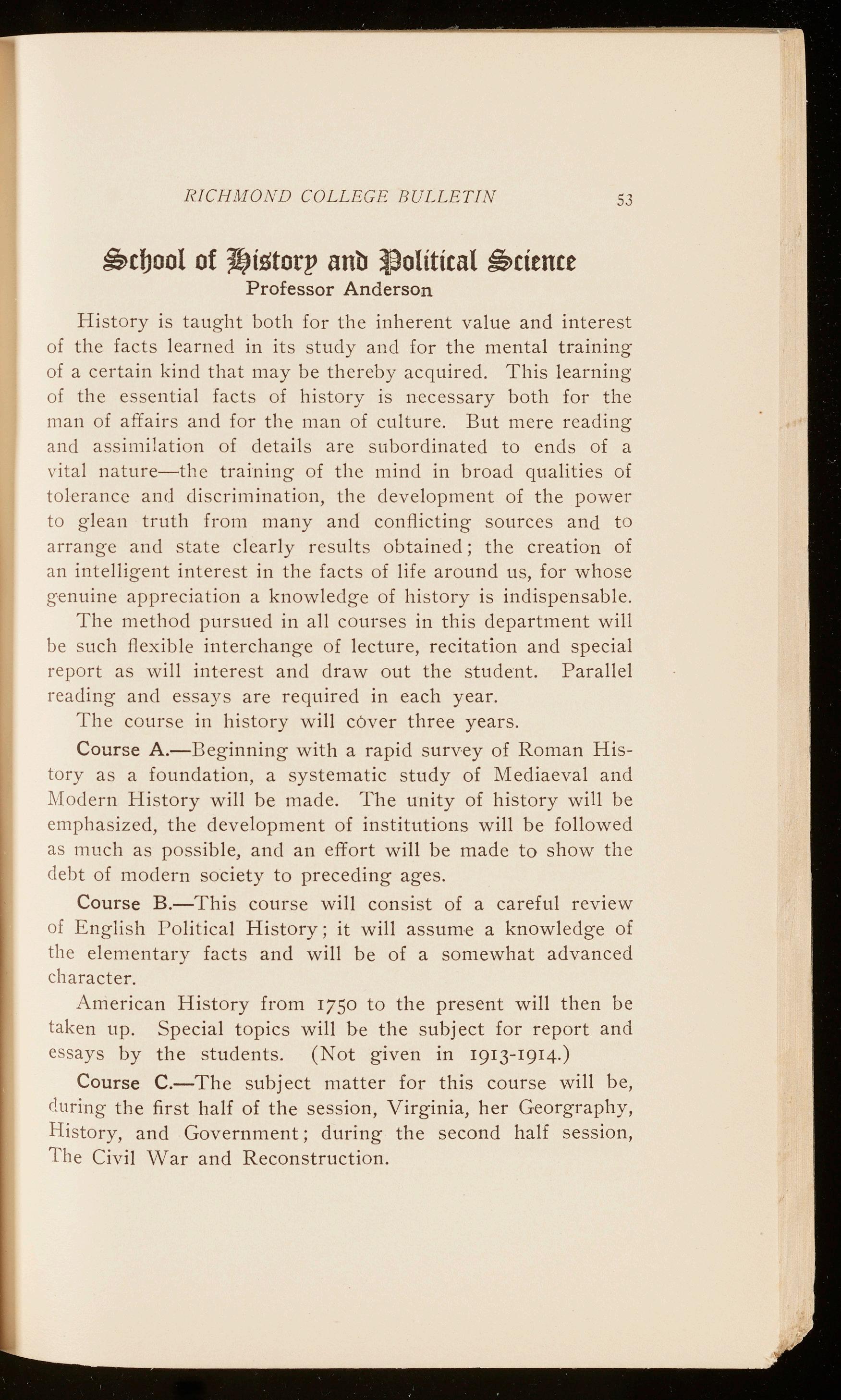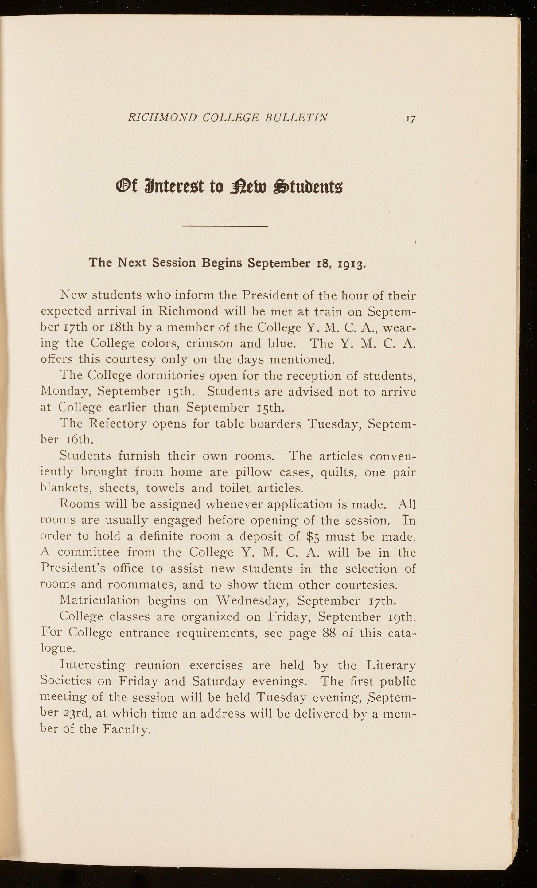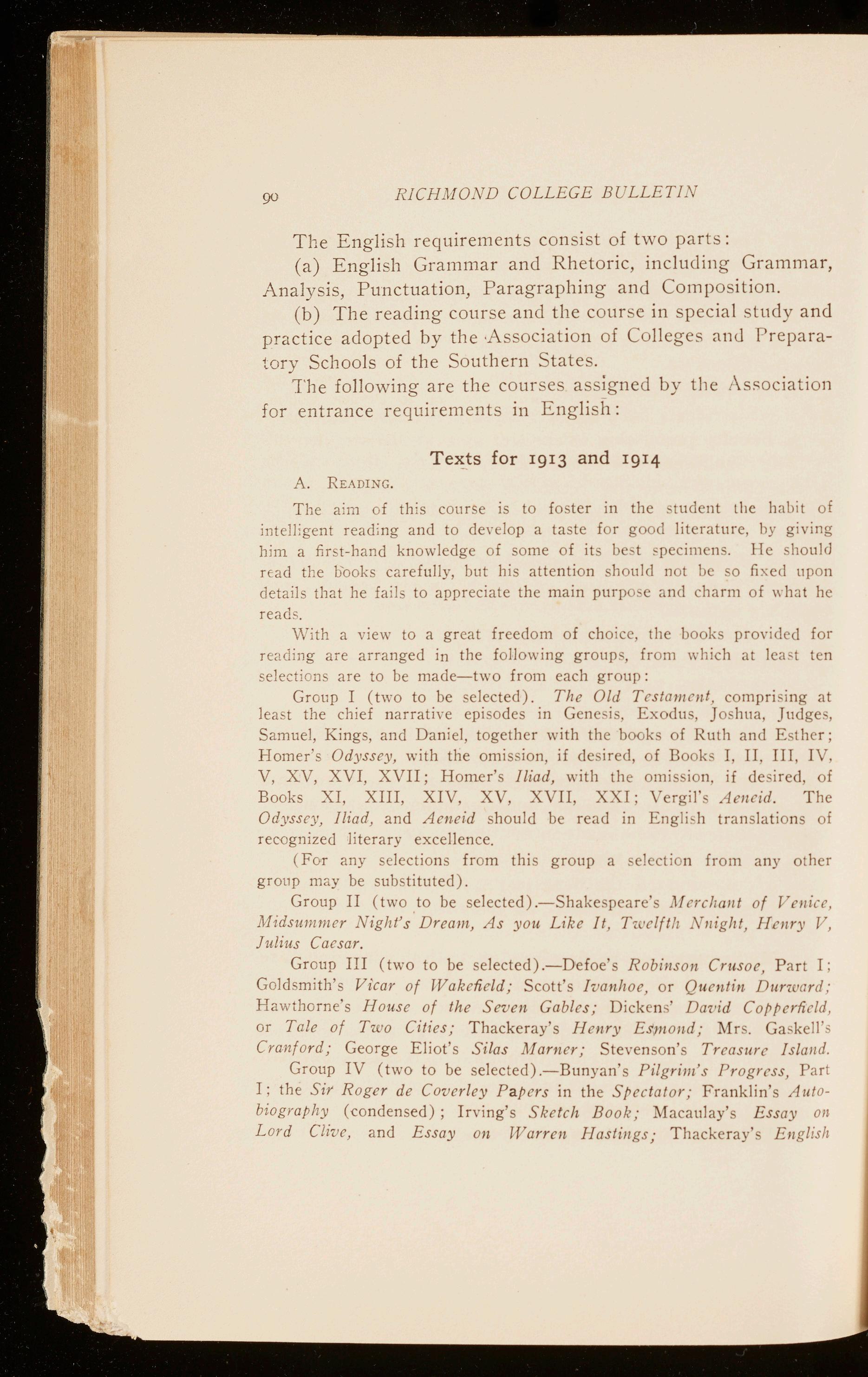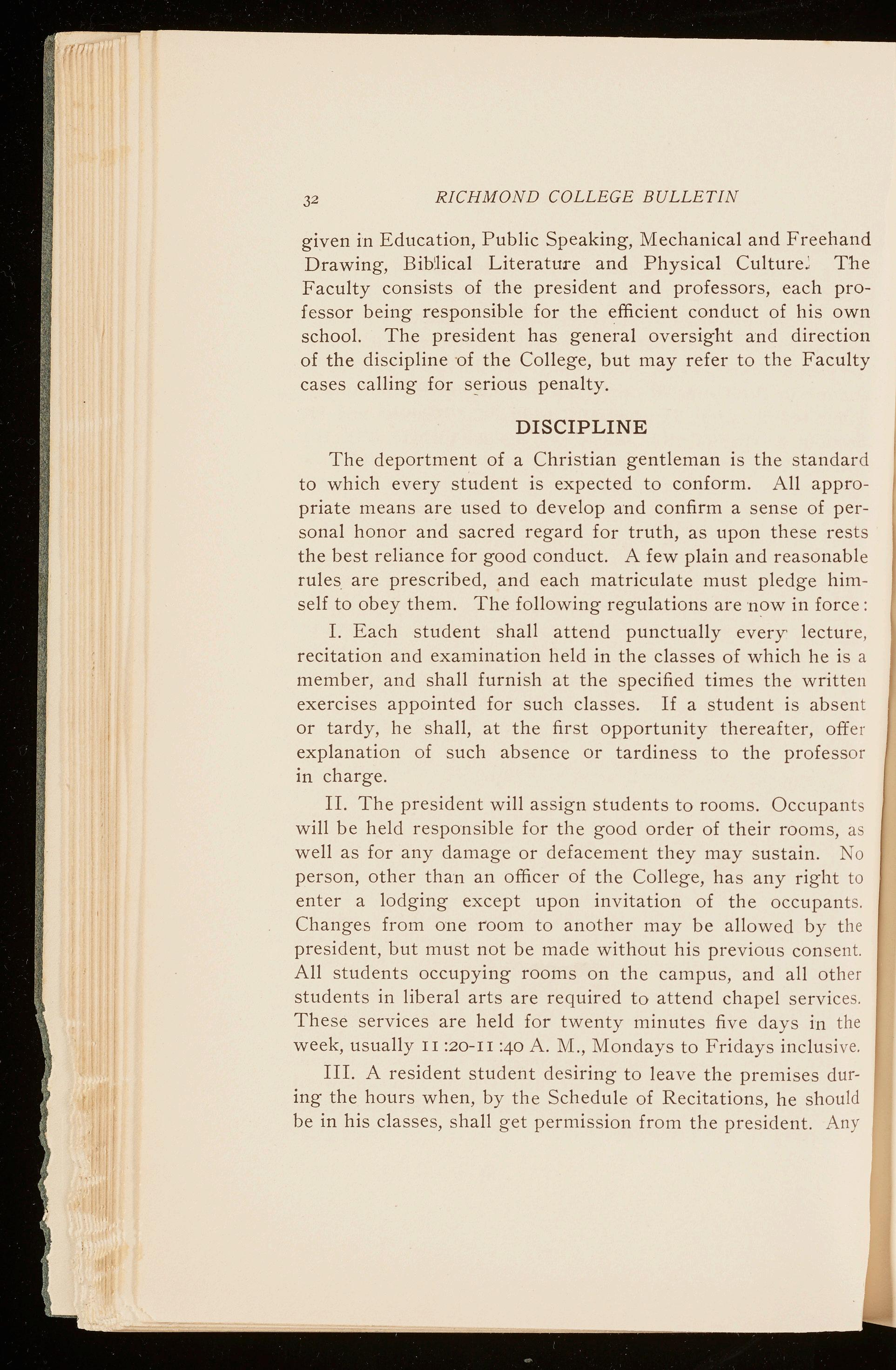 In September, 1902, the Tru stee s of Ri chmond College estab lish '.d Richmond Academy, a secondary school for boys. The two building sone containing a large study hall and eight class - rooms, and the other the primary schoo l-are located two squares south of the College on Lombardy Street and Park Avenue The buildings are new, fitted up w i h single desks and mod ern equipment. In 1912-'13 the enrollment was 140. The course of study in the Academy begins with simple lessons in English and ends with studies in Latin, Greek, English, :\fathematics, Hi story, French, German and Science that fit boys to enter the clas ses of Richmond College o r other institutions of like grade. The fees are $50 in the lower schoo l and $75 in the upper school.