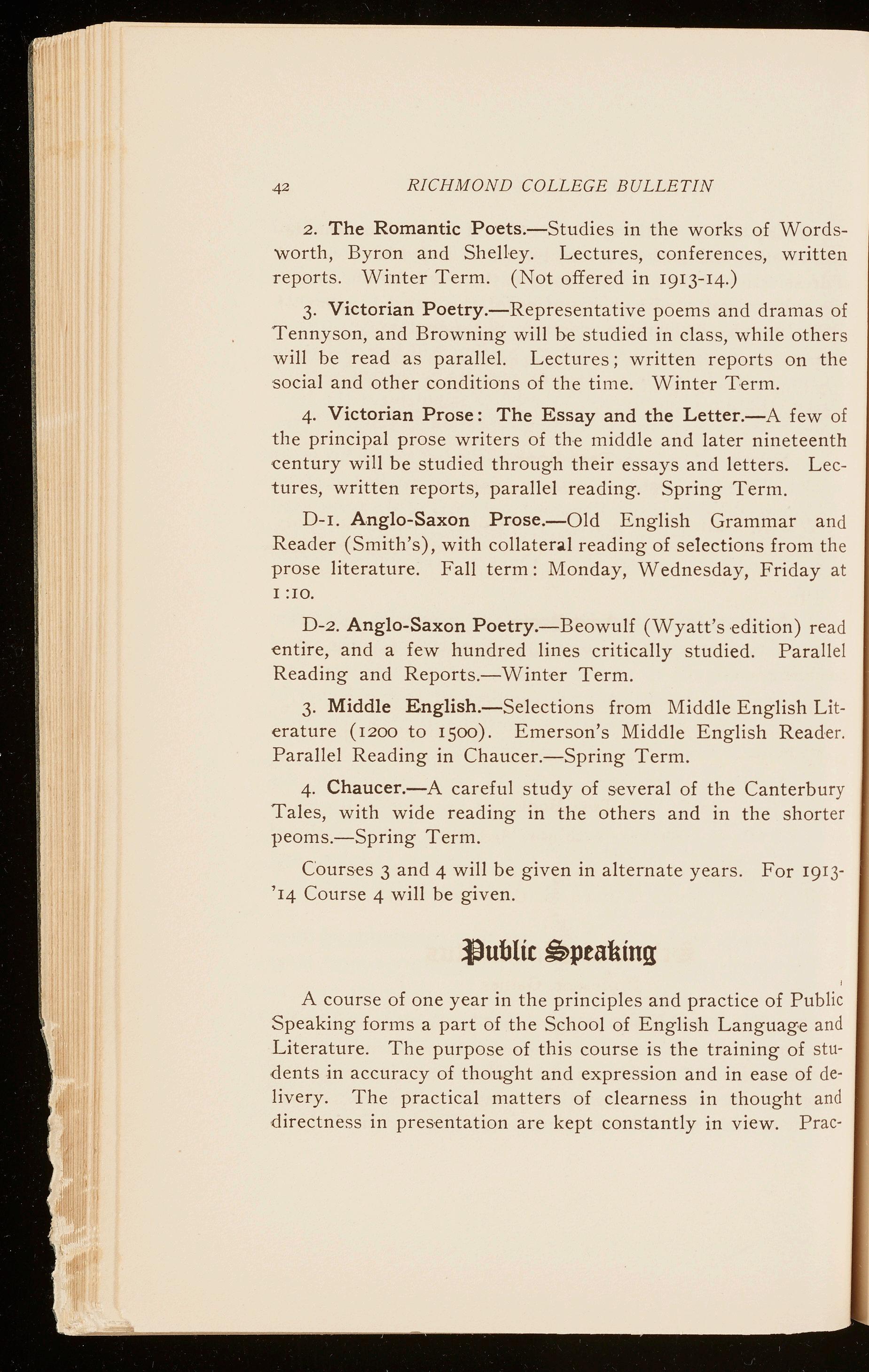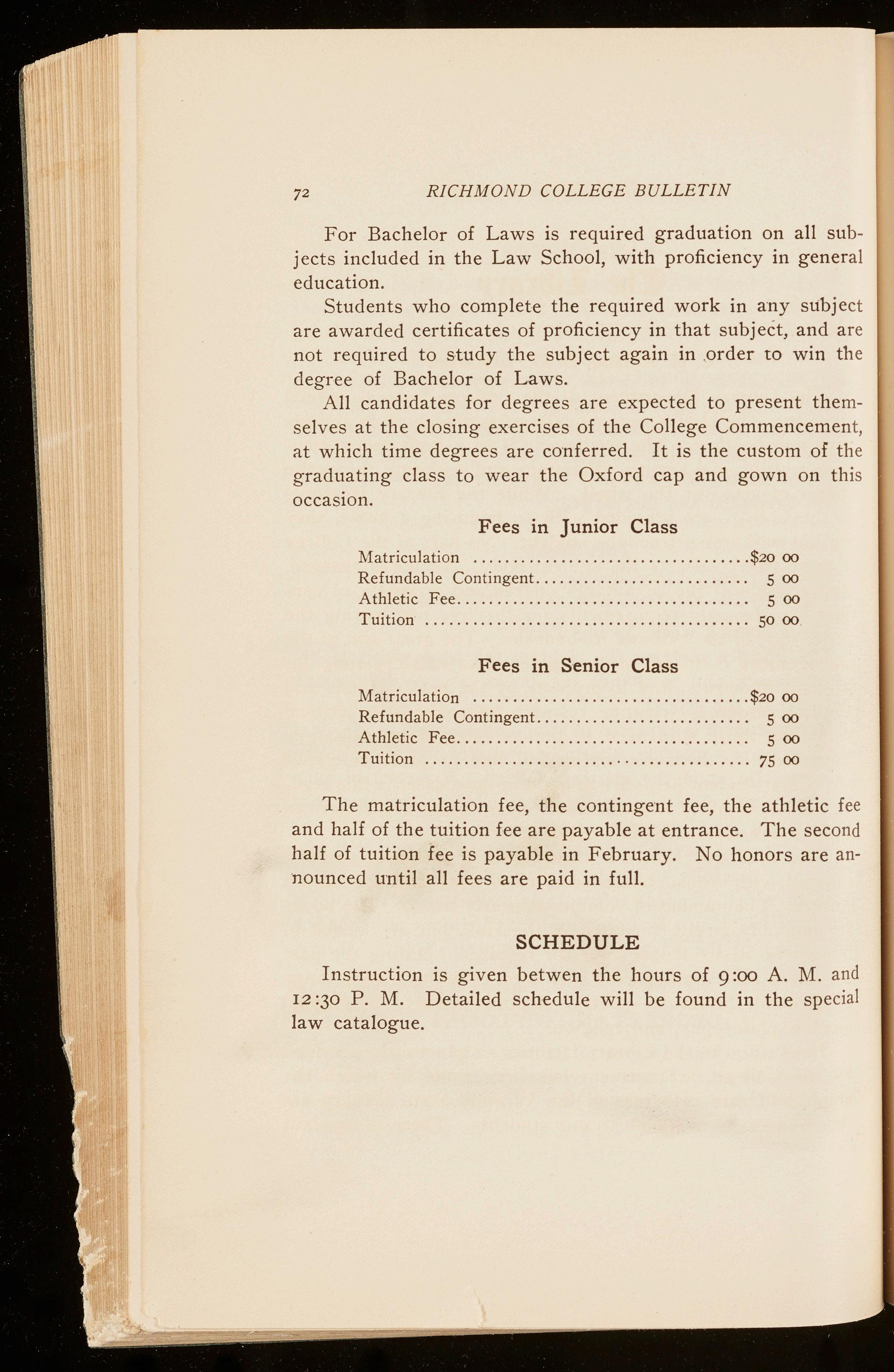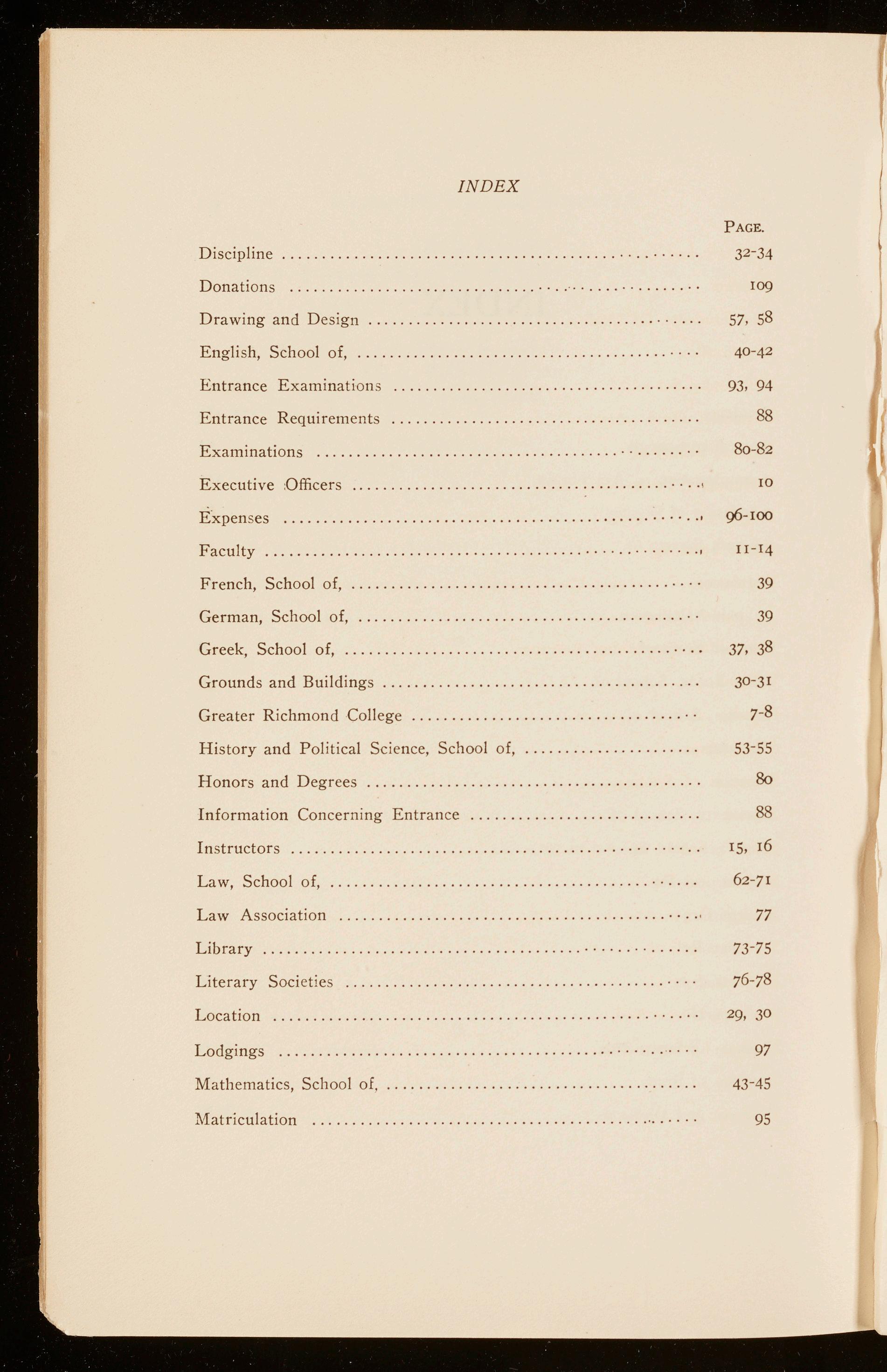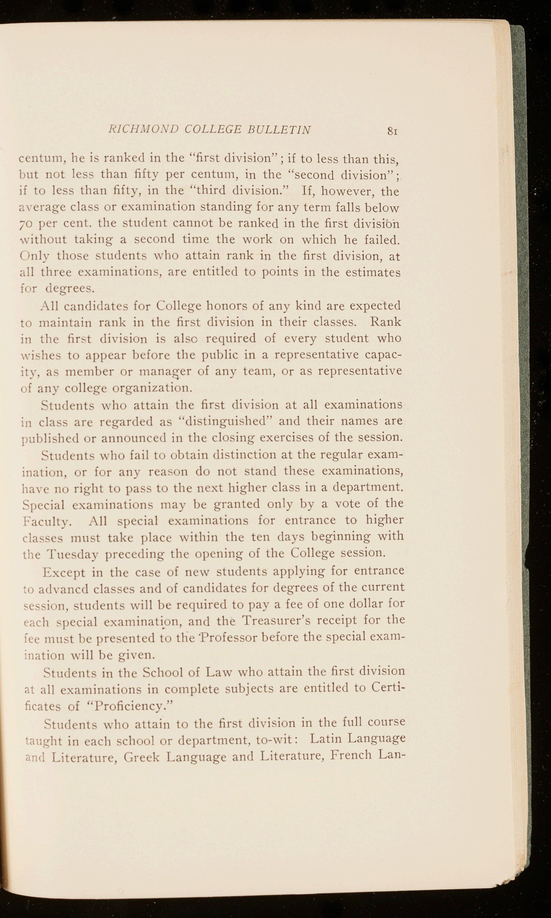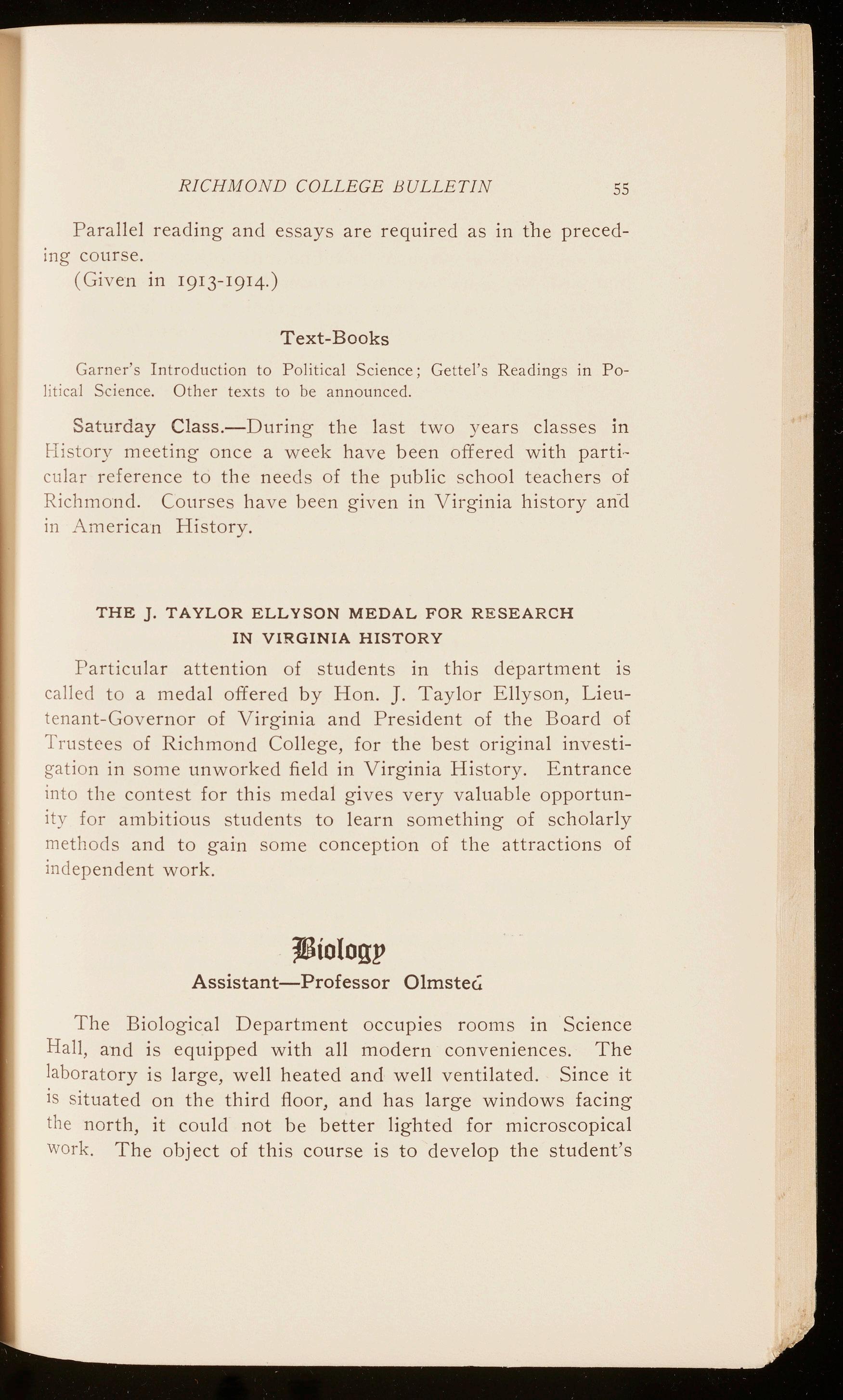 In September, 1902, the Tru stee s of Ri chmond College estab lish '.d Richmond Academy, a secondary school for boys. The two building sone containing a large study hall and eight class - rooms, and the other the primary schoo l-are located two squares south of the College on Lombardy Street and Park Avenue The buildings are new, fitted up w i h single desks and mod ern equipment. In 1912-'13 the enrollment was 140. The course of study in the Academy begins with simple lessons in English and ends with studies in Latin, Greek, English, :\fathematics, Hi story, French, German and Science that fit boys to enter the clas ses of Richmond College o r other institutions of like grade. The fees are $50 in the lower schoo l and $75 in the upper school.