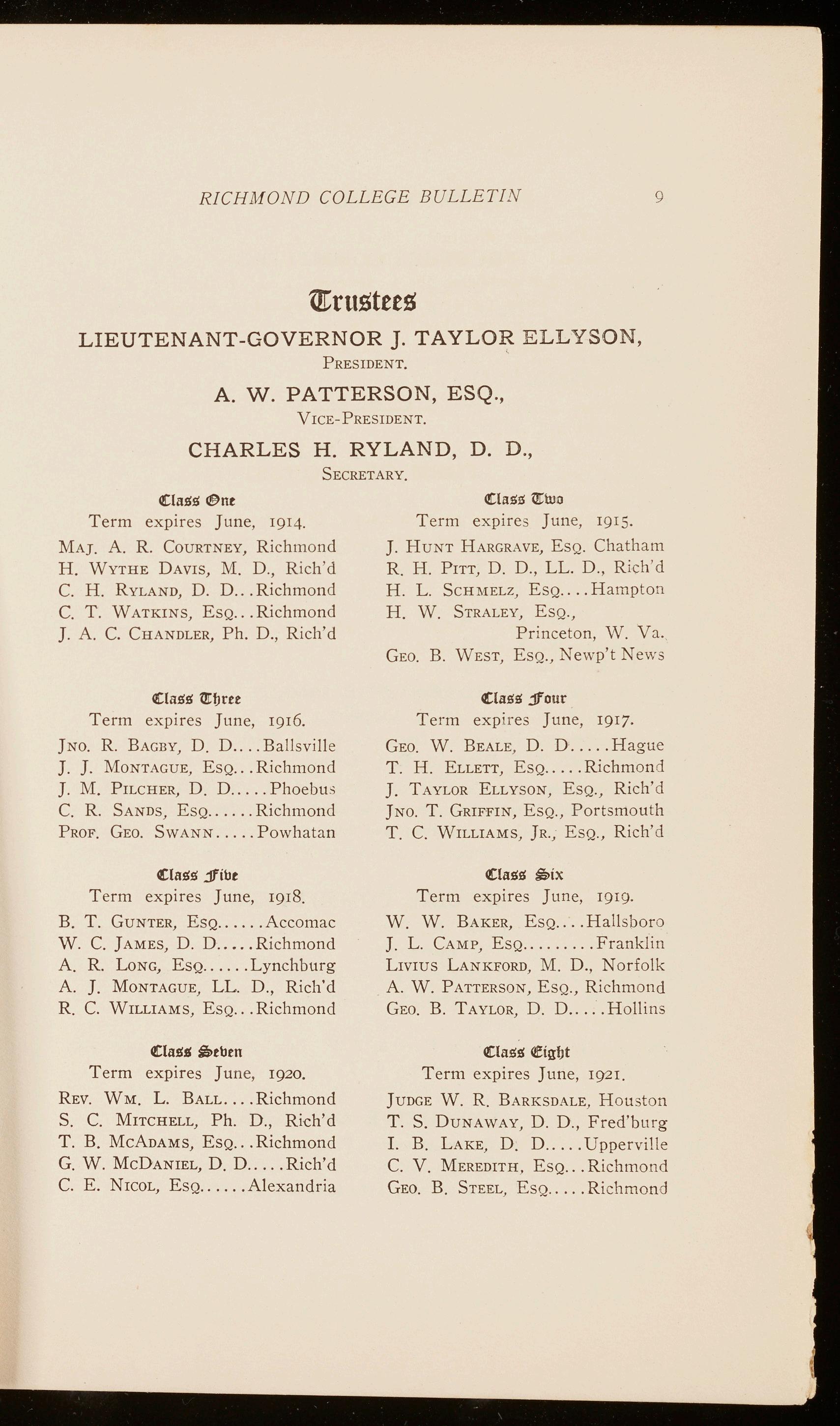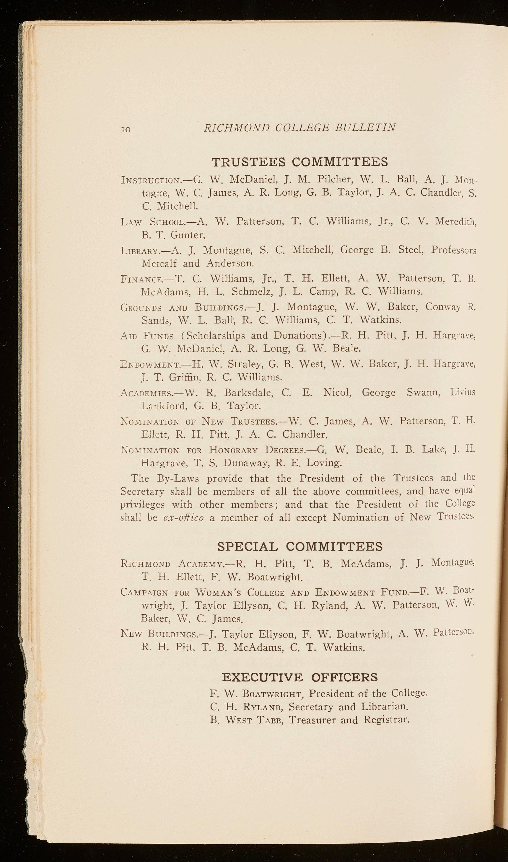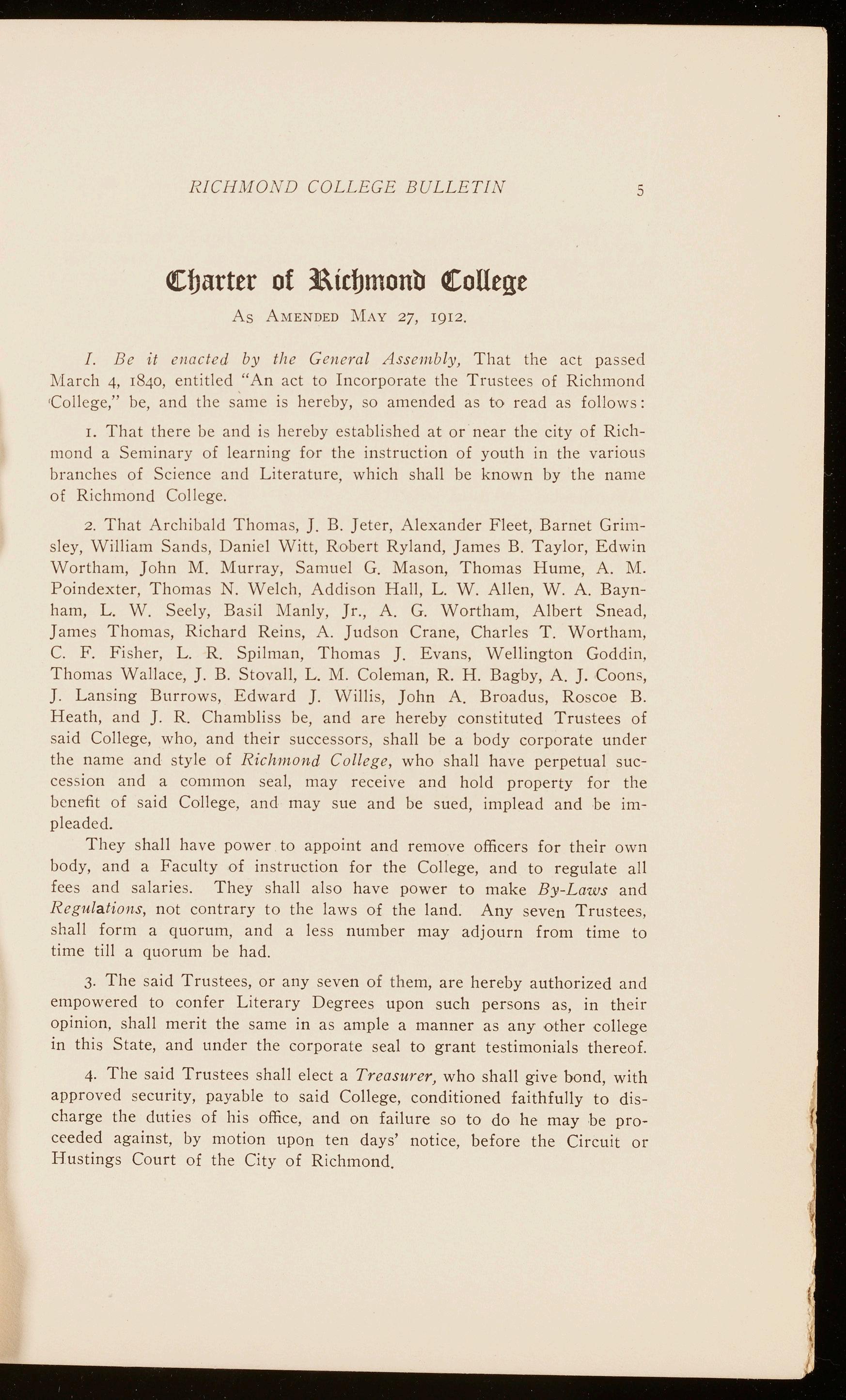2. That Archi bald Thoma s, J. B. Jet er , Alexander Fleet, Barnet Grims ley, William Sand s, Dani e l Witt, R obert Ryland, Jame s B. Taylor, Edwin Wortham, J ohn M. Murray, Samuel G. Ma son, Thomas Hurne, A. M. Poindexter, Thoma s N. Welch, Addi son Hall, L. W. Allen , W. A. Baynham, L. W. Seely, Ba s il Manly , Jr., A. G. Wortham, Albert Snead, Jame s Thoma s, Richard Rein s, A. Jud son Crane, Charl es T. Wortham, C. F . Fi sh er, L. R Spilman , Thoma s J. Evans, Wellington Goddin, Thomas Wallace, J. B. Stovall, L. M. Coleman, R. H. Bagby, A. J. Coon s, J. Lan s ing Burrow s, Edward J. Willi s, John A. Broadu s, Ro scoe B. Heath, a nd J. R. Chambliss be, and ar e hereby constituted Trustees of said College, who, and their successor s , shall be a body corporate under the nam e and style of Richmond College, who shall have perpetual succes sion and a common seal , may receive and hold property for the benefit of said College , and may sue and be sued, implead and be impleaded.