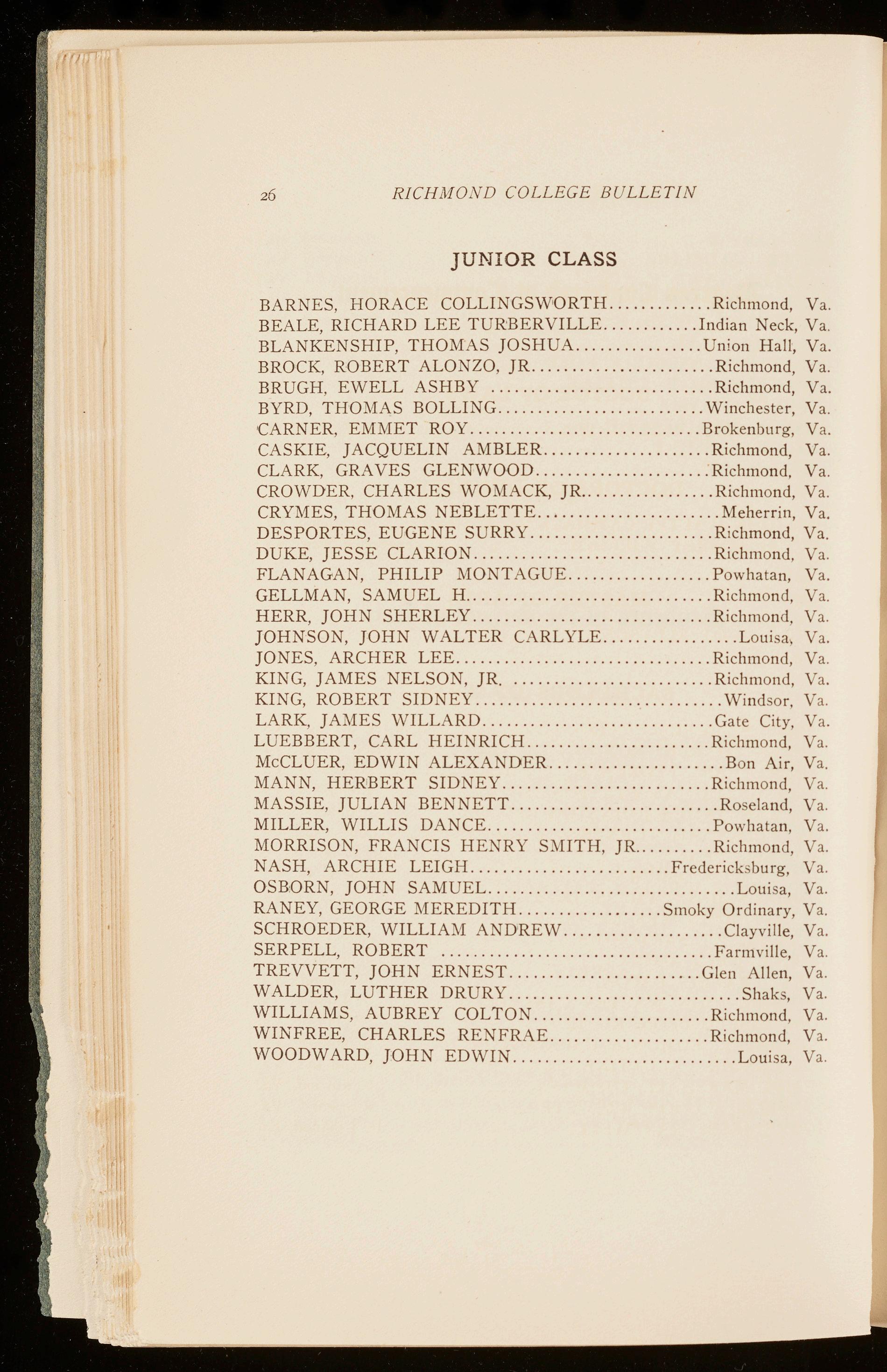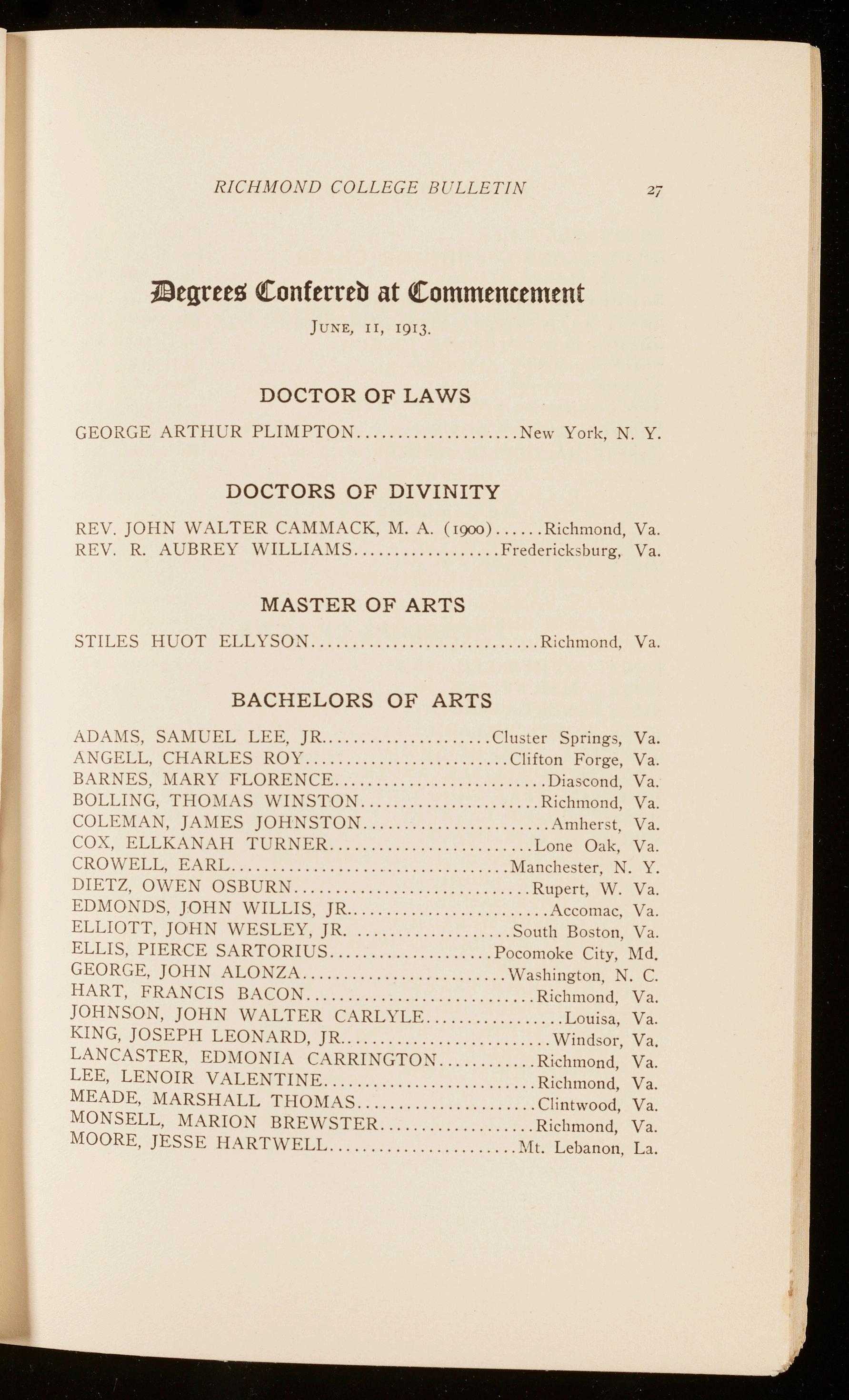 The annual s ermon was preached Sunday evening, June 8th, by Rev. Curtis Lee Laws, D. D., of New York City Monday was Cla s s Day, and the orators were Joseph Payne Snead, from the College of Liberal Arts, and Andrew Jackson Ellis, from the Law School. The historians were John Jordan Wicker, Jr., and P.A. L. Smith, Jr. Ellis Carl Primm was president of the class in Liberal Arts, and Thomas C. Fletcher of the Law Class.