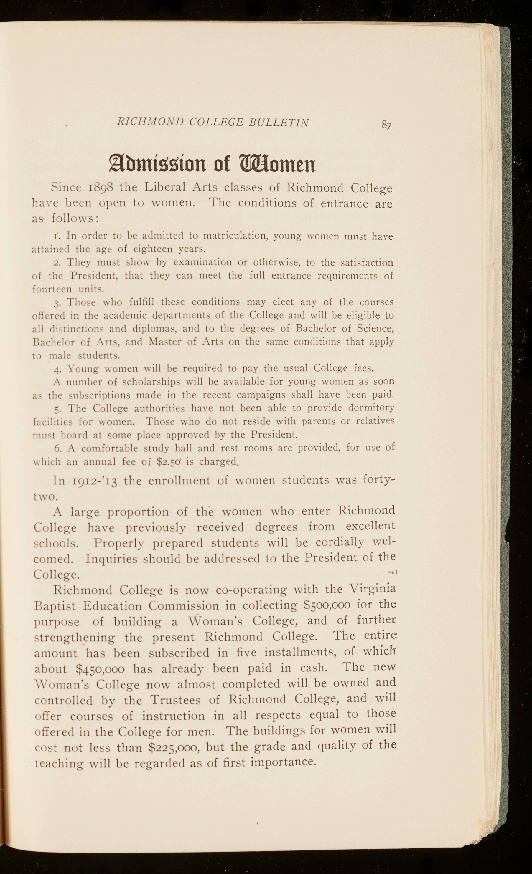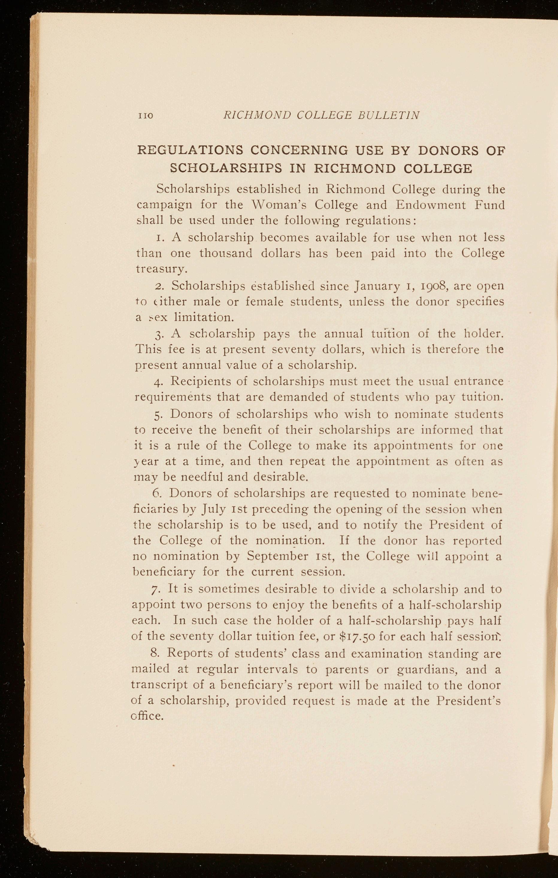Scholarships established in Richmond College during the campaign for the \Voman 's College and Endowment Fund shall be u sed under the following regulations: