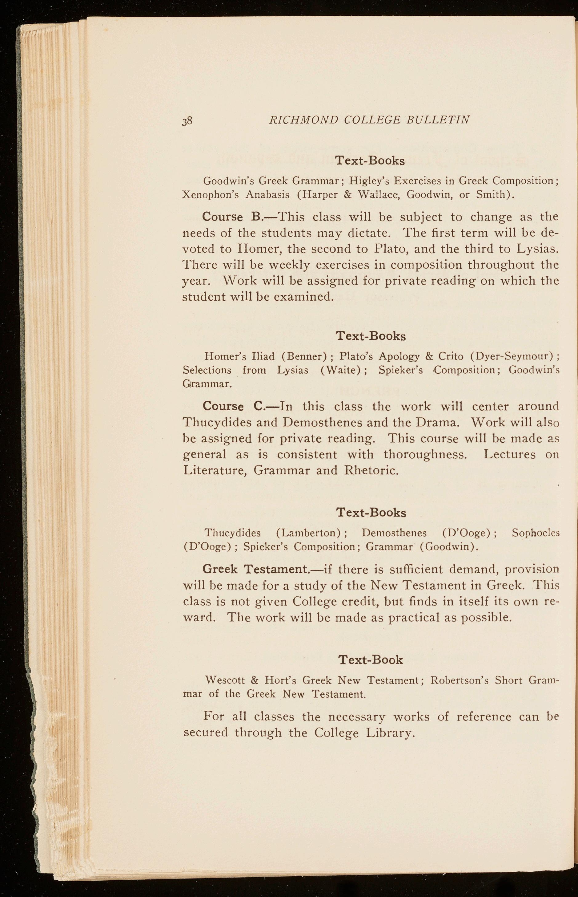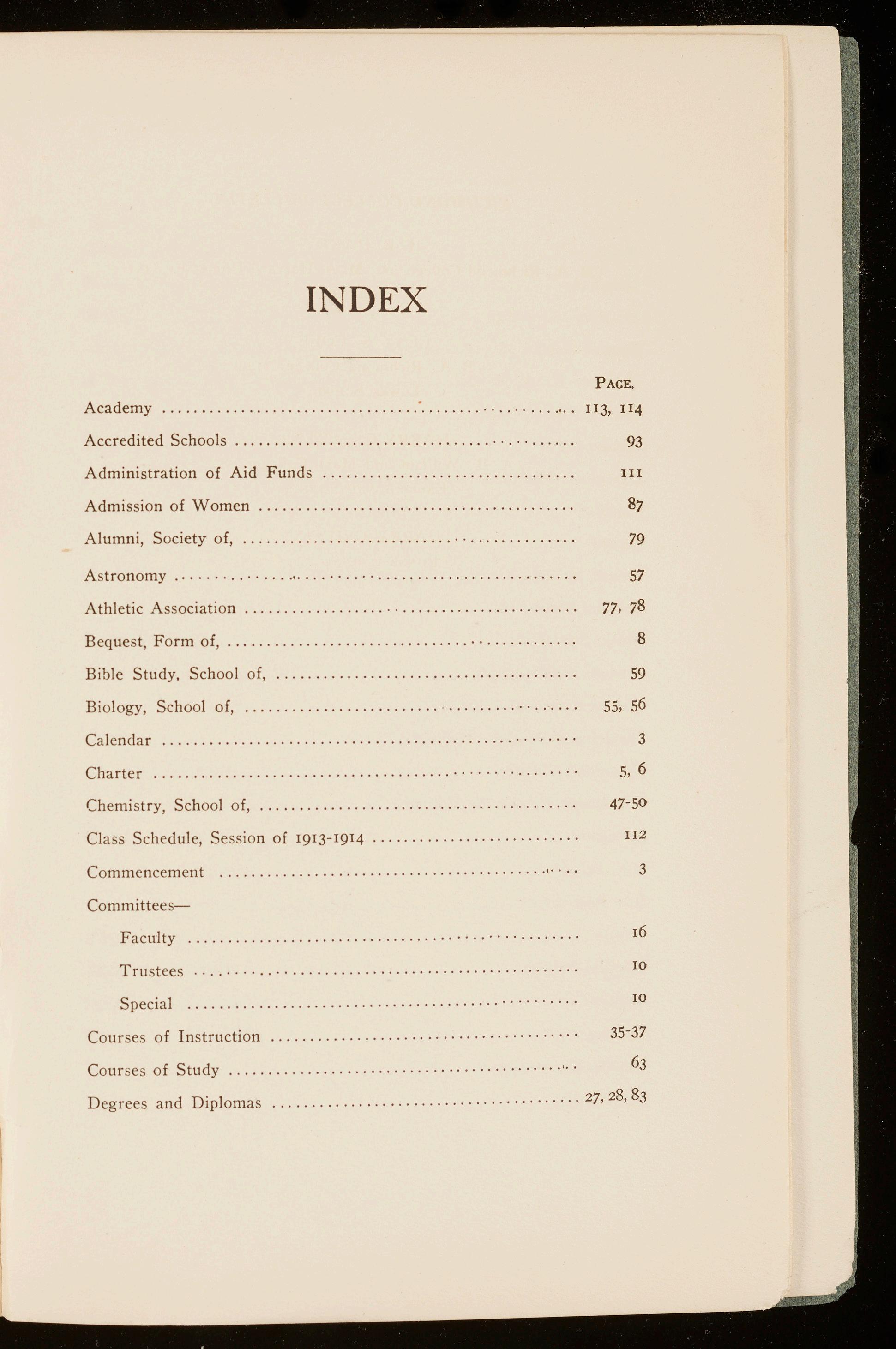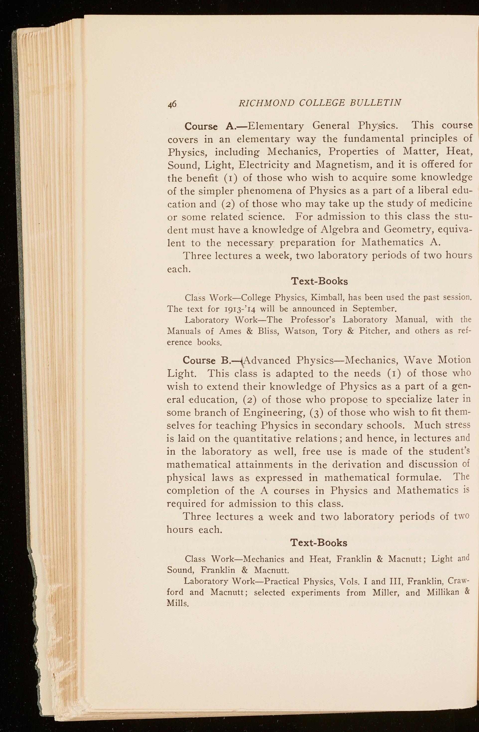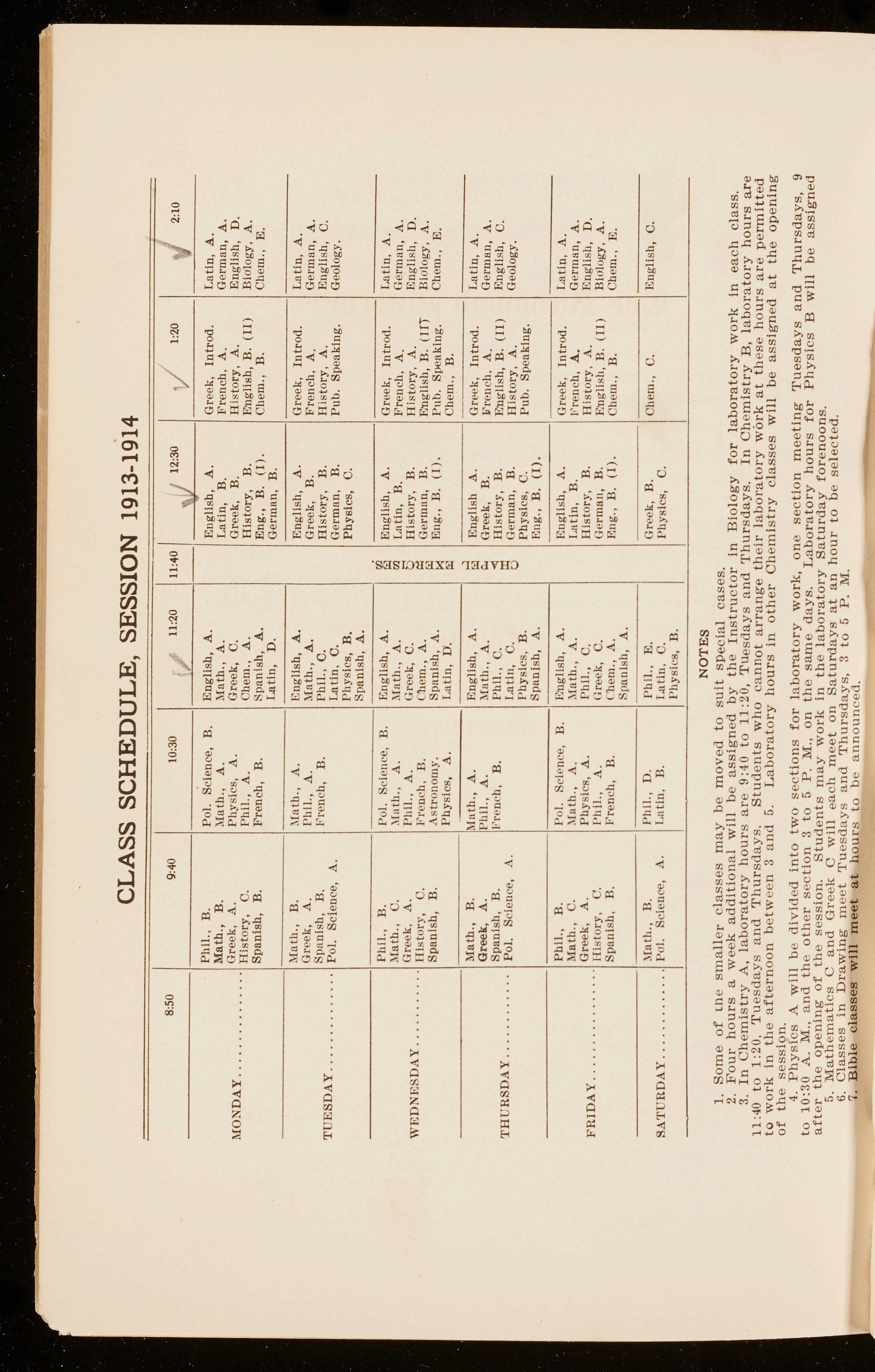 4. Physics A will be divid e d int o two sect ion s for l abora tor y work, on e section m ee ting Tuesdays and Thursdays, 9 to 10:30 A. M ., and th e other section 3 to 5 P. M., on th e same d ays. L a bor a tory hour s for Physics B will b e assigned af t er th e opening of th e session. Students may work In the l aboratory Saturday forenoons. 5. Mathematics C and Greek C wi ll eac h m ee t on Saturdays a t an hour t o b e se l ected. 6. Classes in Drawing meet Tuesdays and Thursdays, 3 to 5 P. M. 7. Bible classes will m ee t at hour s to be an noun ced.