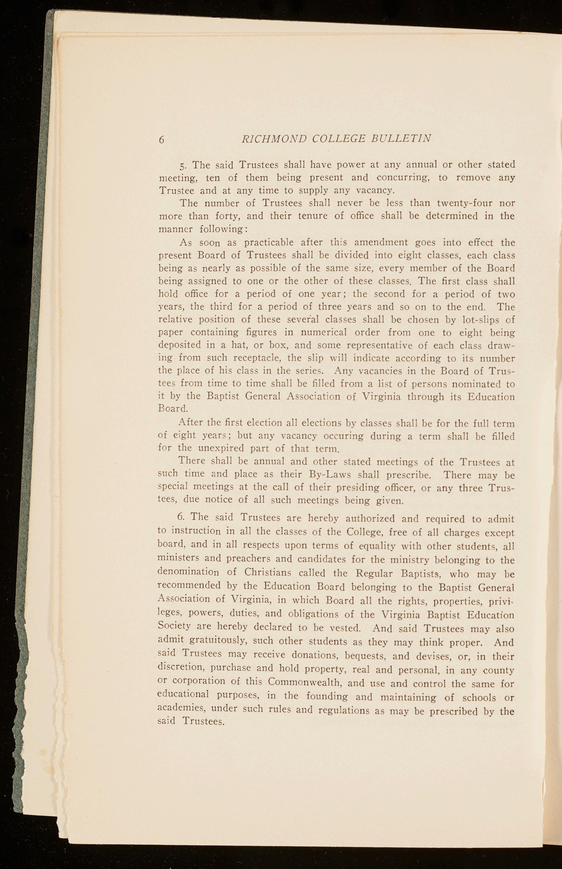 6. The said Tru stees are hereby authorized and required to admit to instruction in all the classes of the College, free of all charges except board, and in all respects upon terms of equality with other students, all ministers and preachers and candidates for the ministry belonging to the denomination of Christians called the Regular Baptists, who may be recommended by the Education Board belonging to the Bapti st General Association of Virginia , in which Board all the right s, properties, privileges, powers, duties, and obligation s of the Virginia Baptist Education Society are hereby declared to be vested. And said Tru s tees may also admit gratuitously, such other stude nts as they may think proper. And said Truste es may receive donation s, bequests, and devises , or, in their discretion, purchase and hold property, real and personal, in any county or corporation of this Commonwealth, and u se and control the same for educational purposes, in the founding and maintaining of schools or academies, under such rule s and regulati on s as may be pre scribed by the said Trustees.