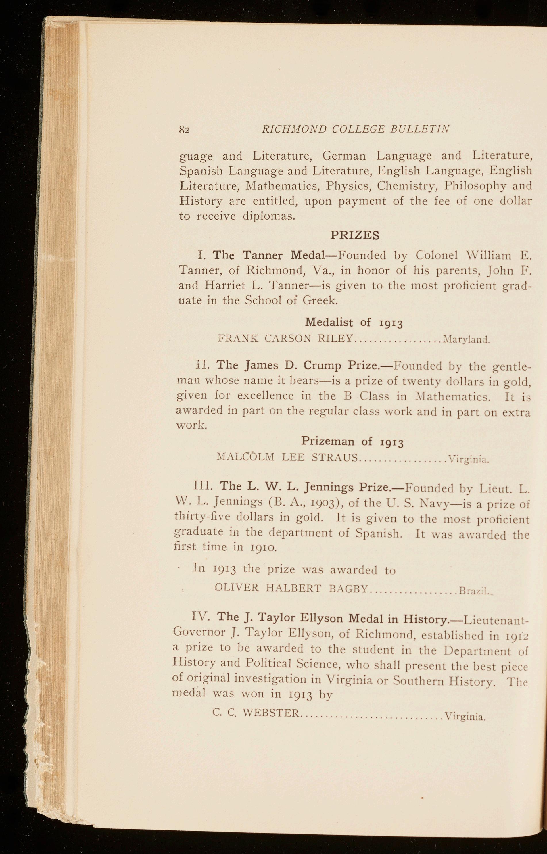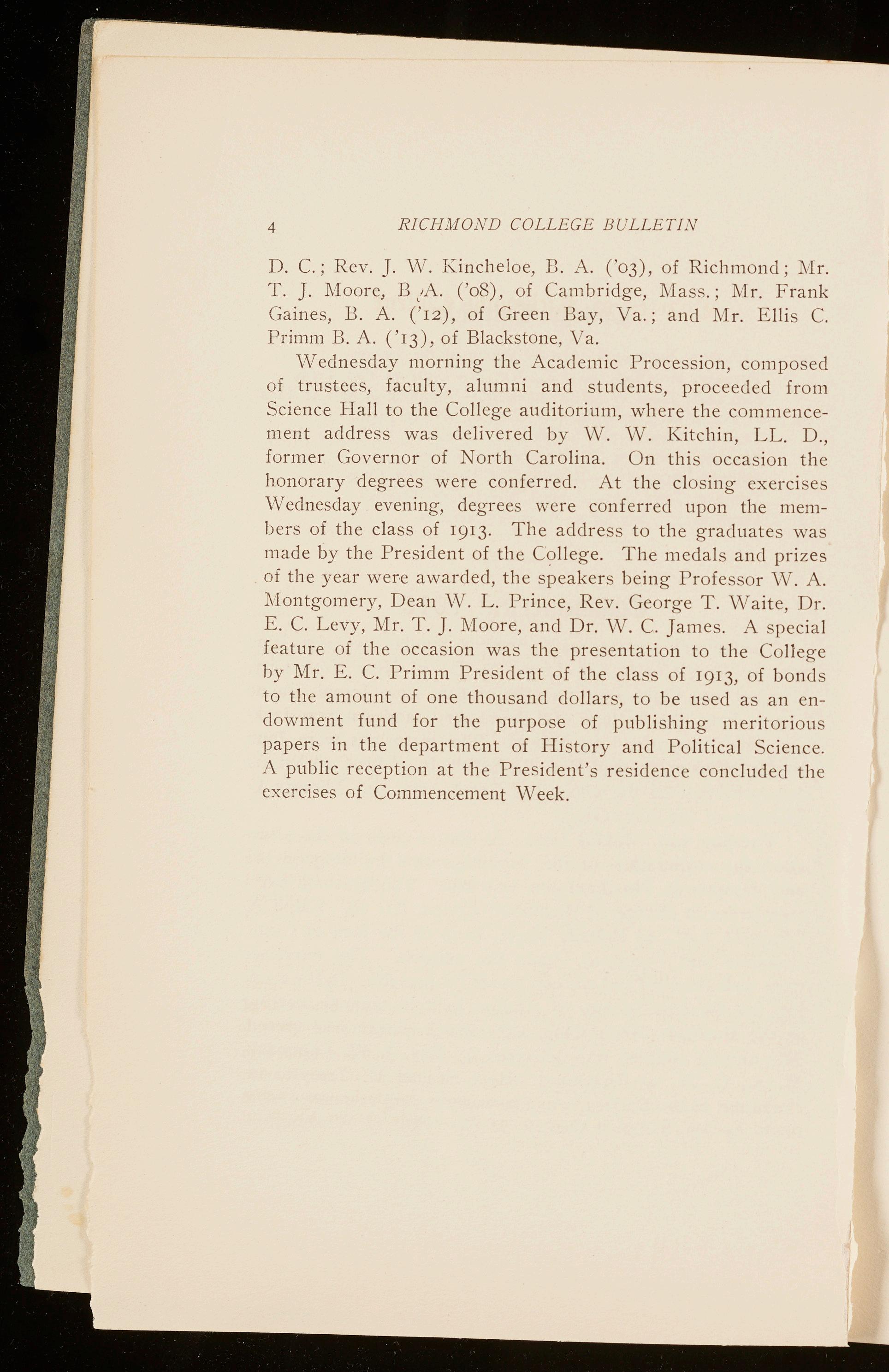 D. C.; Rev. J. \V. Kincheloe, D. A. ("03), of Richmond; l\Ir. T. J. l\Ioore, D c'A. ('08), of Cambridge, l\lass.; Mr. Frank Gaines, B. A. ('12), of Green Bay, Va.; and l\Ir. Ellis C. Primm B. A. ('13), of Blackstone, Va. \Vednesday morning the Academic Procession, composed of trustees, faculty, alumni and students, proceeded from Science Hall to the College auditorium, where the commence- ment address was delivered by vV. \V. Kitchin, LL. D., former Governor of North Carolina. On this occasion the honorary degrees were conferred. At the closing exercises vVednesclay evening, degrees were conferred upon the mem- bers of the class of 1913. The address to the graduates was made by the President of the College. The medals and prizes of the year wer •e awarded, the speakers being Professor vV. A. l\Iontgomery, Dean Vv. L. Prince, Rev. George T. \i\Taite, Dr. E. C. Levy, Mr. T. J. Moore, and Dr. \V. C. James. A special feature of the occasion was the presentation to the Coliege by Mr. E. C. Primm President of the class of 1913, of bonds to the amount of one thousand dollars, to be used as an en- dowment fund for the purpose of publishing meritorious papers in the department of History and Political Science. A public reception at the President's residence concluded the exerci es of Commencement Week.