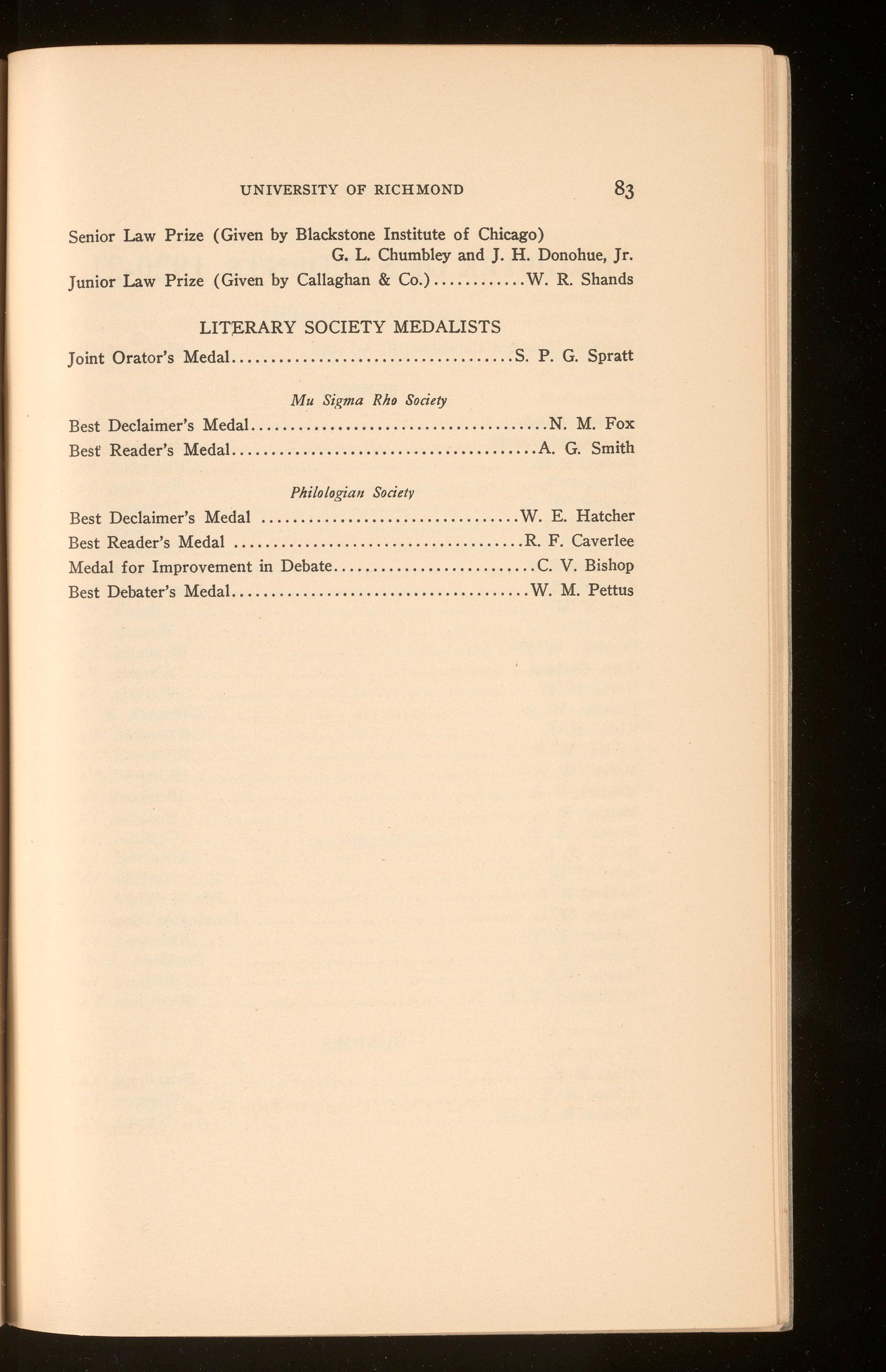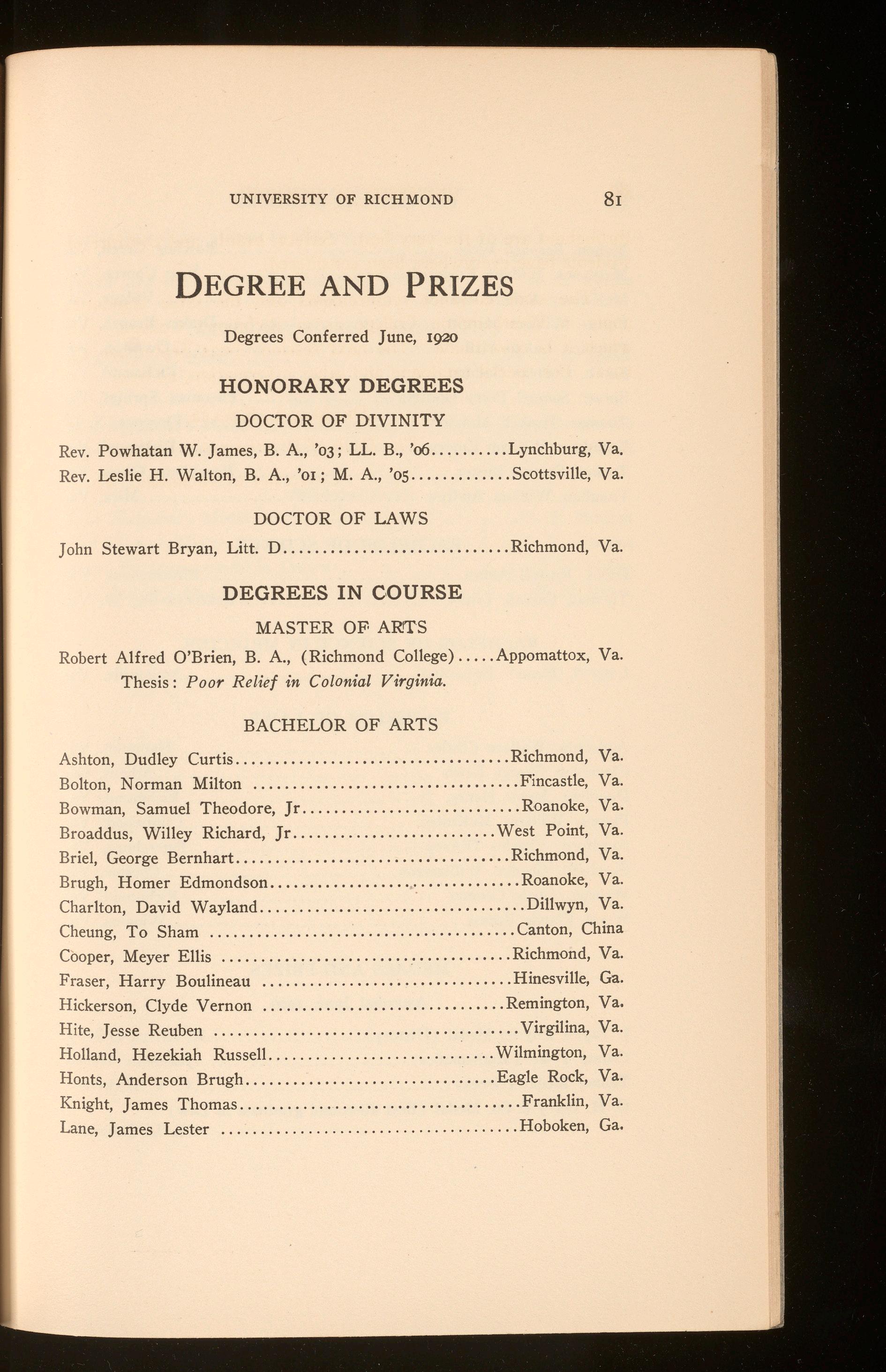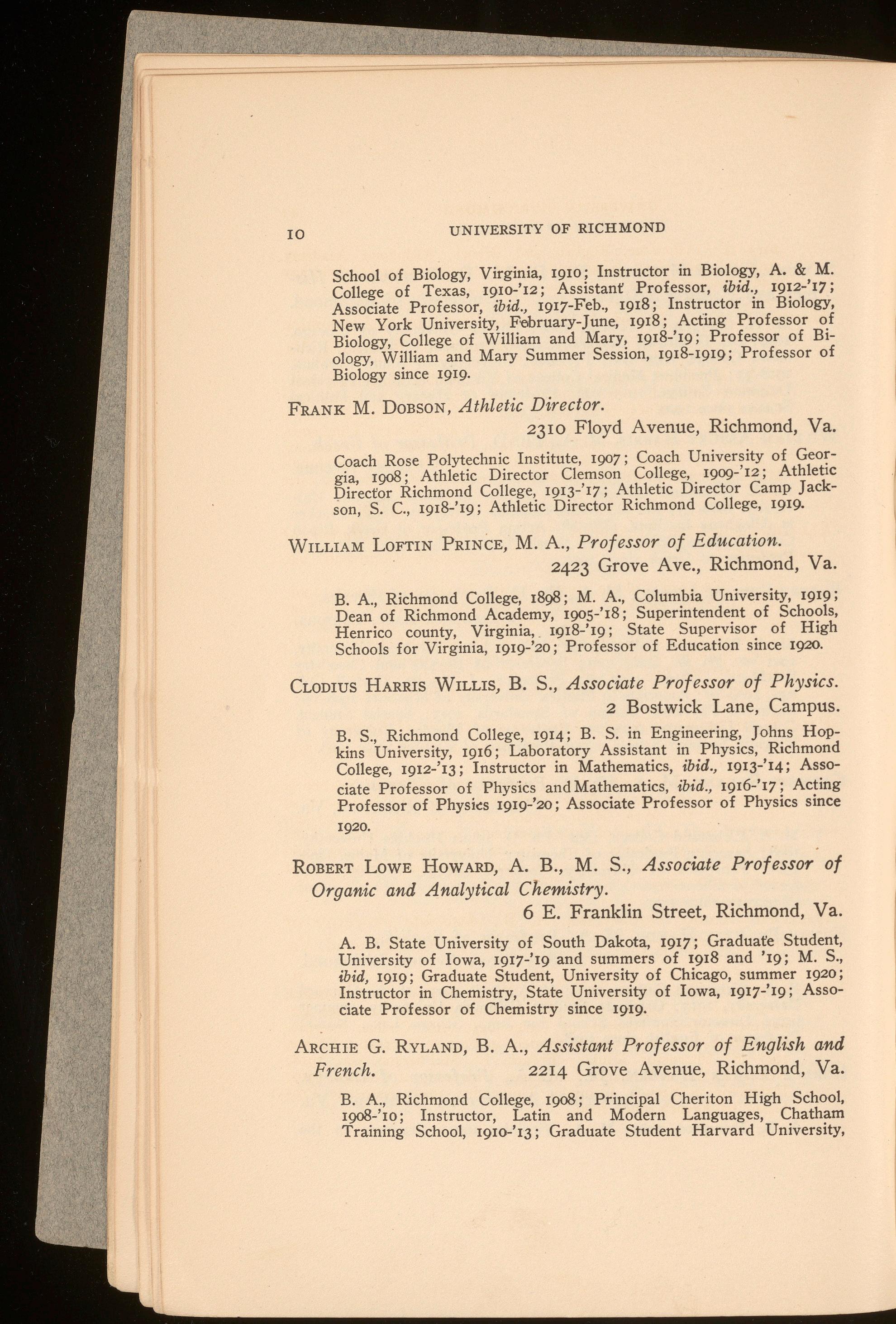 M . A. Richmond College, 1888; LL. D., Mercer University, 1895; LL. D., Georgetown College, 1913; LL. D., Baylor University, 1920; Assistant in Greek, Richmond College, 1887-'89; Student University of Halle and of the Sorbonne, 1889-'90; Professor of French and German since 189o; Student University of Leipsic, 1892; President sine~ 1895.