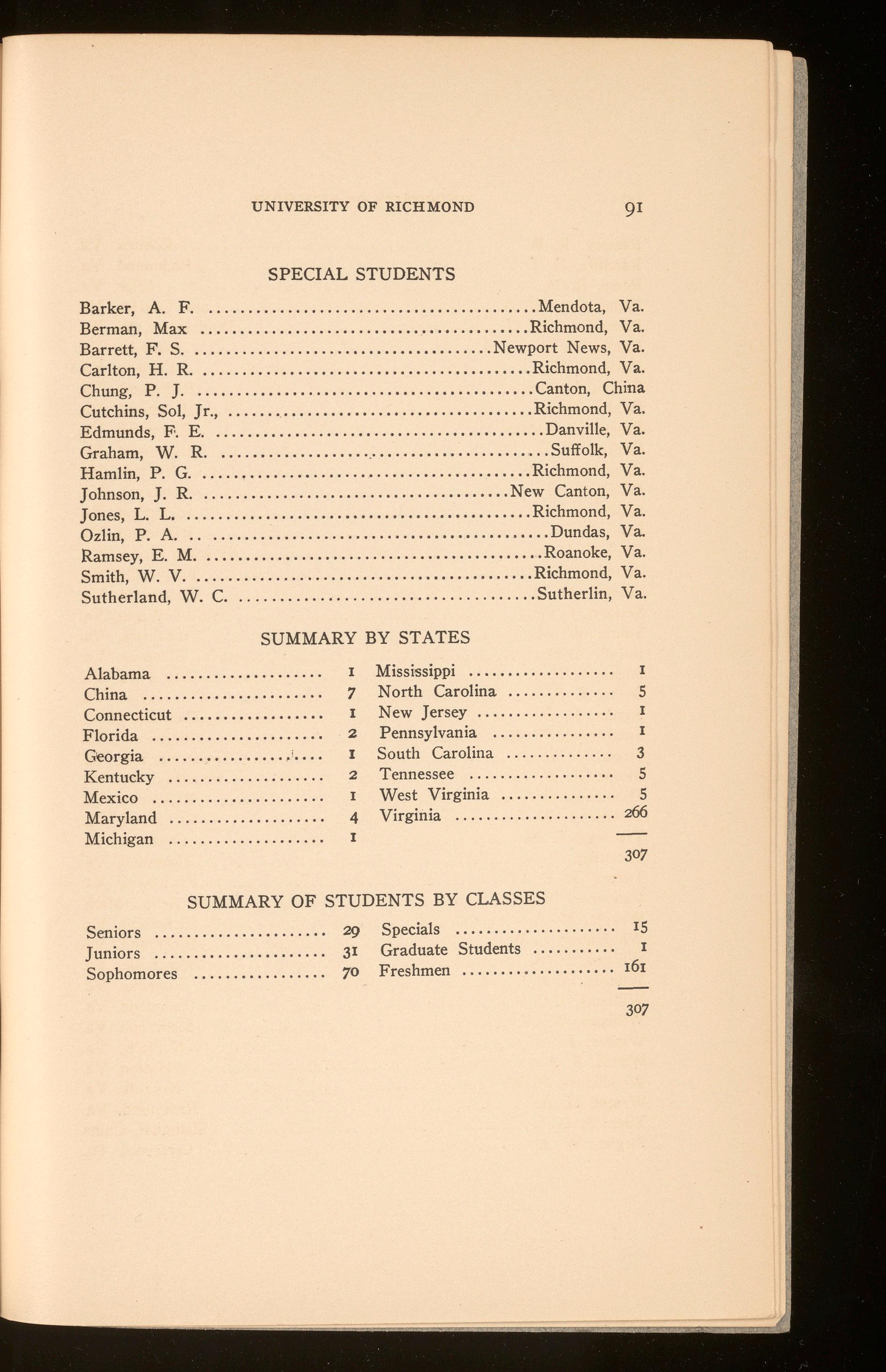 Barker, A. F ........................................... Mendota, Va. Berman, Max ..................•......•..••.•......•... Richmond, Va. Barrett, F. S.............................•.•....... Newport News, Va. Carlton, H. R. . .....................•.................•. Richmond, Va. Chung, P. J. ........................................... Canton, China