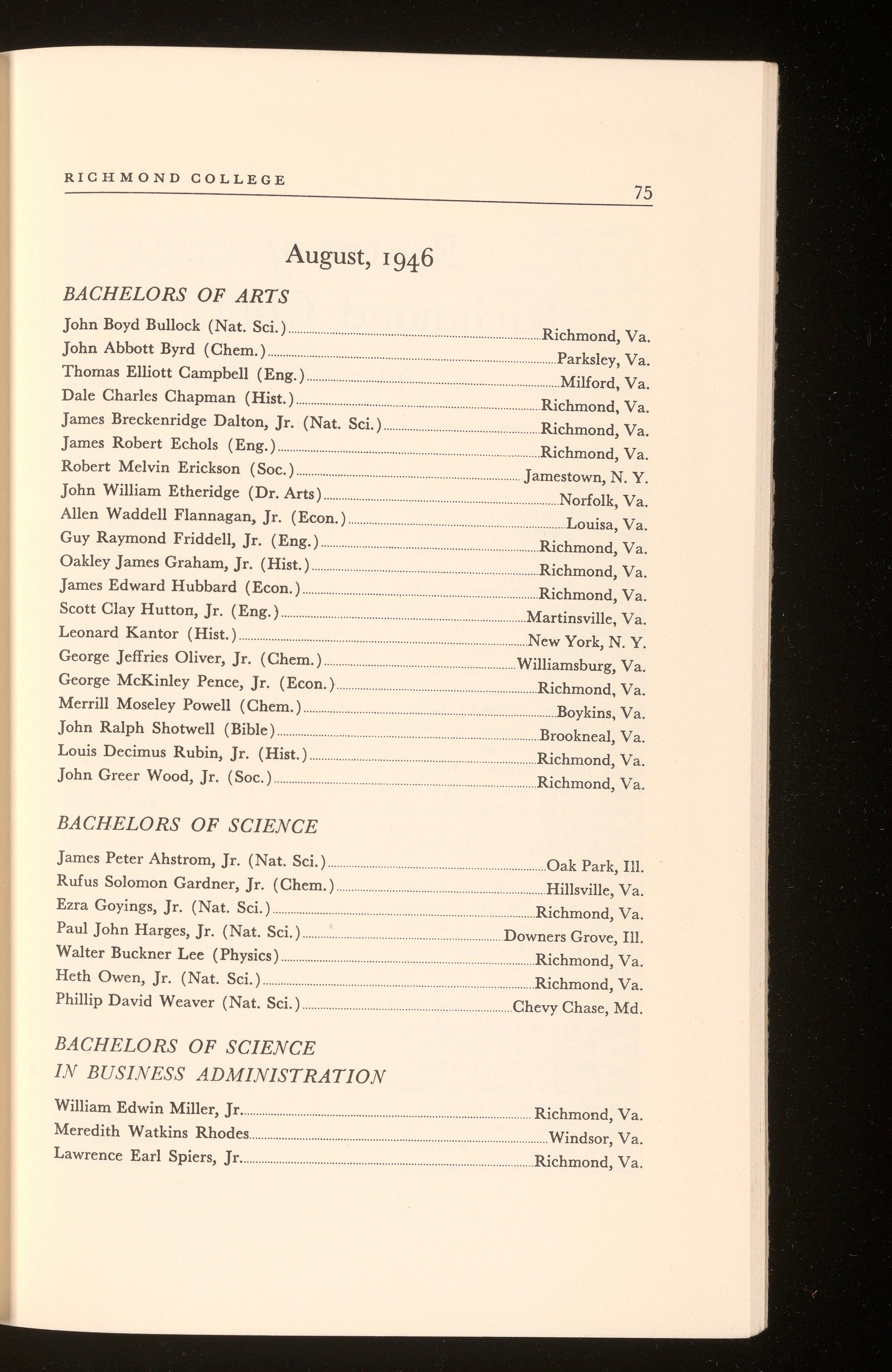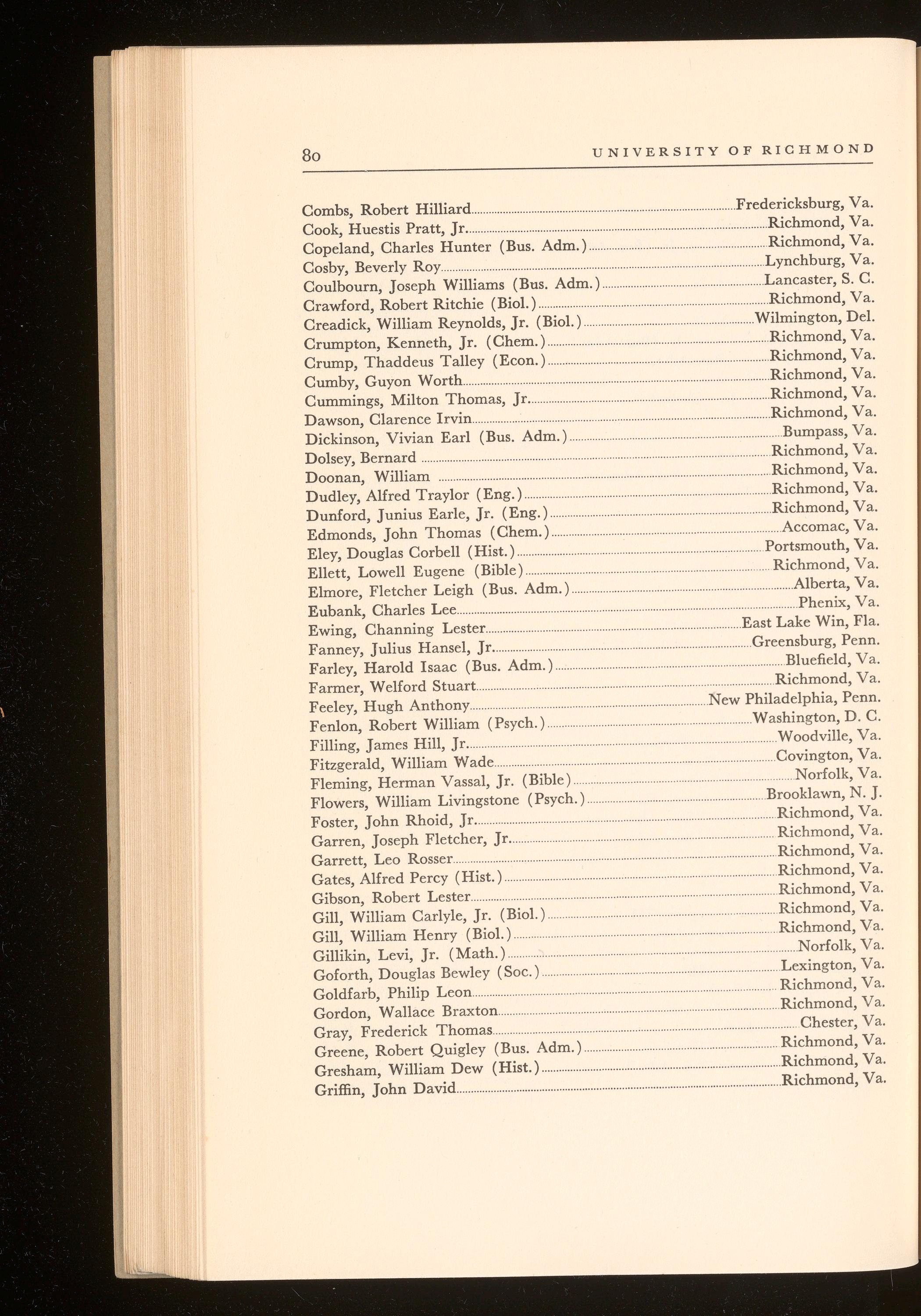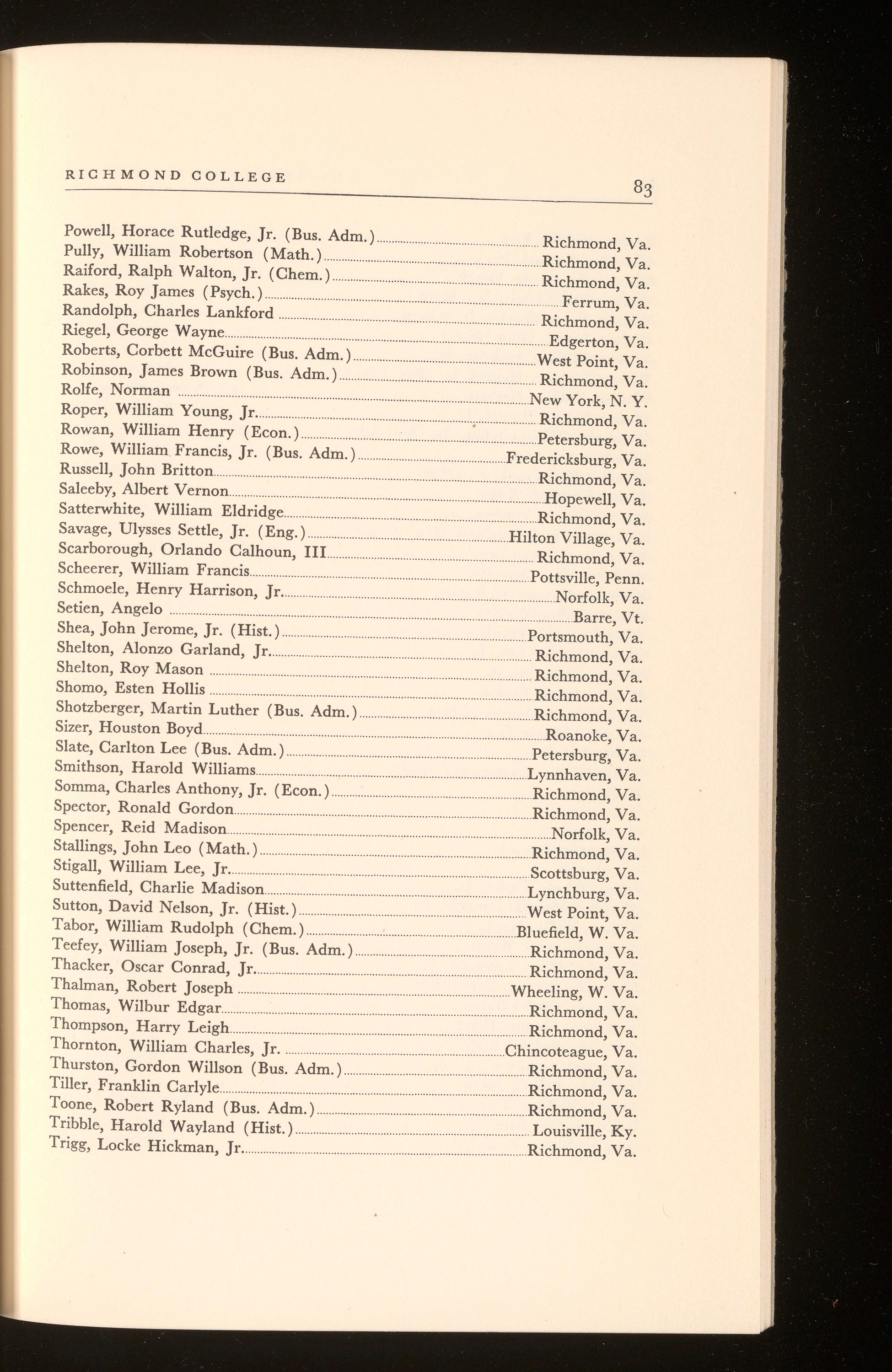 Whitzcre, Charles Glenvil .................. ......................... Bunker Hill, W Va White, Arthur Wilcox ...........................................................................Richmond, Va. White, David Franklin, Jr. ... ...................... ................. .. Richmond, Va. White, Elvin Wilson, Jr. ....... ..................... Front Royal, Va. White, Harold Eugene ............ ..................................................................Covington, Va . Whitt, Robert Alphin . ........................................................................Beulahville, Va. Wiley, Dougl as Walker .......................... .......... ......................Richmond, Va. Wilkinson, Thomas Ellsworth ............................................... ........Glen Allen, Va . Williams, Frank McKinley, Jr ......................... .....................................Fredericksburg, Va. Williams, Mac Dani el... ................................... ...... .................... Richmond, Va Williams, Reginald Wilson ...... ................... ...... .... ........................ Richmond, Va Williams, Stuart Dudley .......................... .... ...................... ......Richmond, Va. Williamson, James Faulkner.. ........... ......................Midlothian, Va. Wills, William Marshall. ......... .............Richmond, Va. Wilson, Eugene Consolvo ...... ..................... ...........Richmond, Va. Wiltshire, Richard Arrington . ...................... H enrico, Va. Winder, Raymond Clyde, Jr. . Richmond, Va. Wingfield, Richard Lewis ..........Appomattox, Va. Winn, William Edwin ..........Martinsville, Va. Winters, Austin Henry. . ...Richmond, Va. Wohlgemuth, Howard Malcolm ................Carter et, N. J. Wood, Raymond Christopher .... ....... ..... Cooper, Va. Wilson, James Donald ... .........Baltimore, Md. Woodfin, Paul Beverly, 11 ...............Roanoke, Va. Woods, Thomas Charles, Jr. Richmond, Va Woodward, Harry Manning, Jr ..........Louisa, Va. Woolford, David Royer .....................Richmond, Va. Wooten, Thomas Durrette ... .............Camden, S C. Wright, Walter Mason ... .............................. Glen Allen, Va . Yeamans, G eorge Thomas .. ...... ........ Richmond, Va. Yorgey, Merritt George ........................ ...... Richmond, Va.