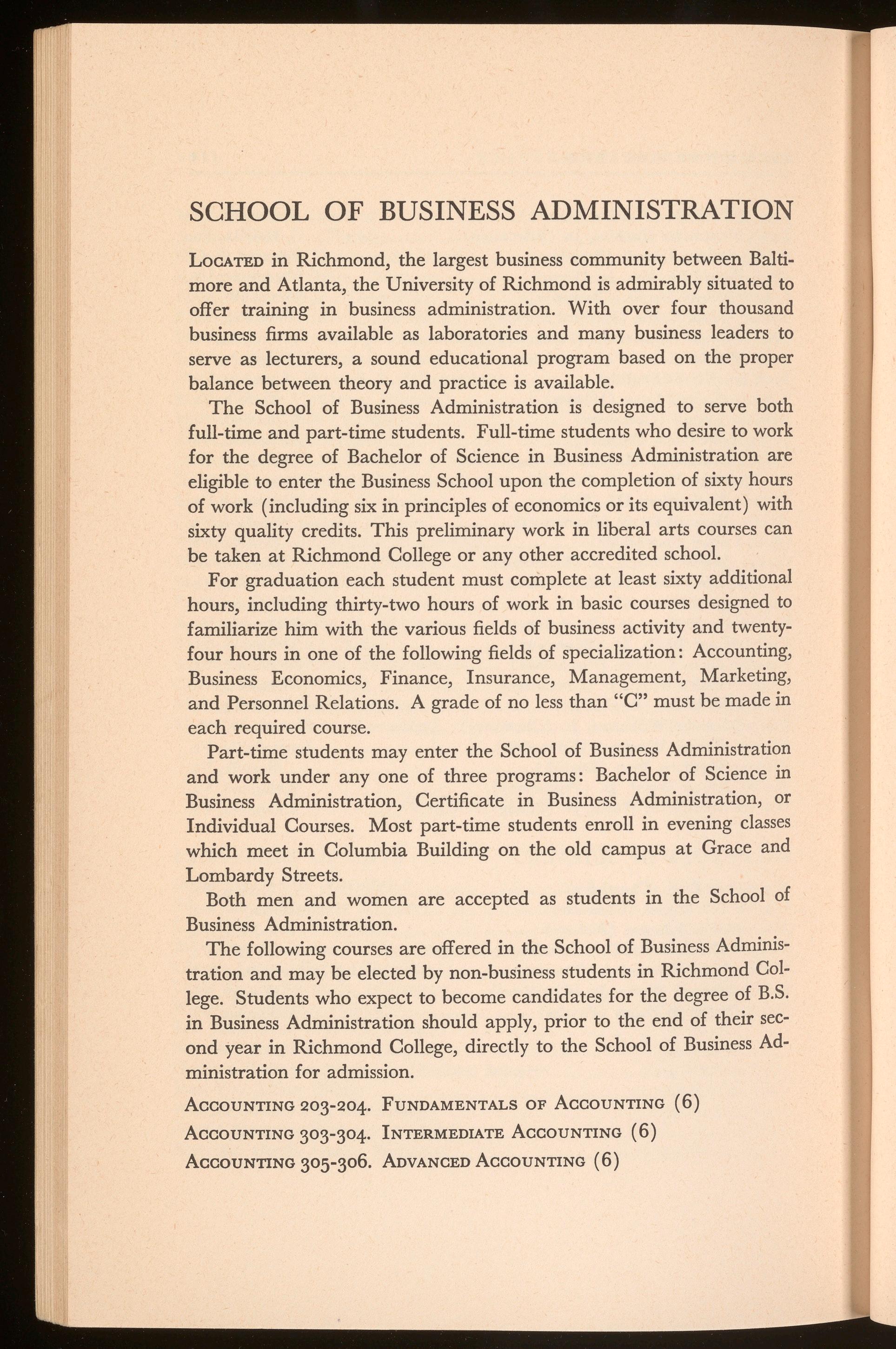 The School of Business Administration is designed to serve both full-time and part-time students. Full-time students who desire to work for the degree of Bachelor of Science in Business Administration are eligible to enter the Business School upon the completion of sixty hours of work (including six in principles of economics or its equivalent) with sixty quality credits. This preliminary work in liberal arts courses can be taken at Richmond College or any other accredited school.
