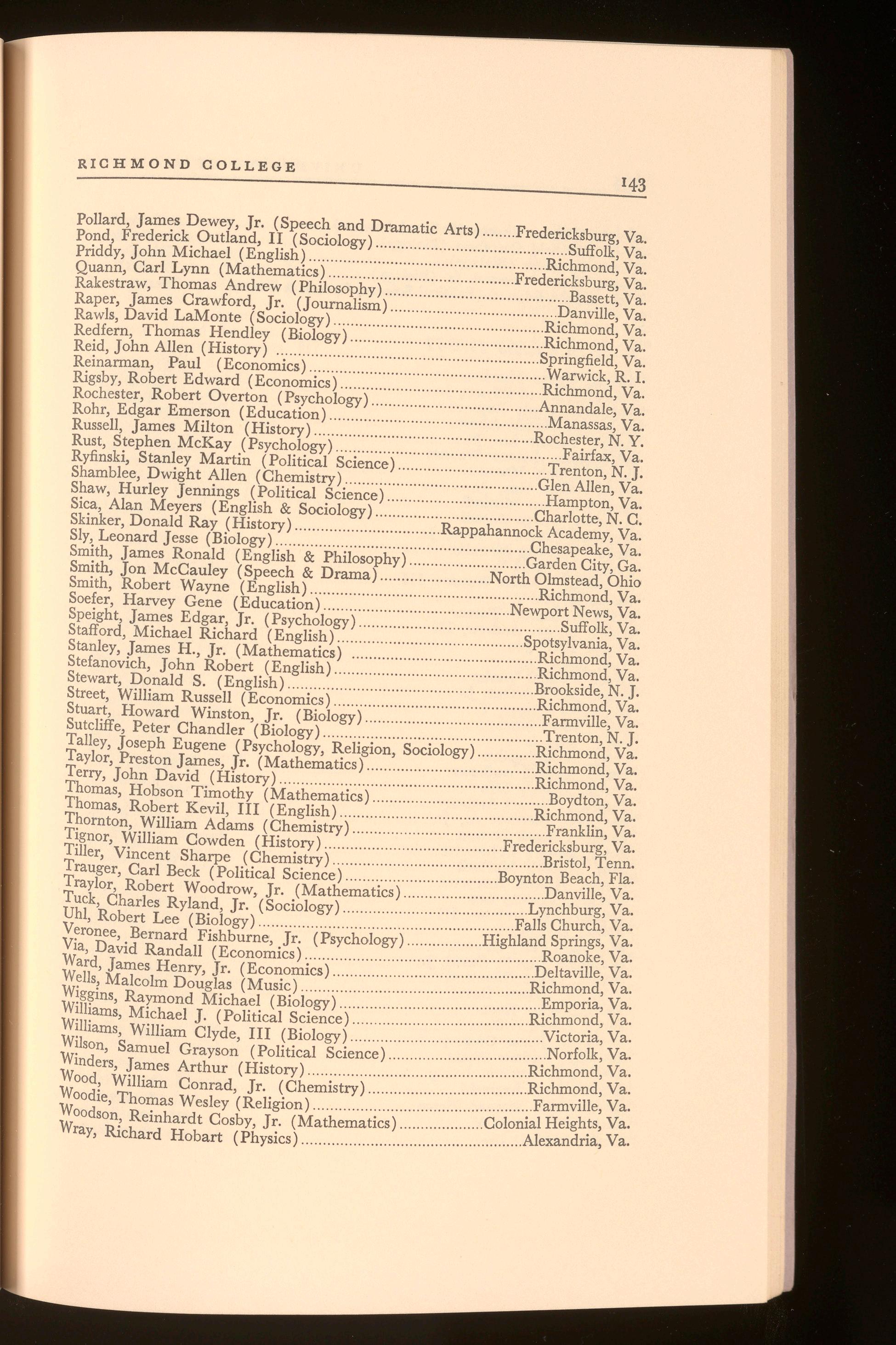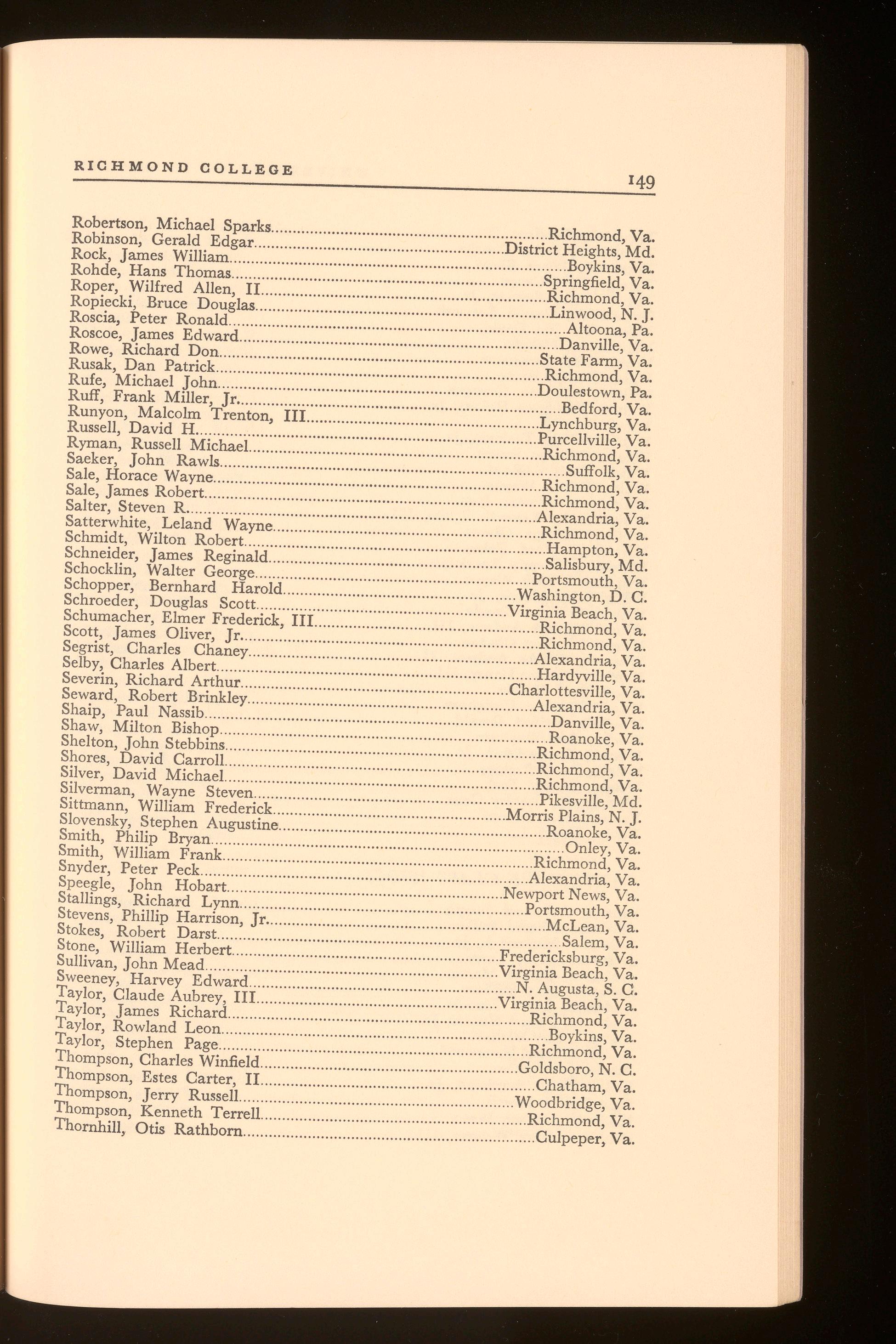 Reed, Edward Leon .................................................................................. Largo, Fla. Renney, James William, Jr ................................................................. Wakefield, Va. Reynolds, Wade Edward .................................................................... Summit, N. J. Rice, LeRoy Alton, Jr ................................................................. Mechanicsville, Va. Richani, Omar Kamel. ............................................................... Choueifat, Lebanon Richardson, Irvin Raine, III .............................................................. Danville, Va. Riddle, Aubrey Thomas, Jr ............................................................... Lynchburg, Va. Rieckehoff, Juan Adolfo ........................................................ San Juan, Puerto Rico