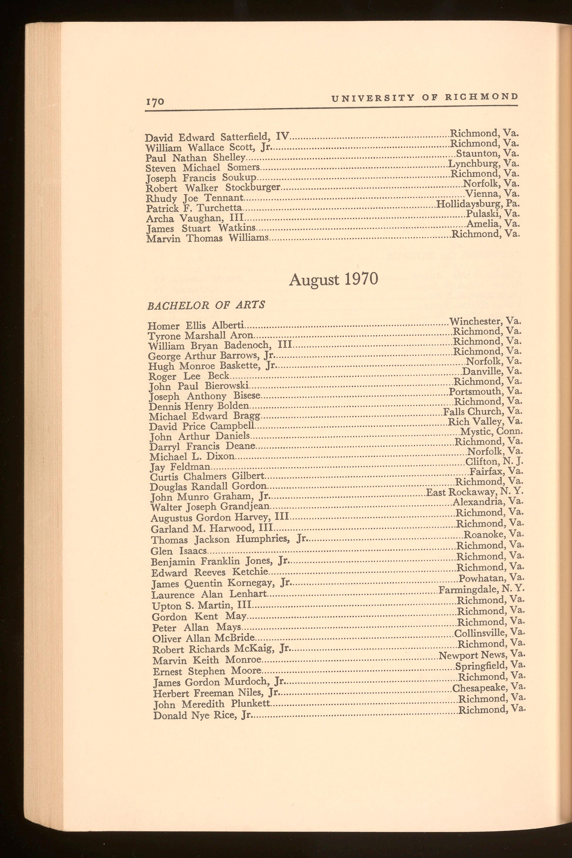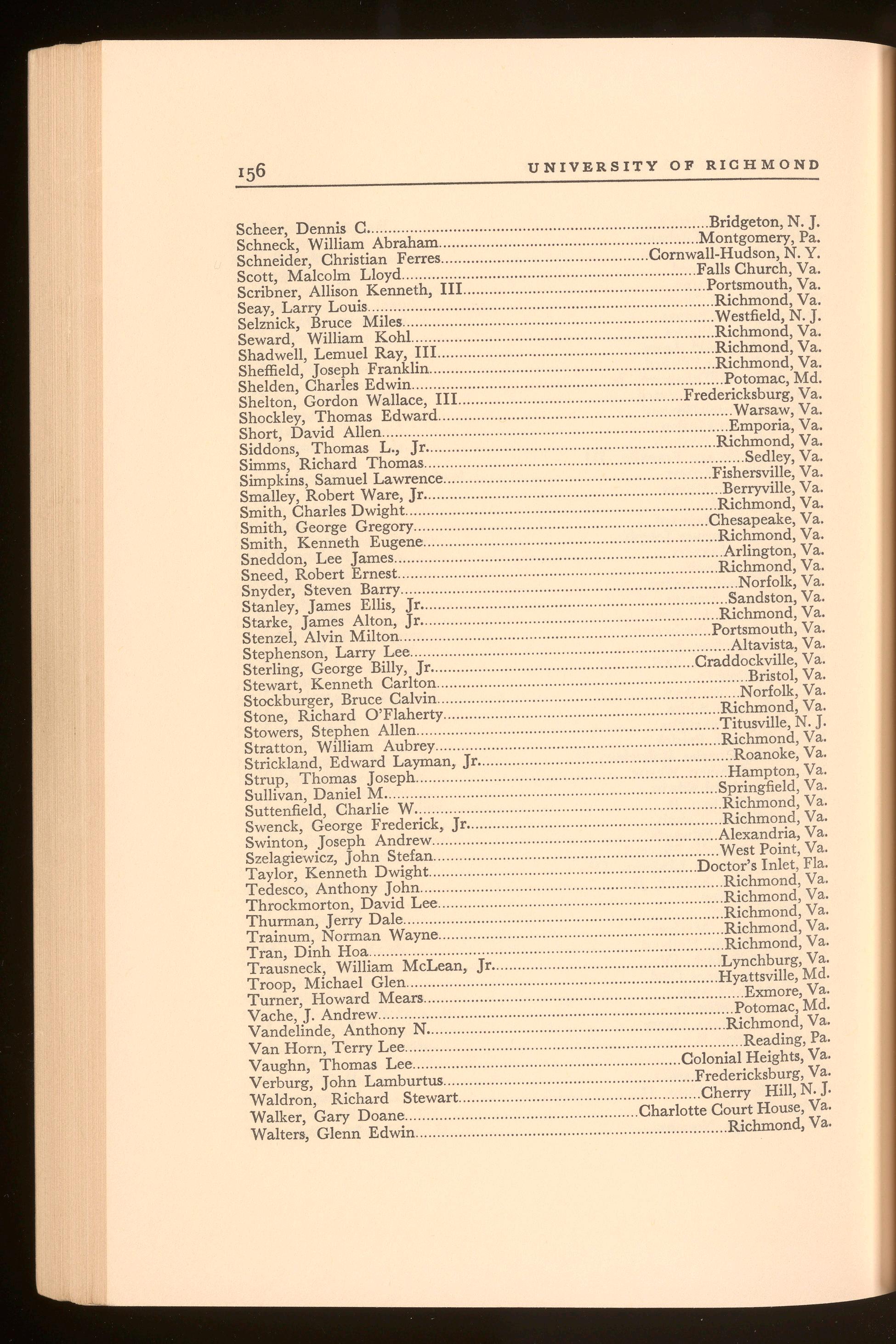 Dexheimer, Stephen Michael... ..................................................... Falls Church, Va. Dickinson, Vivian Earl, Jr ................................................ ....... .............. Mineral, Va. Dix, William Price ................................................................. ..... ..Silver Spring, Md. Doggett, Michael Scott ................ ... .............................................. Smithfield, Va. Doherty, Francis Joseph ...................... ........................................ Charlottesville, Va. Downer, Charles Montgomery .......................................................... Richmond, Va. Doyle, Louis Patrick ................. .......................................................... Hampton, Va. Doyle, Stephen R ......................................................................... Lawrenceville, Va. Duckhardt, Richard Woodson, Jr ..................................................... Richmond, Va. Dunn, Paul Crawford ....................... ........... .......................................... Capron, Va. Durell, Richard Bailey ........ ................................................................ Pipersville, Pa. Durrett, Davis Wertenbaker ........... .......................................... Richmond, Va. Edwards, Herbert Hampton, Jr ......................................................... Courtland, Va. Edwards, Weldon Ronald . ..................... ..... ......................... ........Richmond, Va. Eichenbrenner, Timothy John .......................................................... Hampton, Va. Elliott, Warren Douglas, Jr ............................................................... Richmond, Va. Emmons, John Graham .............................................................. Newport News, Va. Epstein, Jan Robert ............. .......... ................ ... ............................... Alexandria, Va. Eschenbach, John Steven .................................................................... Oradell, N. J. Ewalt, Thomas Barton ... ................... .................. ................ Prince Frederick, Md. Fallen, Gerald Edward .............................. .................................... ..Richmond, Va. Feibish, David Stephen ..... .... ..... ..... ................................. Richmond, Va. Felts, John Pate .................... ....................................................................... Ivor, Va. Ferrara, John Michael ................................... ......... ................... Alexandria, Va. Ferrell, Raymond Duke, Jr ............................................................. Martinsville, Va. Finn, Frederick Noel. ......................................................................... Richmond, Va. Fitchett, Steven Loyd ........................................................................ Richmond, Va. Flower s, William Harold, Jr ........ ....................................... ........... Purcellville, Va. Folaros, Peter Arthur ............... ............... ....... .................................. Petersburg, Va. Fox, Thomas Blankenship ............................................................ St. Petersburg, Fla. Francisco, Kenneth Lanier .............. ............. ................................. Keysville, Va. Funderburk, William Henry, Jr ................ .... ......................... Midlothian, Va. Gallos, Manuel Jordan .............................................................. Downer's Grove, Ill. Garfinkel, Harry Steven ................................. .................................... Hopewell, Va. Garne r, Russell Alan .... .................................................................... Chuckatuck, Va. Garnett, Brent Rogers .... .......... ..... ...... .................................. Drakes Branch, Va. Gates, Terry Allen ..................... ... .................................................. Bluefield, W. Va. Genier, Christopher Wayne ............. ..................... ...................... ..Richmond, Va. Gettier, Stacy Wood ........... ........... ............................ .......... .Youngstown, Ohio Gibson, Gary Edwin .. ................. ....... .... ........................................ Arlington, Va. Godsey, Edward Preston . .... ............................................................ Bristol, Va. Gordon, Martin Blackwell ..... ..................... ..... .......................... Chesapeake, Va. Gottshall, David Howard .... ............................................................ Waynesboro, Pa. Gouger, Howard Garland, 11.............................................................. Yorktown, Va. Graetzer, Eric Delore ................................................................ Tuxedo Park, N. Y. Graham, William Dwight ........... ............... ...... ............... ....... Richmond, Va. Green, Terry Lynn ........................................................................ Clifton Forge, Va. Haden, Mark Daniel. .................... .. ............ .... ................................. Nashville, Tenn. Hahn, Benji Mahlon ......... ..... ... .................................... Poquoson, Va. Haley, Joseph Kelly, 111.................................................................... Ft. Belvoir, Va. Hamblen, Allen M ............................................................................ .Lynchburg, Va. Hamilton, Phillip Andrew .......................................................... Newport News, Va. Hammond, John Brooke ..... .... ....................... ........... ....................... .Baltimore, Md. Hanlon, Daniel. ....................................................................................... Oakton, Va.