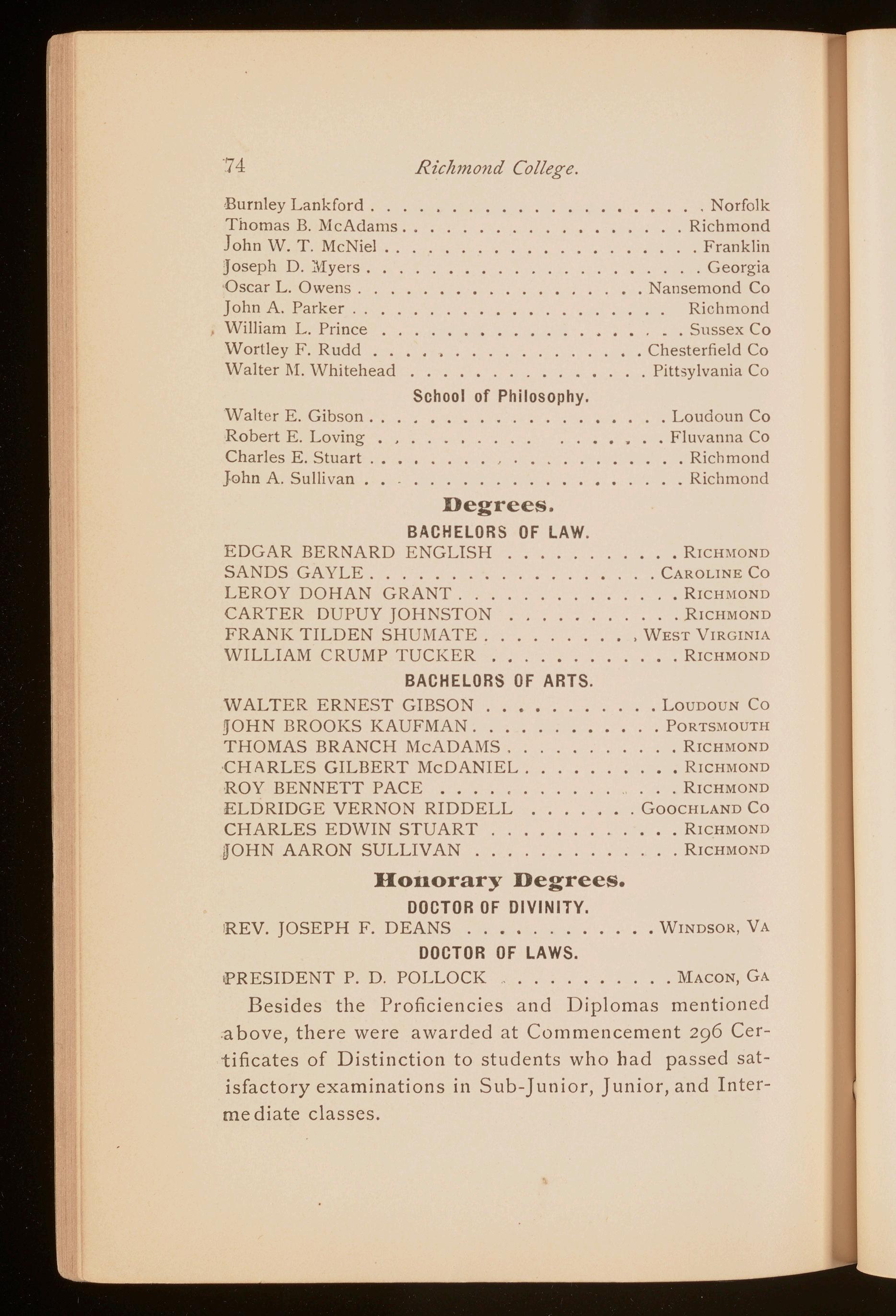 Besides the Proficiencies and Diplomas mentioned above, there were awarded at Commencement 296 Certificates of Distinction to students who had passed satisfactory examinations in Sub-Junior, Junior, and Intermediate classes.