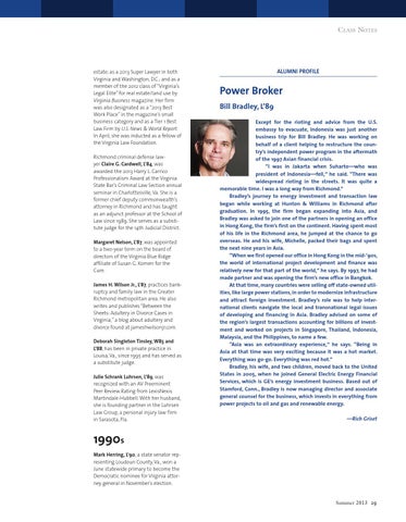 Power Broker Bill Bradley, L’89 Except for the rioting and advice from the U.S. embassy to evacuate, Indonesia was just another business trip for Bill Bradley. He was working on behalf of a client helping to restructure the country’s independent power program in the aftermath of the 1997 Asian financial crisis. “I was in Jakarta when Suharto—who was president of Indonesia—fell,” he said. “There was widespread rioting in the streets. It was quite a memorable time. I was a long way from Richmond.” Bradley’s journey to energy investment and transaction law began while working at Hunton & Williams in Richmond after graduation. In 1995, the firm began expanding into Asia, and Bradley was asked to join one of the partners in opening an office in Hong Kong, the firm’s first on the continent. Having spent most of his life in the Richmond area, he jumped at the chance to go overseas. He and his wife, Michelle, packed their bags and spent the next nine years in Asia. “When we first opened our office in Hong Kong in the mid-’90s, the world of international project development and finance was relatively new for that part of the world,” he says. By 1997, he had made partner and was opening the firm’s new office in Bangkok. At that time, many countries were selling off state-owned utilities, like large power stations, in order to modernize infrastructure and attract foreign investment. Bradley’s role was to help international clients navigate the local and transnational legal issues of developing and financing in Asia. Bradley advised on some of the region’s largest transactions accounting for billions of investment and worked on projects in Singapore, Thailand, Indonesia, Malaysia, and the Philippines, to name a few. “Asia was an extraordinary experience,” he says. “Being in Asia at that time was very exciting because it was a hot market. Everything was go-go. Everything was red hot.” Bradley, his wife, and two children, moved back to the United States in 2005, when he joined General Electric Energy Financial Services, which is GE’s energy investment business. Based out of Stamford, Conn., Bradley is now managing director and associate general counsel for the business, which invests in everything from power projects to oil and gas and renewable energy. —Rich Griset