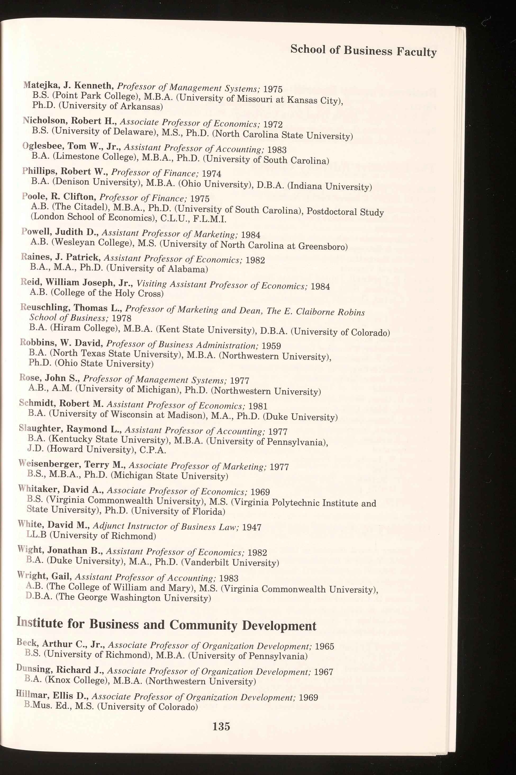 The University's business school in 1979 was named The E. Claiborne Robins School of Business in honor of the University's distinguished trustee and benefactor. The graduate school of business in 1978 was named to honor Richard S. Reynolds. Both are housed in this 1961 building made possible by a substantial bequest of L. U. Noland, a Newport News businessman. A wing completed in 1984 en- hances the building's capacity.
