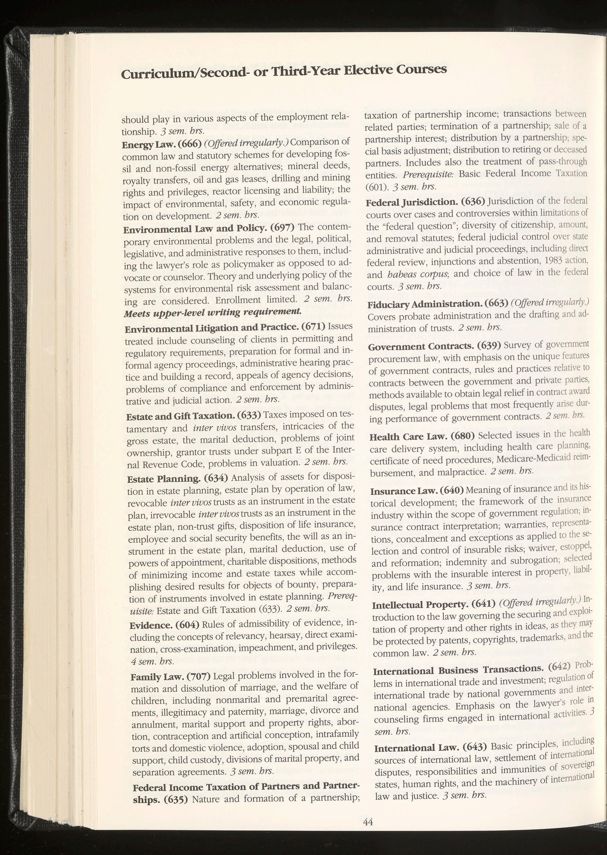 Energy Law. ( 666) (Offered irregularly.) Comparison of common law and statutory schemes for developing fossil and non-fossil energy alternatives; mineral deeds , royalty transfers , oil and gas leases , drilling and mining rights and privileges, reactor licensing and liability; the impact of environmental, safety, and economic regulation on development. 2 sem. hrs.