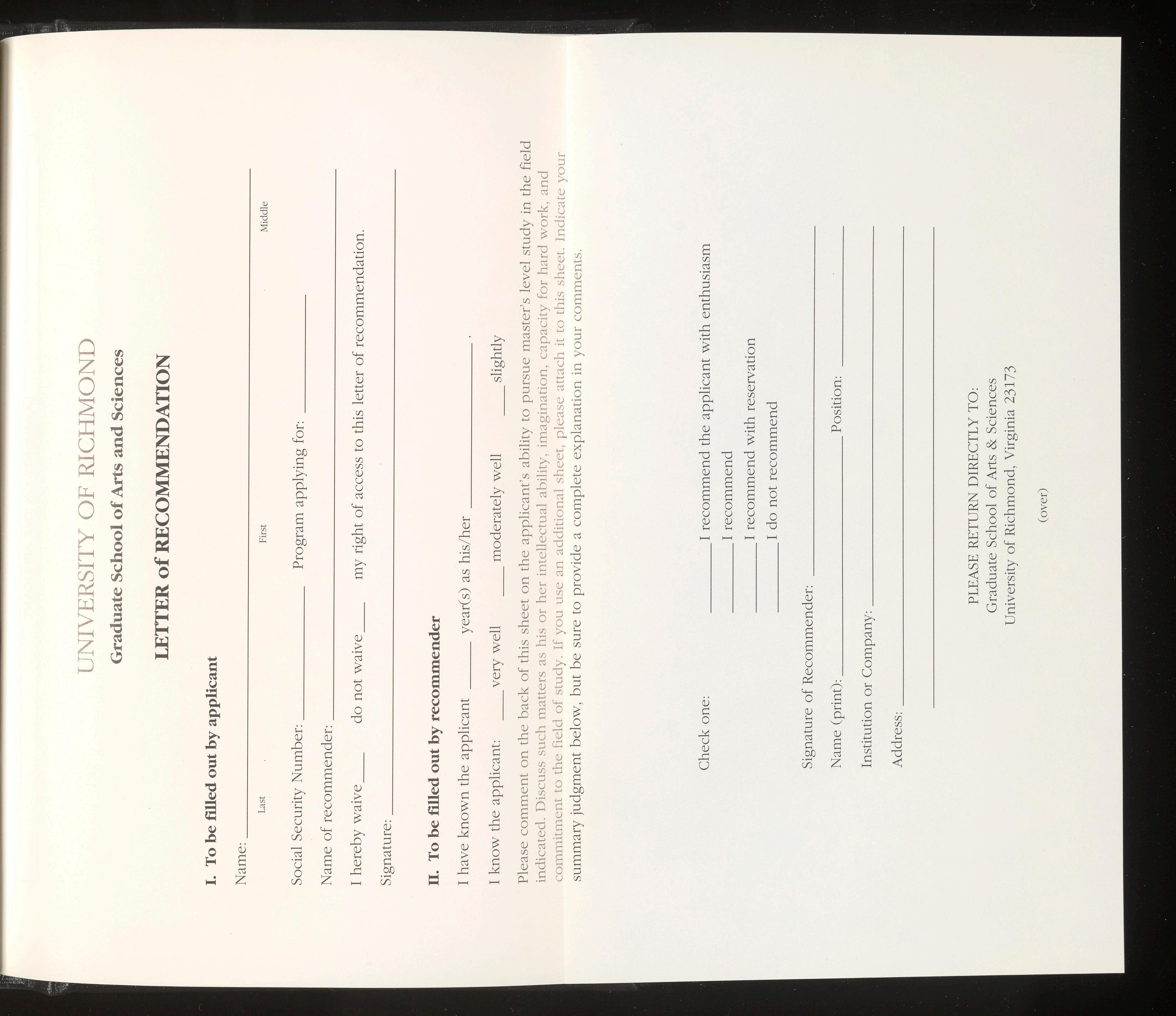 RICHMOND Graduate School of Arts and Sciences LETTER of RECOMMENDATION