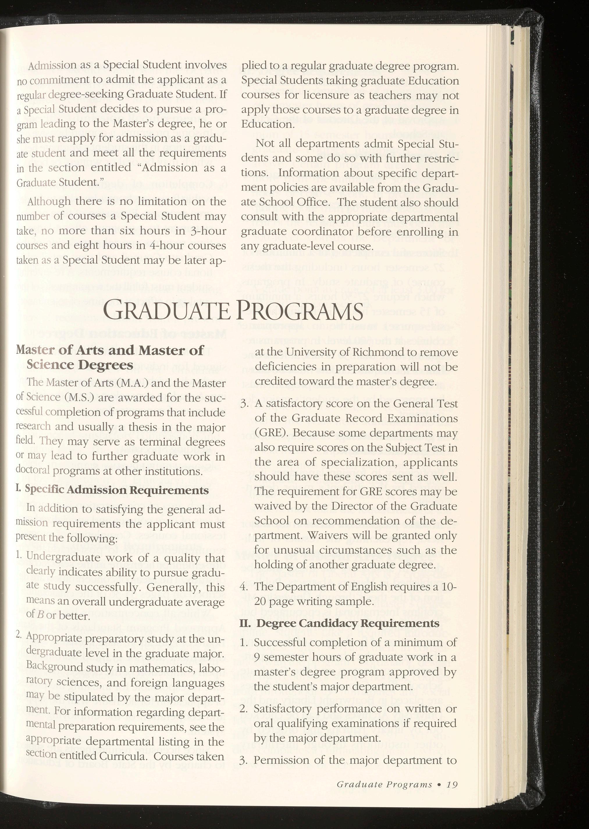 The Graduate School at the University of Richmond offers programs leading to the Master of Alts in English, histo1y, and psychology; the Master of Education; the Masterof Science in biology; the Master of LiberalArts; the Master of Sport Management; andthe Master of Teaching.