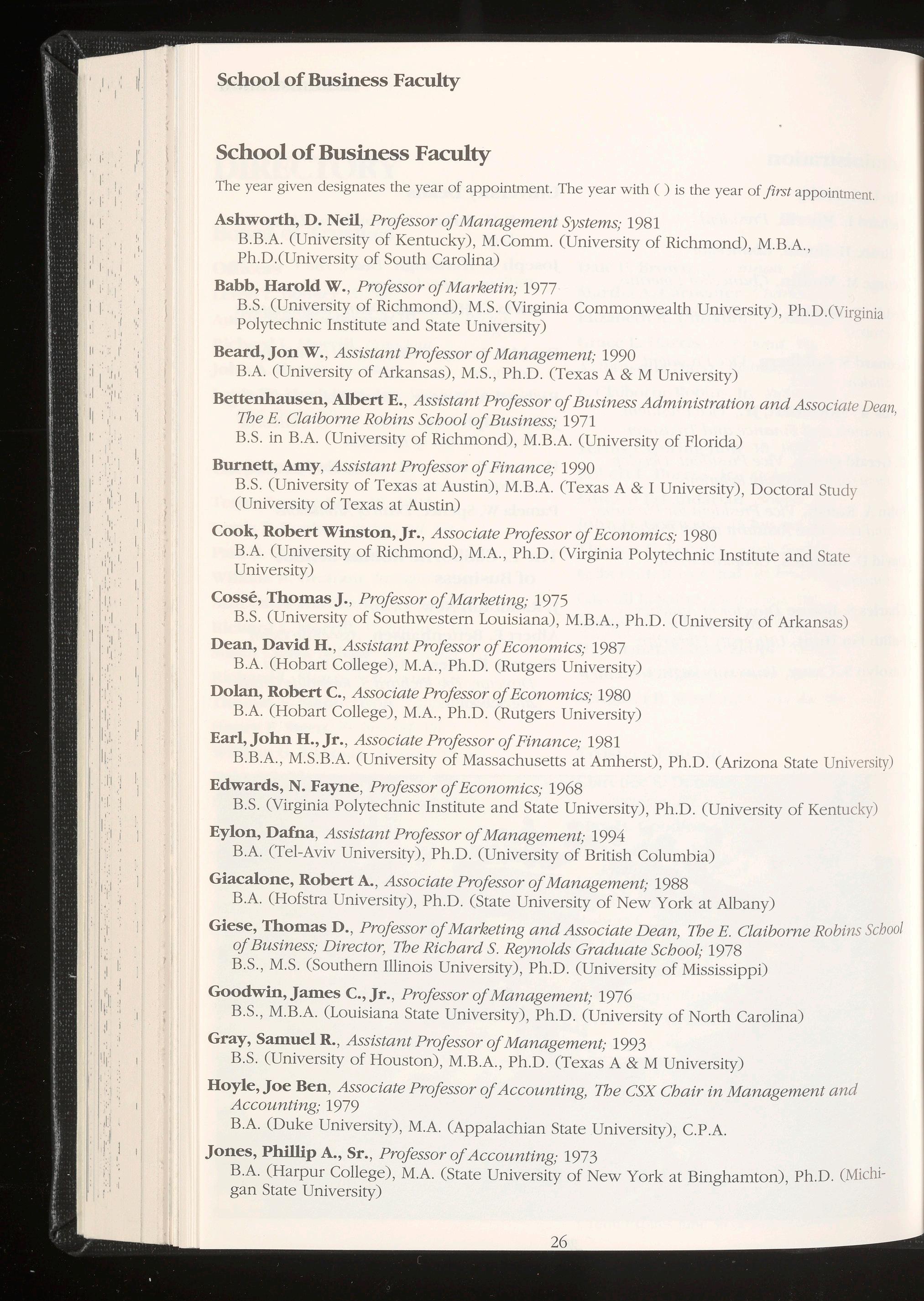 terminal degree, such as the Ph.D., D.B.A., or in certain cases the JD. or a masters degree with professional certification, such as the C.P.A.; have extensive professional experience; and have a demonstrated record of scholarly productivity in the area of competency. The Director of The Richard S. Reynolds Graduate School and the chair of the department must approve each faculty member teaching a course in the department's area.