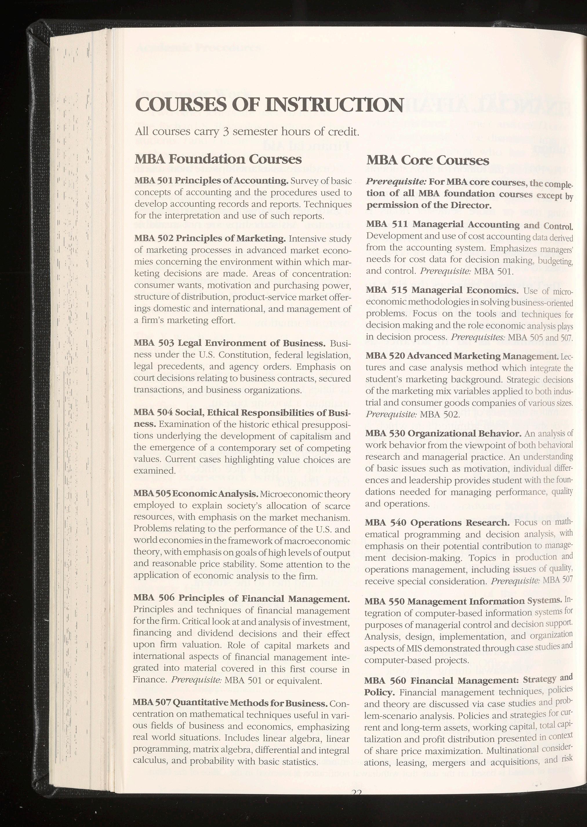 The non -business undergraduate major, and the business major who completed undergraduate courses more than five years priorto enrollment in the MBA program, progress through a series of foundation courses which provide the background to advance to the MBA core sequence. This initial set of intense courses covers all the basic functions of business and also includes the decision-making tools that are applied in most of the core courses.