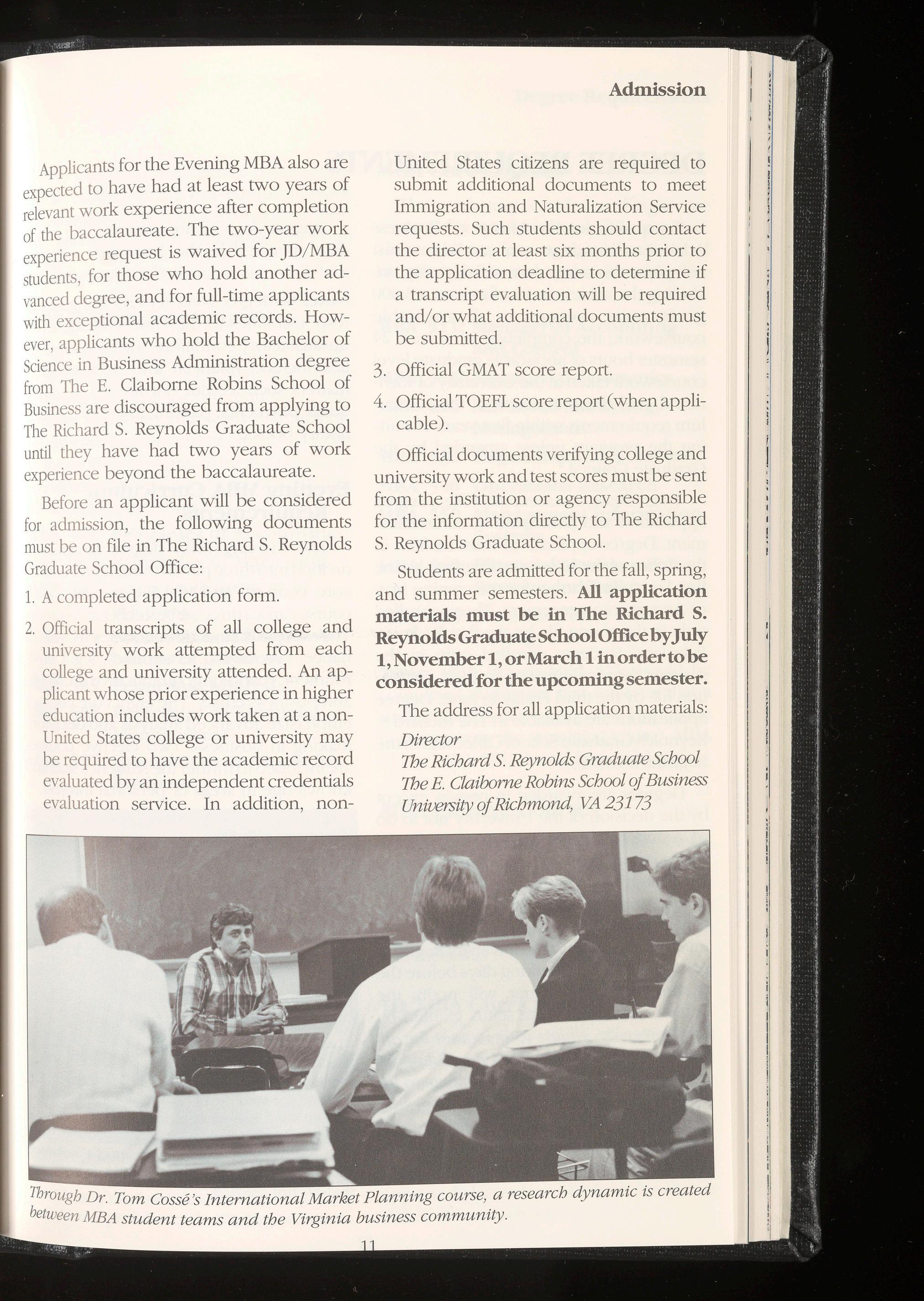 Applicants for the JD/MBA program are required to meet the admission standards of both the Evening MBA program of The Richard S. Reynolds Graduate School (as set forth in this bulletin) and The T.C. Williams School of Law. Applications must be made separately to The Richard S. Reynolds Graduate School and to the School of Law. A bulletin and application form for the School of Law may be obtained from: