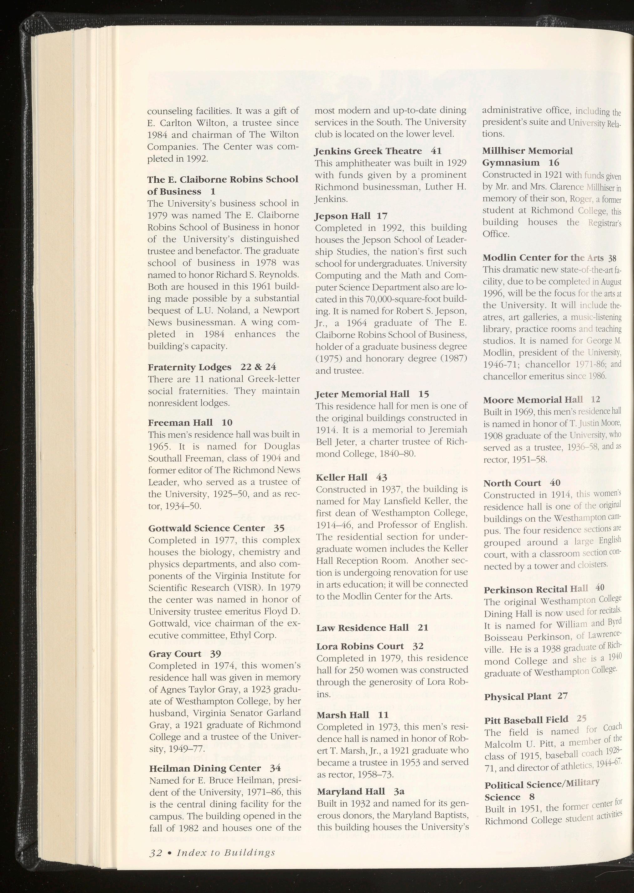 Built in 1959. th is m en's residence hallis Ihe g,I of E Claiborne Robins class of 1931. in memory of hi~ mother, ~h. ha Eli za b eth Robins. The_RichmrndCollege dean 's offices areIn this buildi ng.
