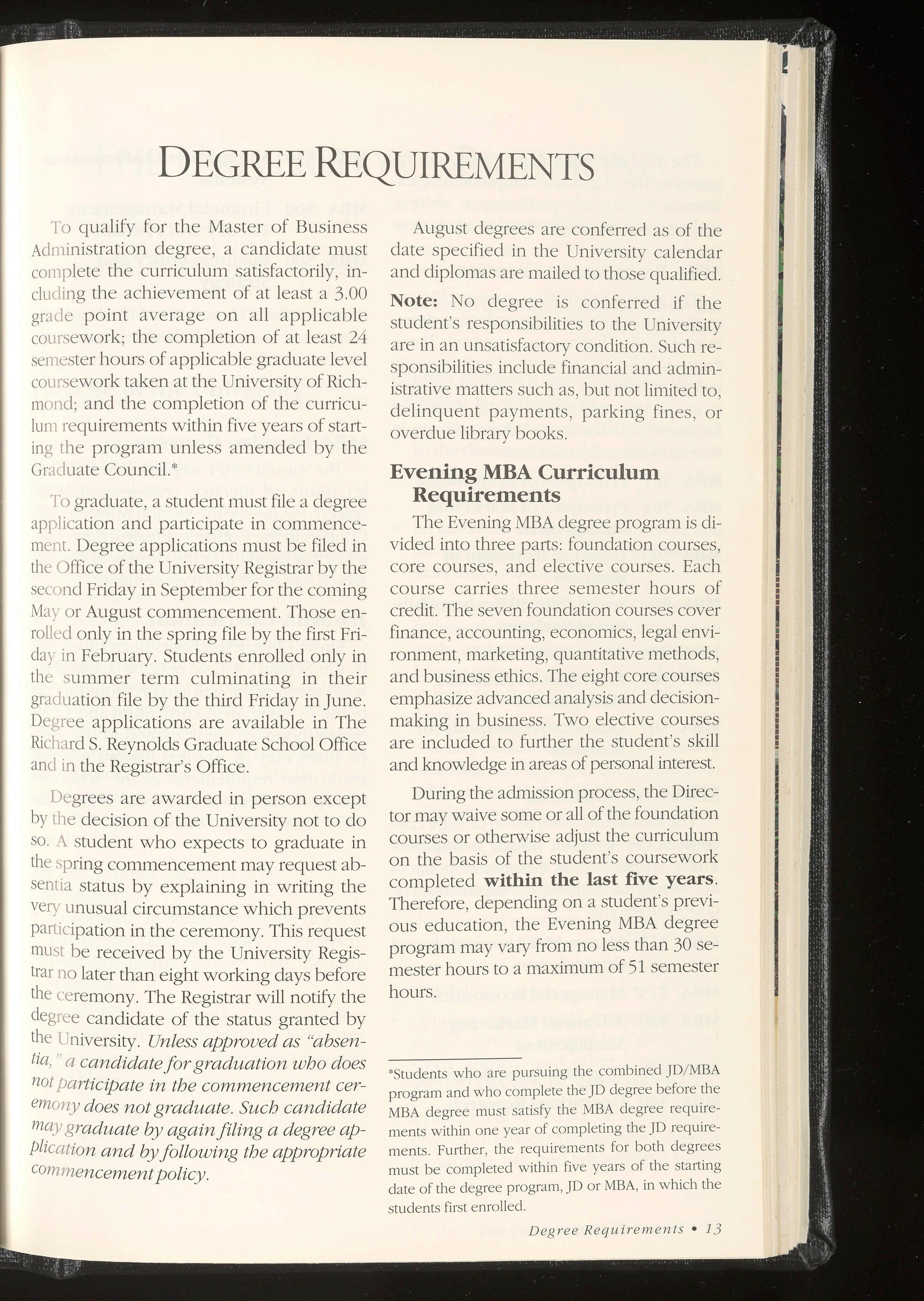 Graduate study in Business Administrationat tf-ieUniversity of Richmond is designed t )r professionals who hold either business o r non-business undergraduate degrees The MBA degree program is a decision-b, sed course of study that provides student: w ith the ability to advance to higherk vels of management in all types of organizations.