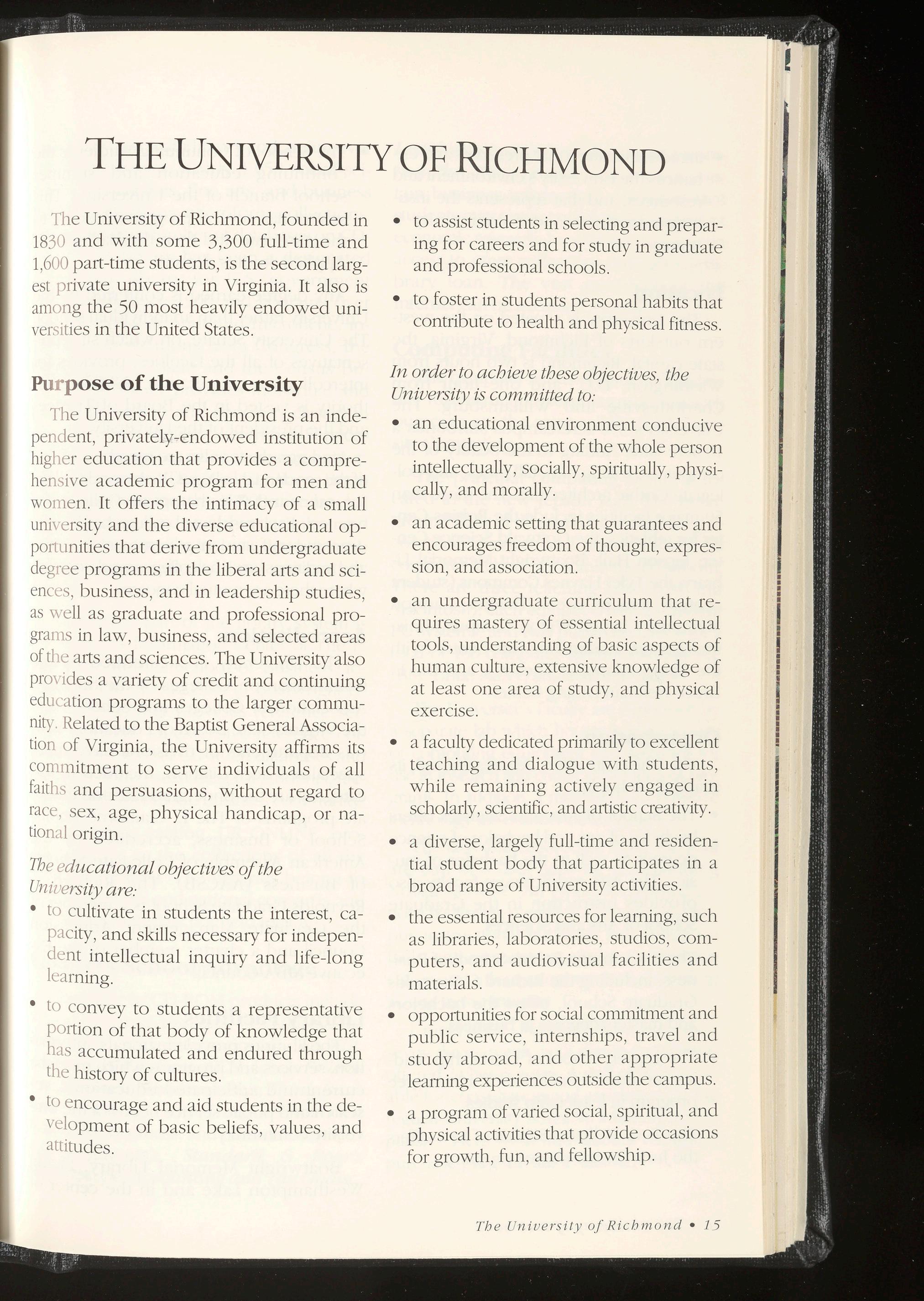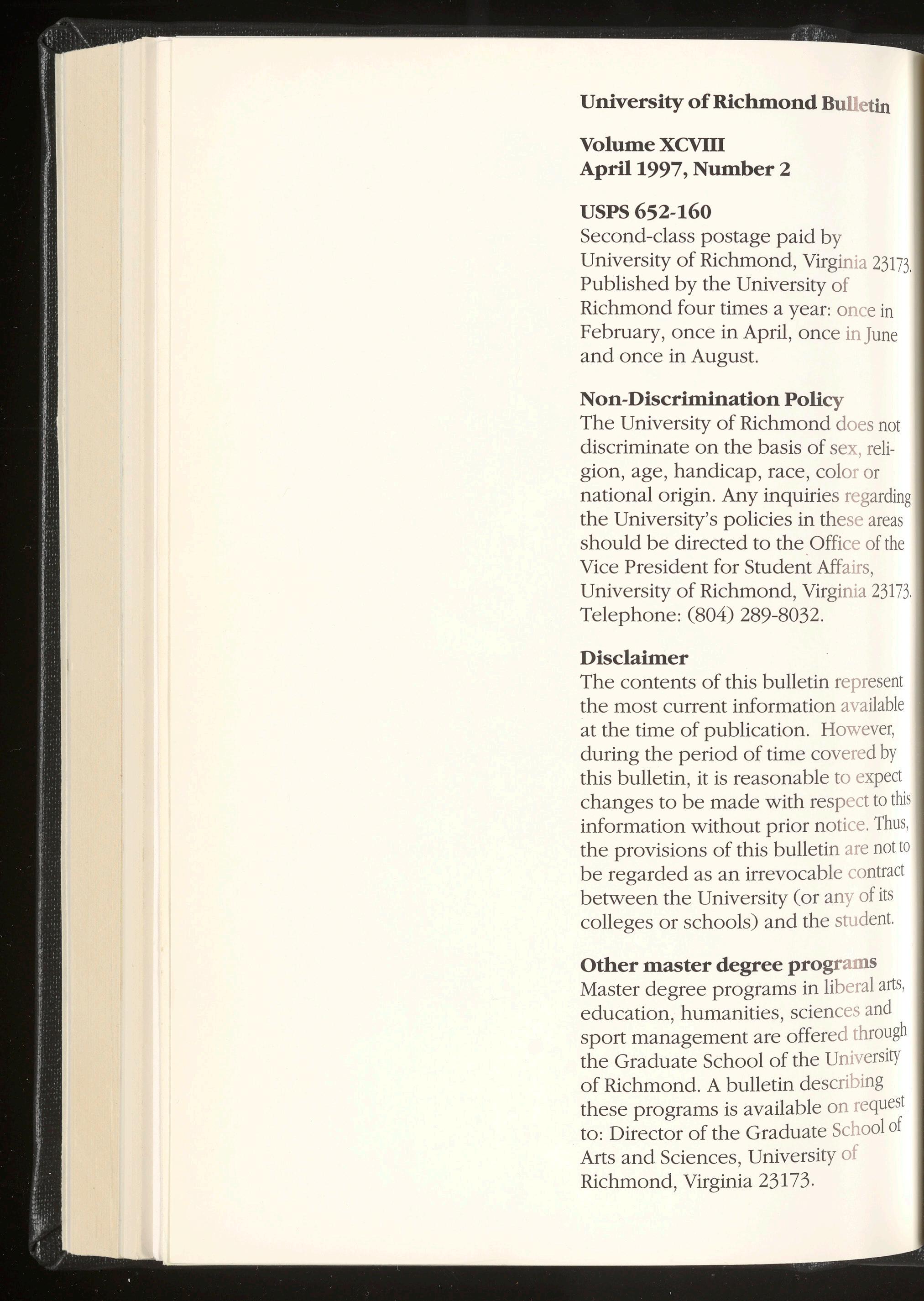The University of Richmond d oe s not discriminate on the basis of sex, religion, age , handicap, race, c ol or or national origin Any inquiri es regarding the University ' s policies in th e se areas should be directed to the O ffice of the Vice President for Student Affairs, University of Richmond, Virg in ia 23173. Telephone : (804) 289-8032
