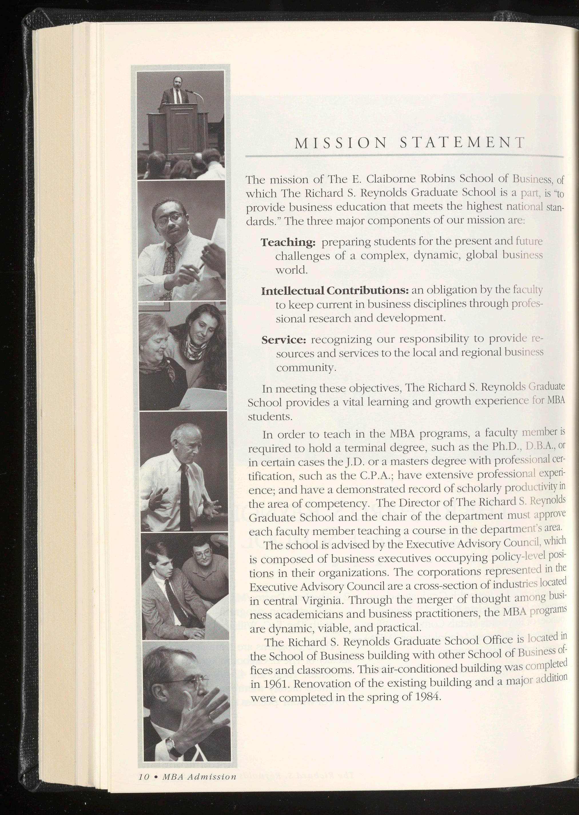 Th e mi ss io n o f Th e E. Cla ibo rn e Rob in s Sch oo l of Bu siness, of w hi ch Th e Ric h a rd S. Reyn o ld s Gra du ate Sch oo l is a part, is '·to p ro v ide bu sin ess e du ca tio n th a t m ee ts th e hi g h est nat ional standa rds ." Th e thr ee ma jor co m po n ents of o ur m iss ion are: